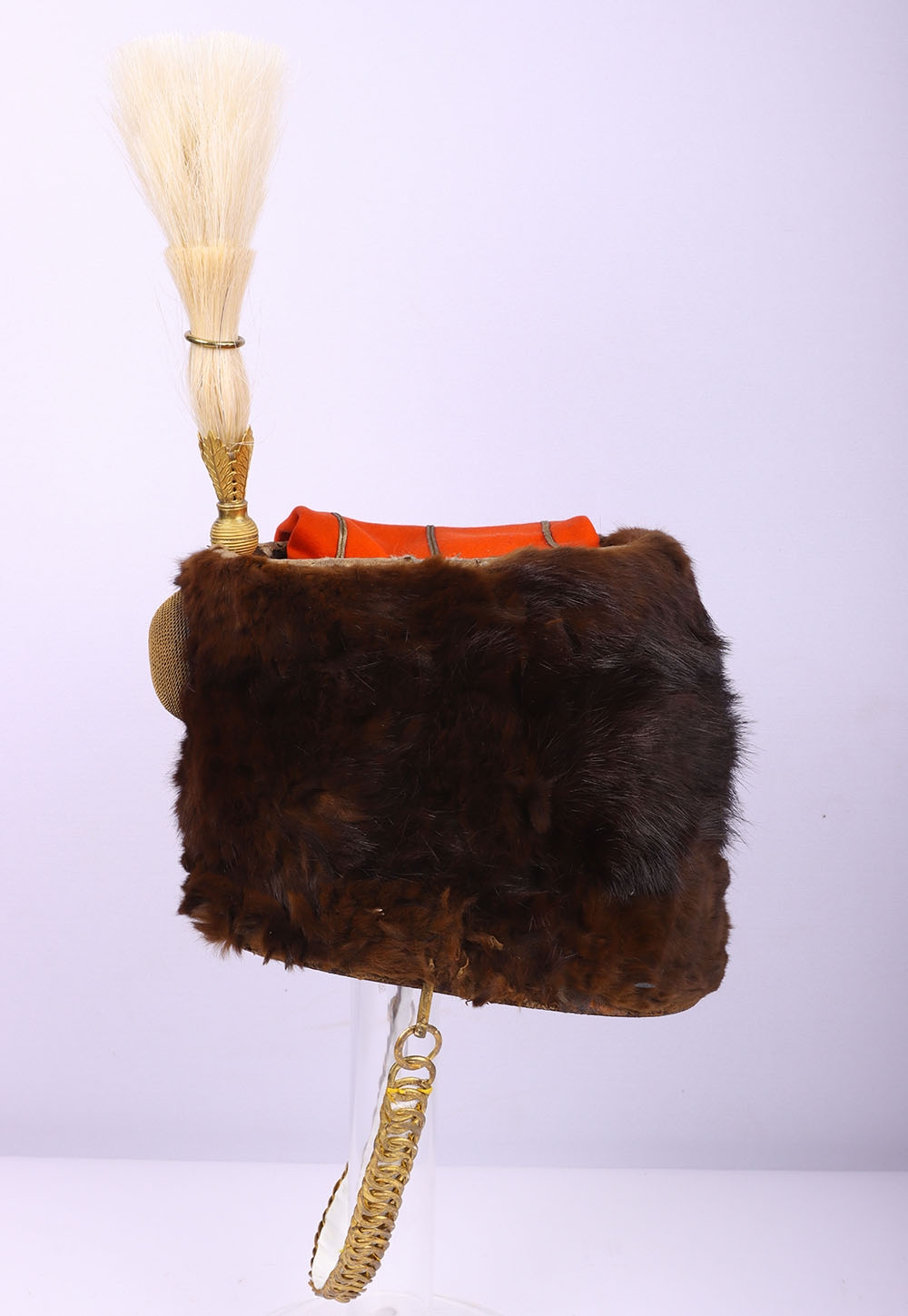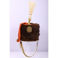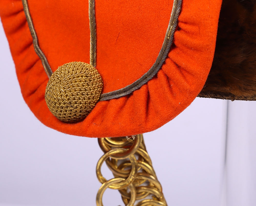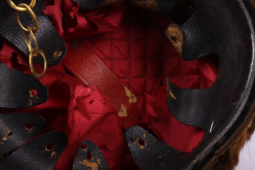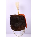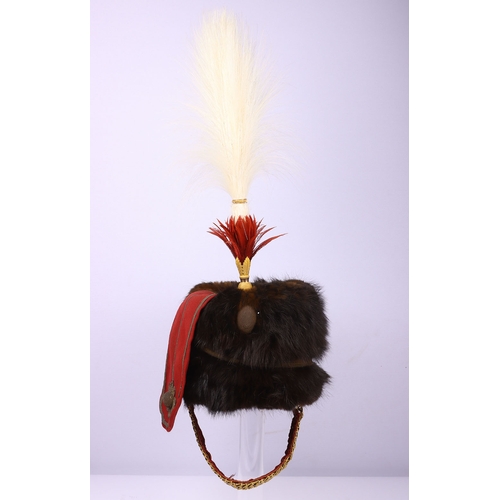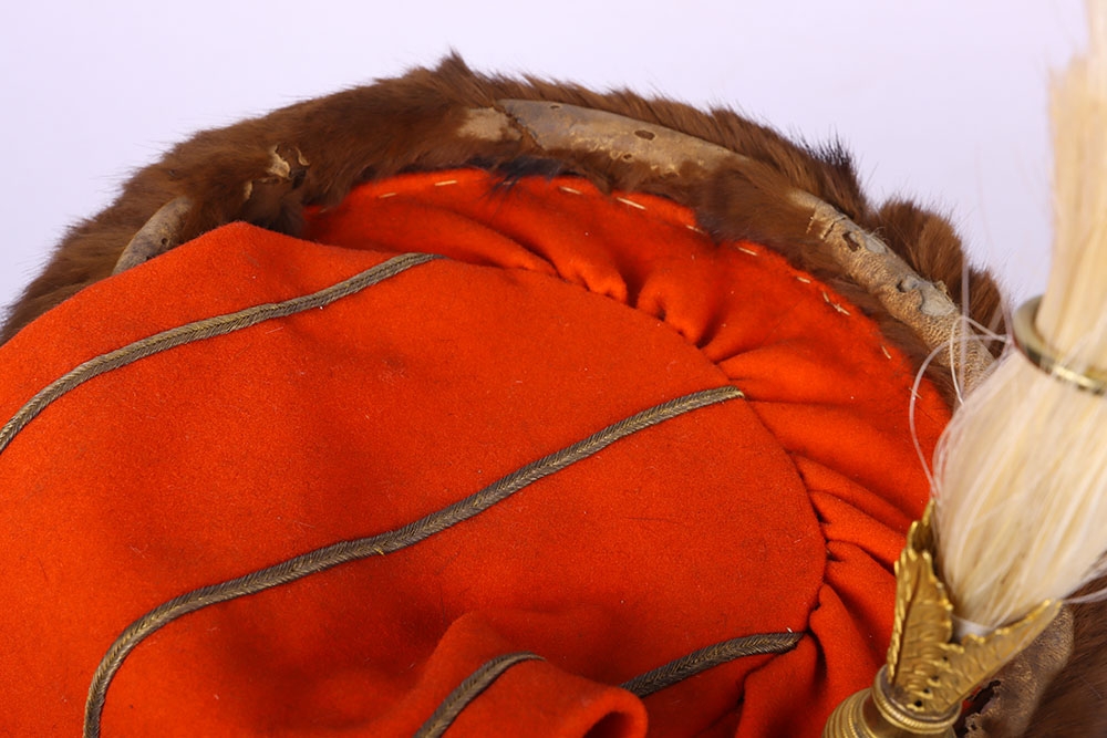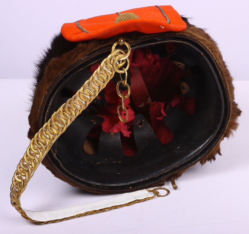 Victorian 7th Hussars Full Dress Busby, good fur officers busby with scarlet bag having gilt cord braid. Knotted cord boss to the front. Complete with the original chin chain. Gilt metal plume socket with white plume. Interior with black leather liner and red cloth lining. Shows service wear and with some fur loss. No cap lines.