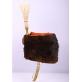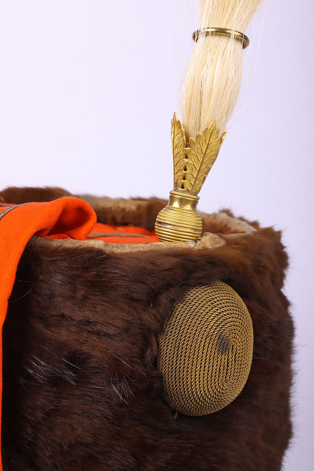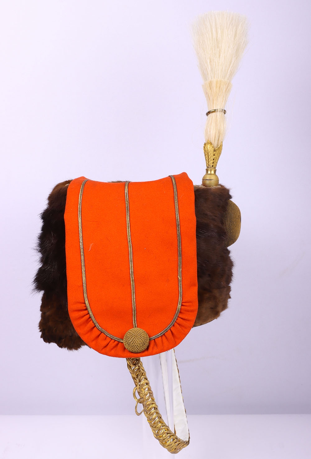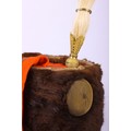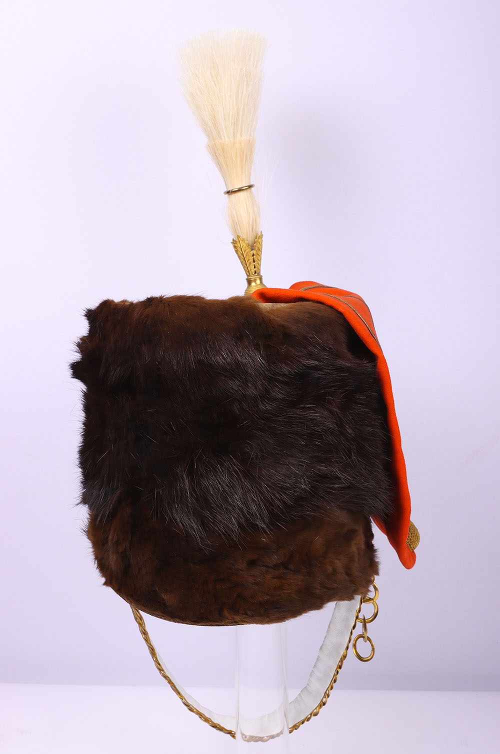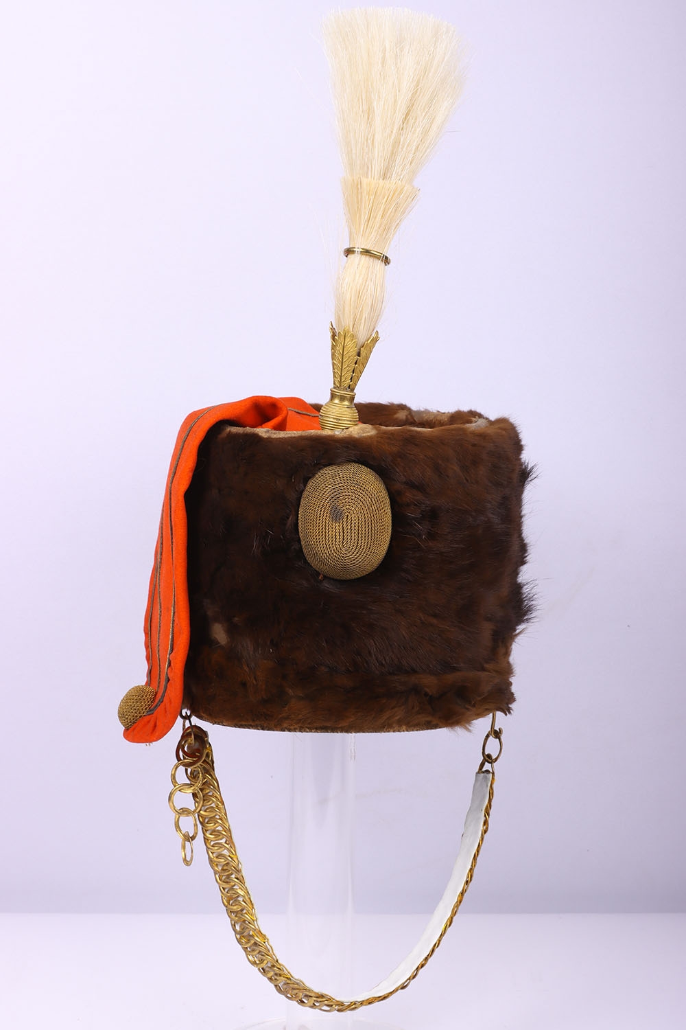 Victorian 7th Hussars Full Dress Busby, good fur officers busby with scarlet bag having gilt cord braid. Knotted cord boss to the front. Complete with the original chin chain. Gilt metal plume socket with white plume. Interior with black leather liner and red cloth lining. Shows service wear and with some fur loss. No cap lines.