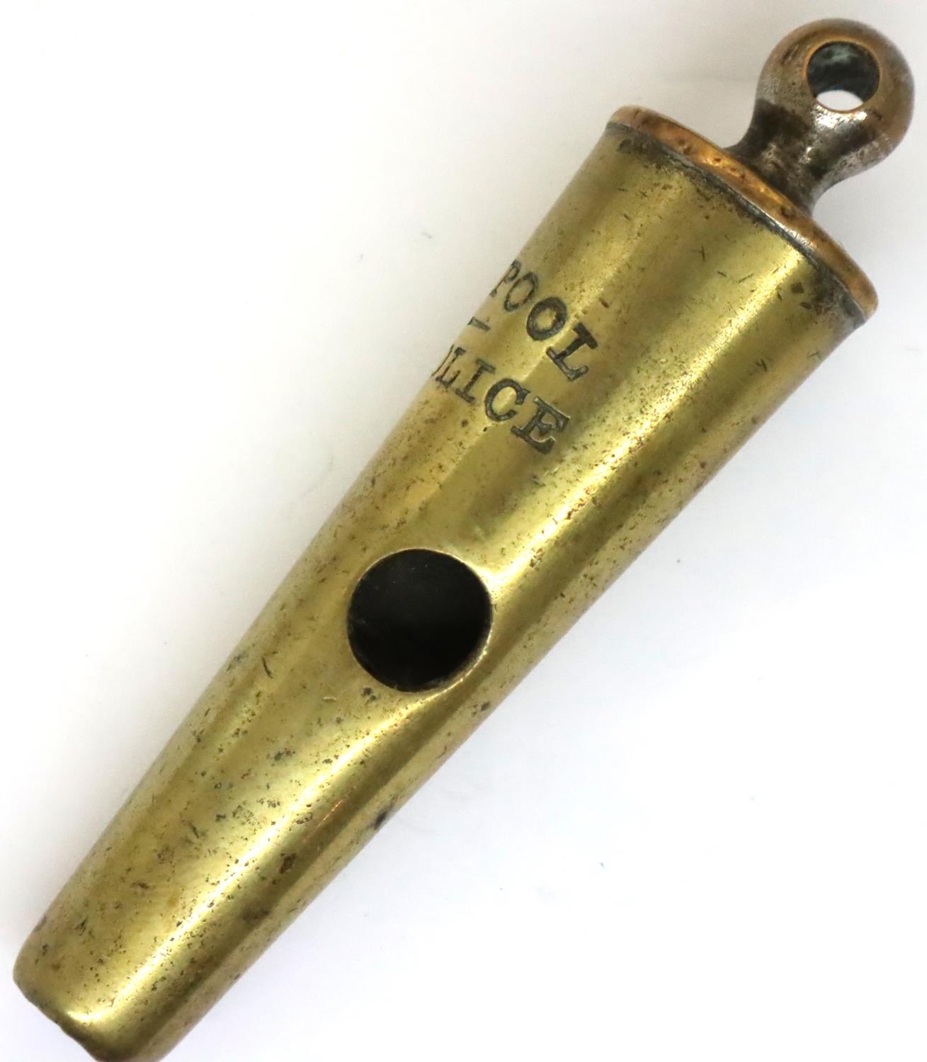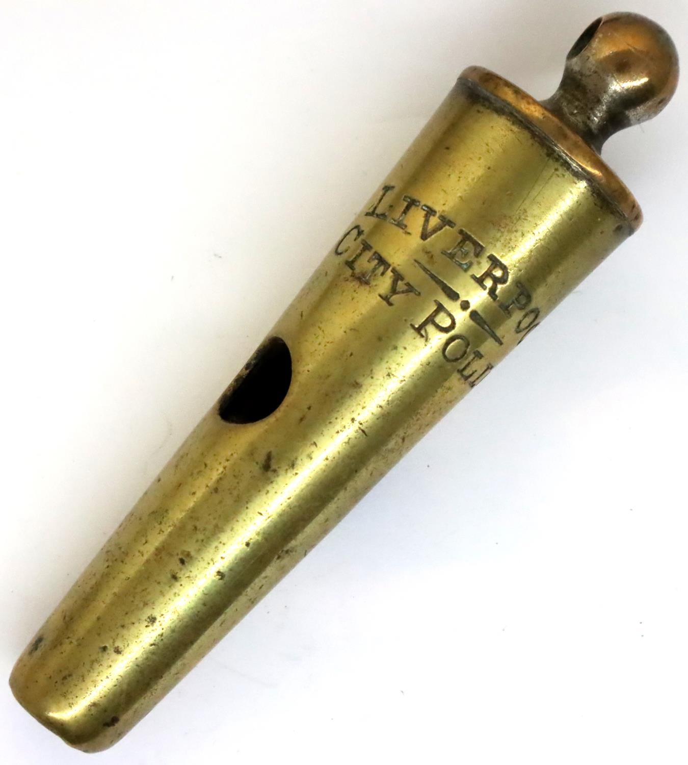 Victorian brass Beaufort whistle marked for Liverpool city police. P&P Group 1 (£14+VAT for the first lot and £1+VAT for subsequent lots)