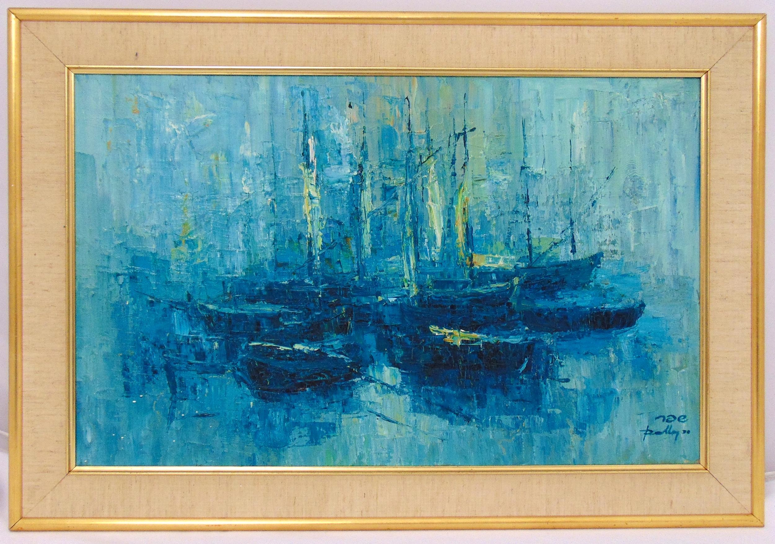 Rolly Schaffer framed mid century oil on canvas of sailing boats, signed bottom right, 37 x 59.5cm
