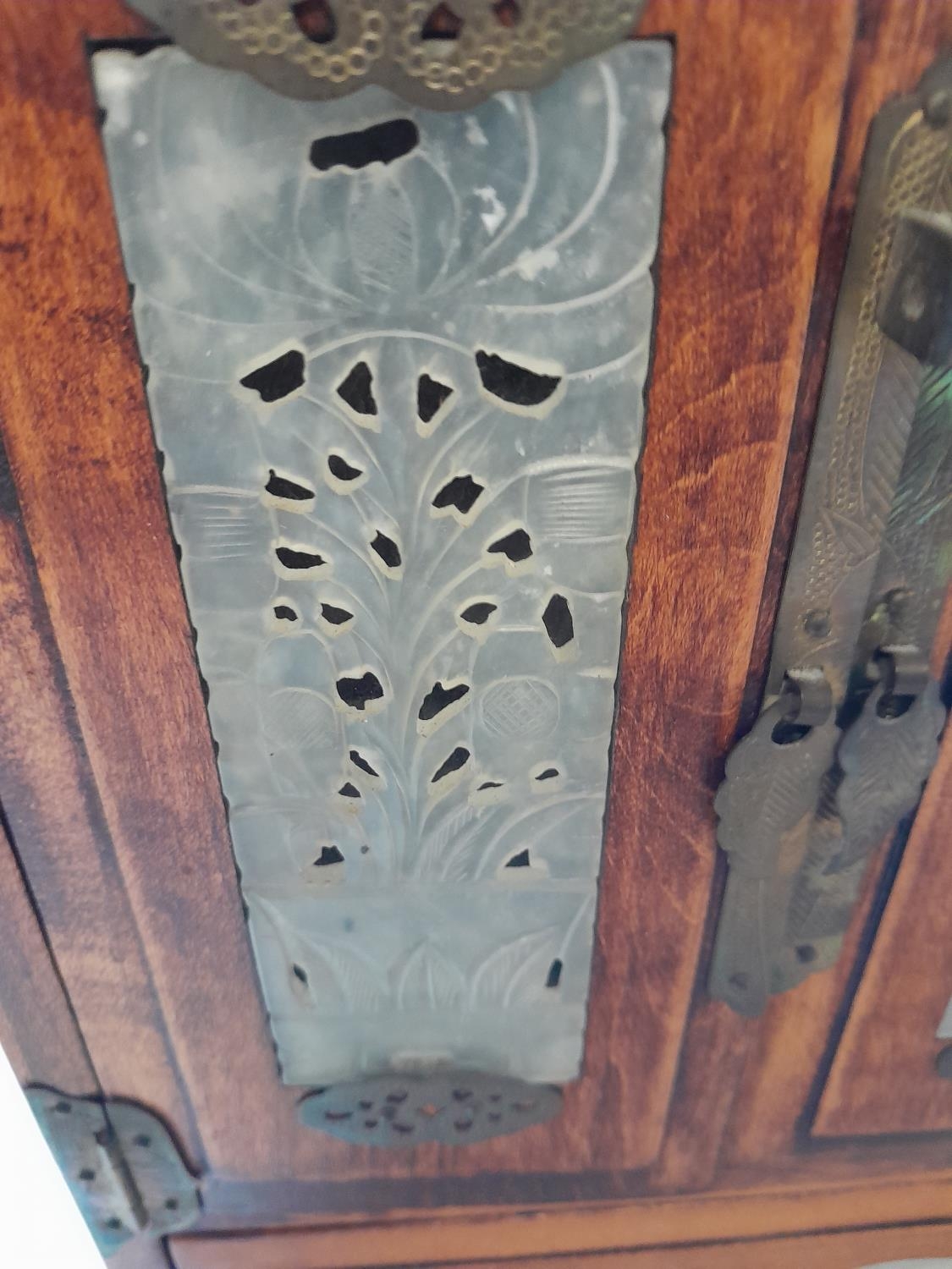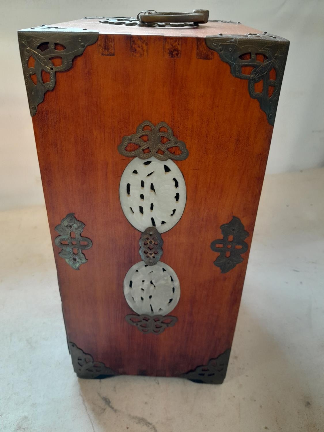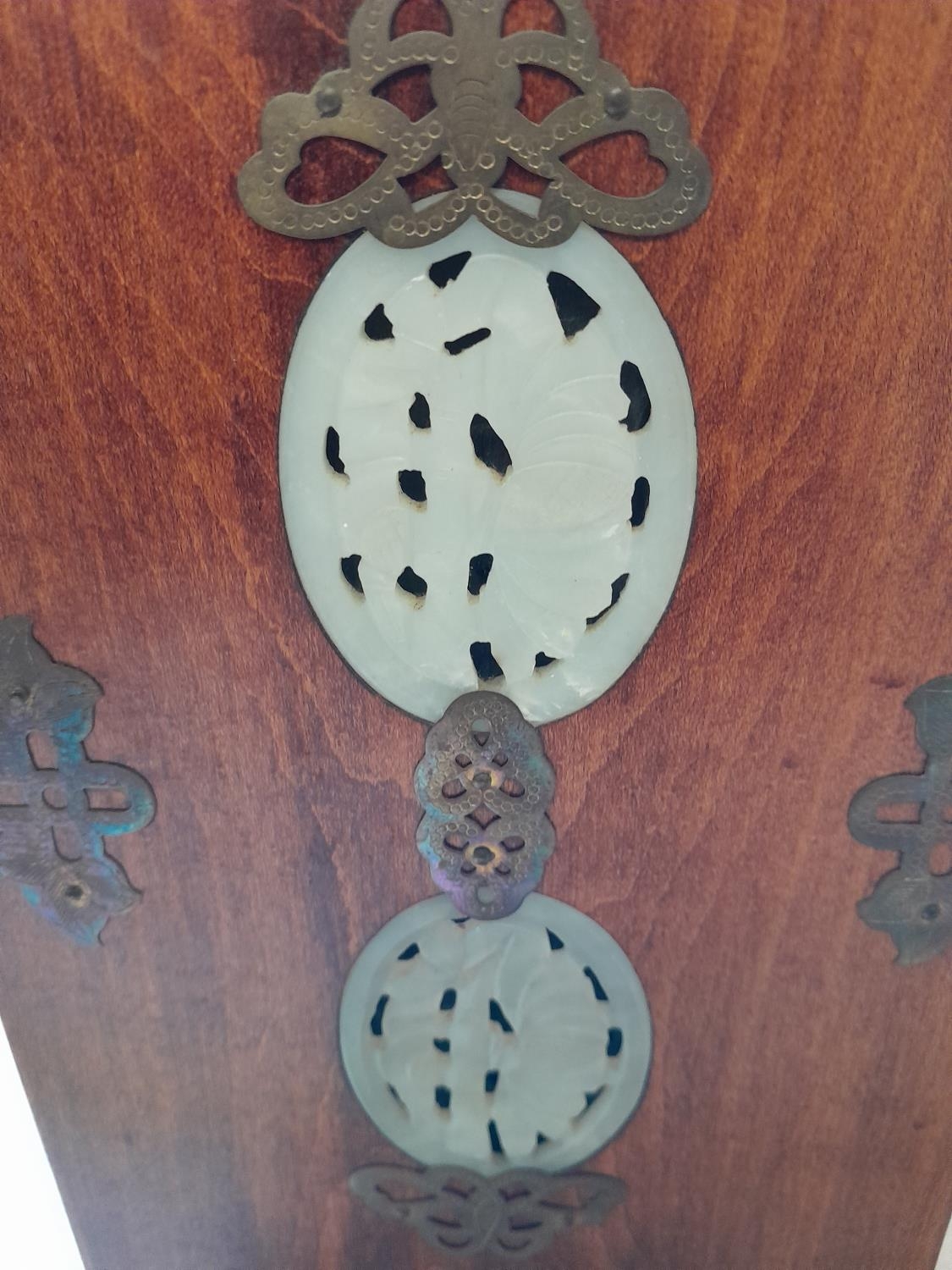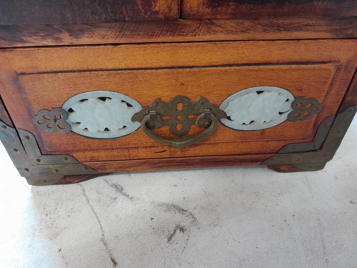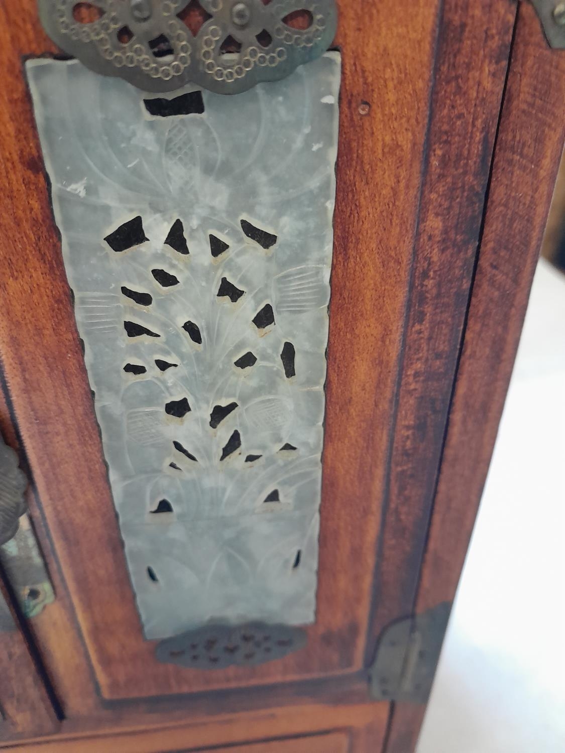 Well made late 19th / early 20th century Chinese hardwood fully fitted table top cabinet inset with mutton fat jade coloured stone panels 15 cms x 21 cms x 32 cms