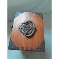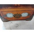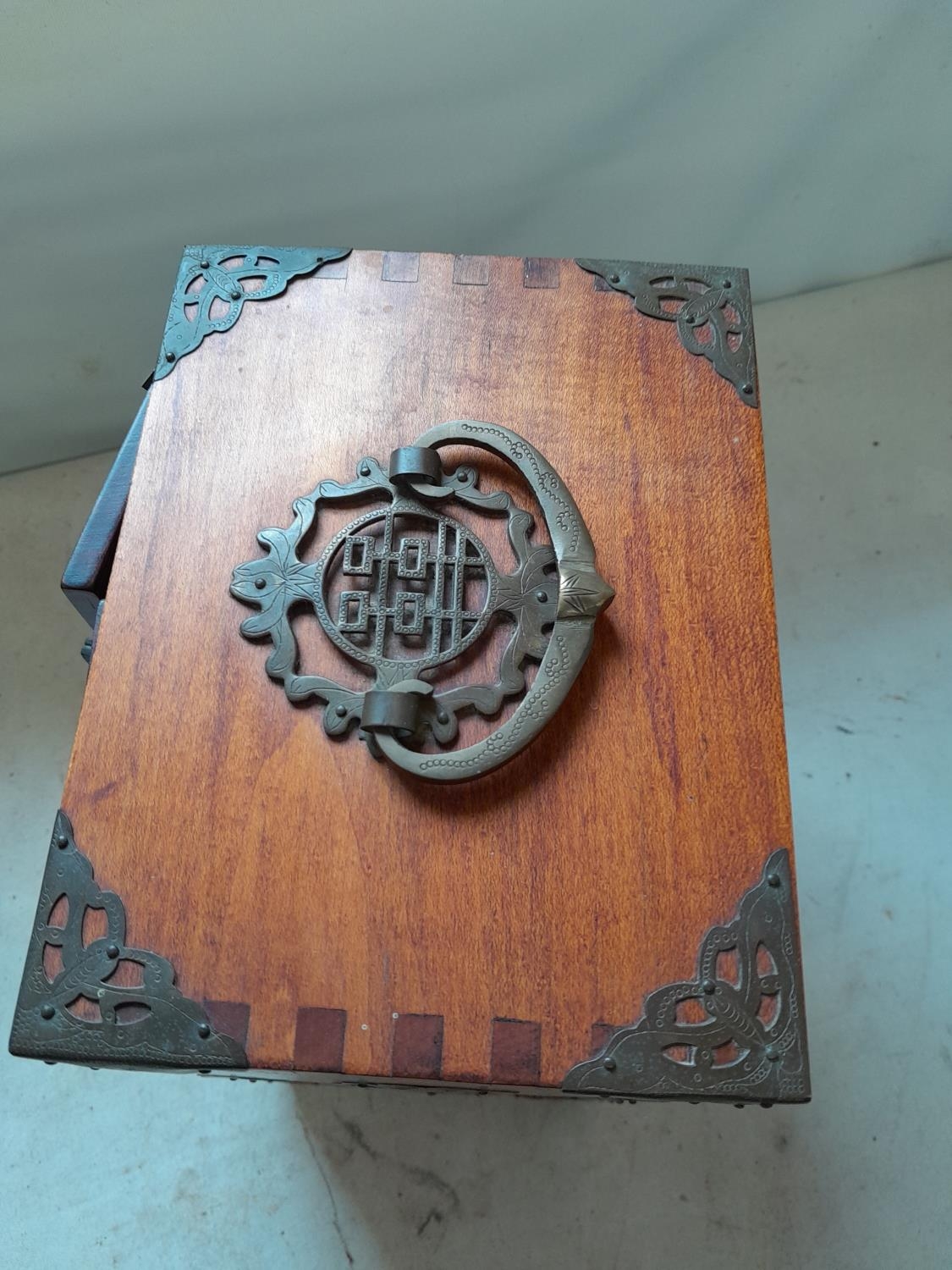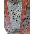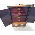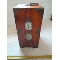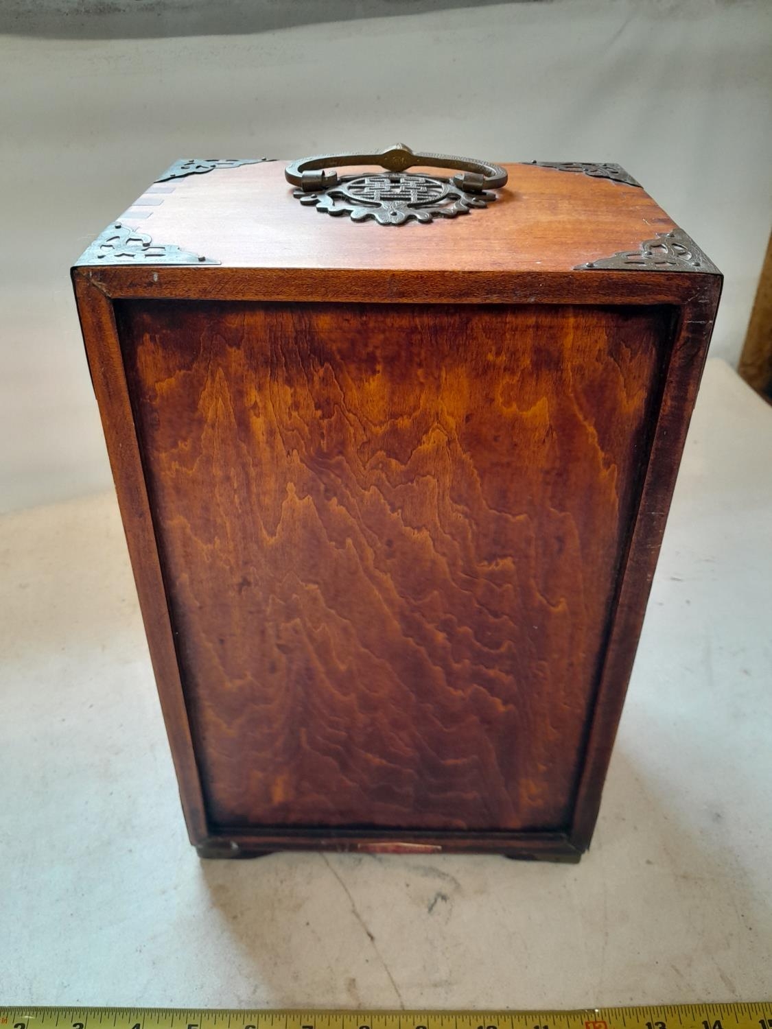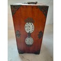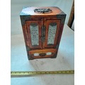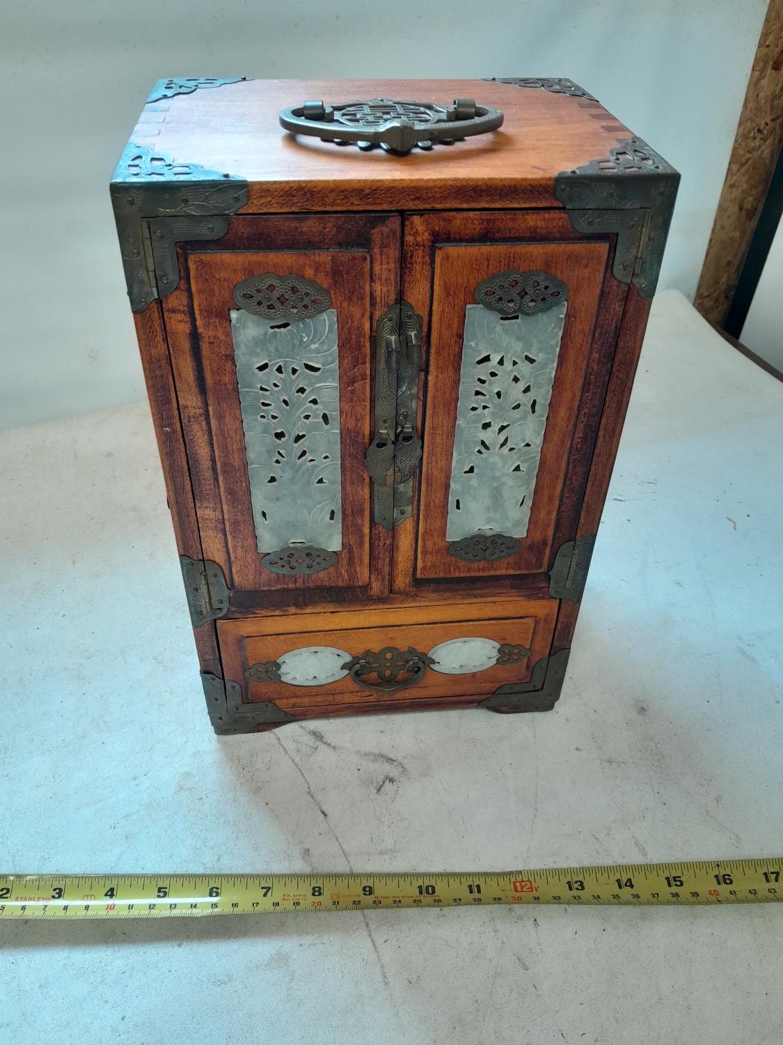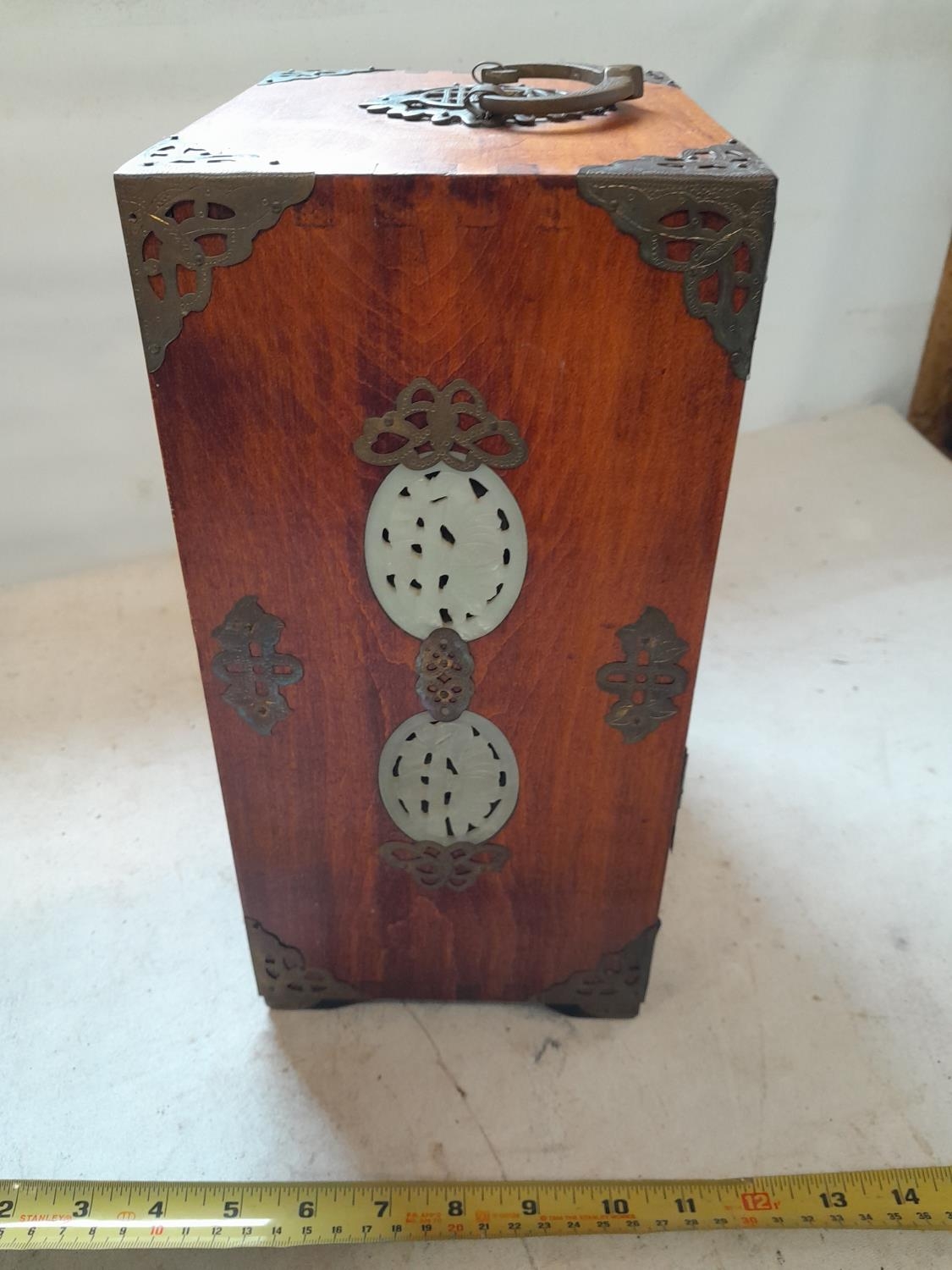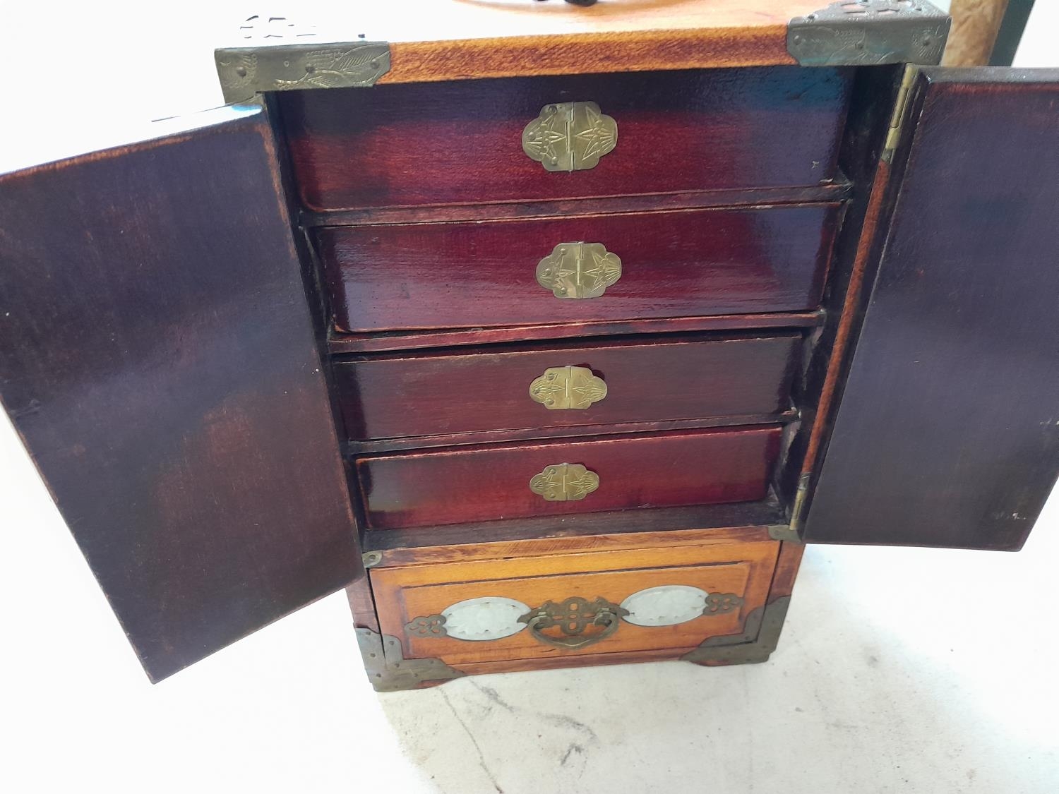 Well made late 19th / early 20th century Chinese hardwood fully fitted table top cabinet inset with mutton fat jade coloured stone panels 15 cms x 21 cms x 32 cms