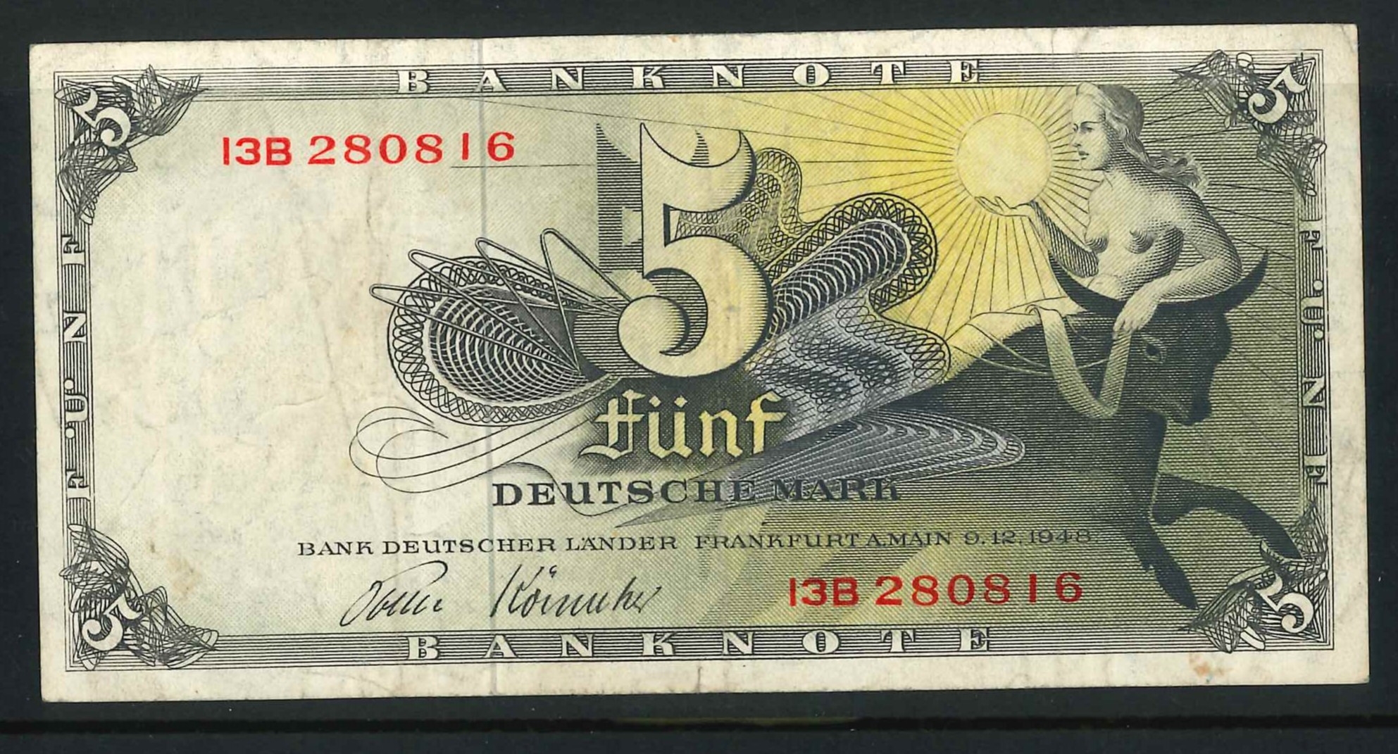Banknotes; Germny; West Germany; 1948 5m with serial prefix 13B, F+. Krause 13i.
