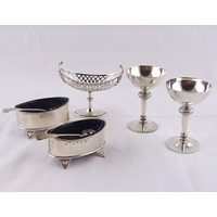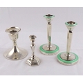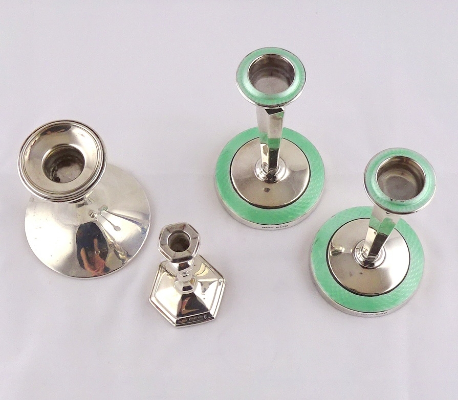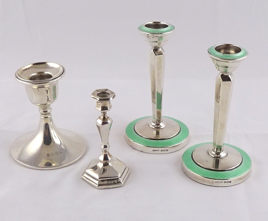 A pair of Art Deco influence dressing table candlesticks, silver and enamel, Birmingham 1937, 130mm tall; a single candlestick and a miniature candlestick (4) (by instruction of the family of Dame Fanny Waterman)