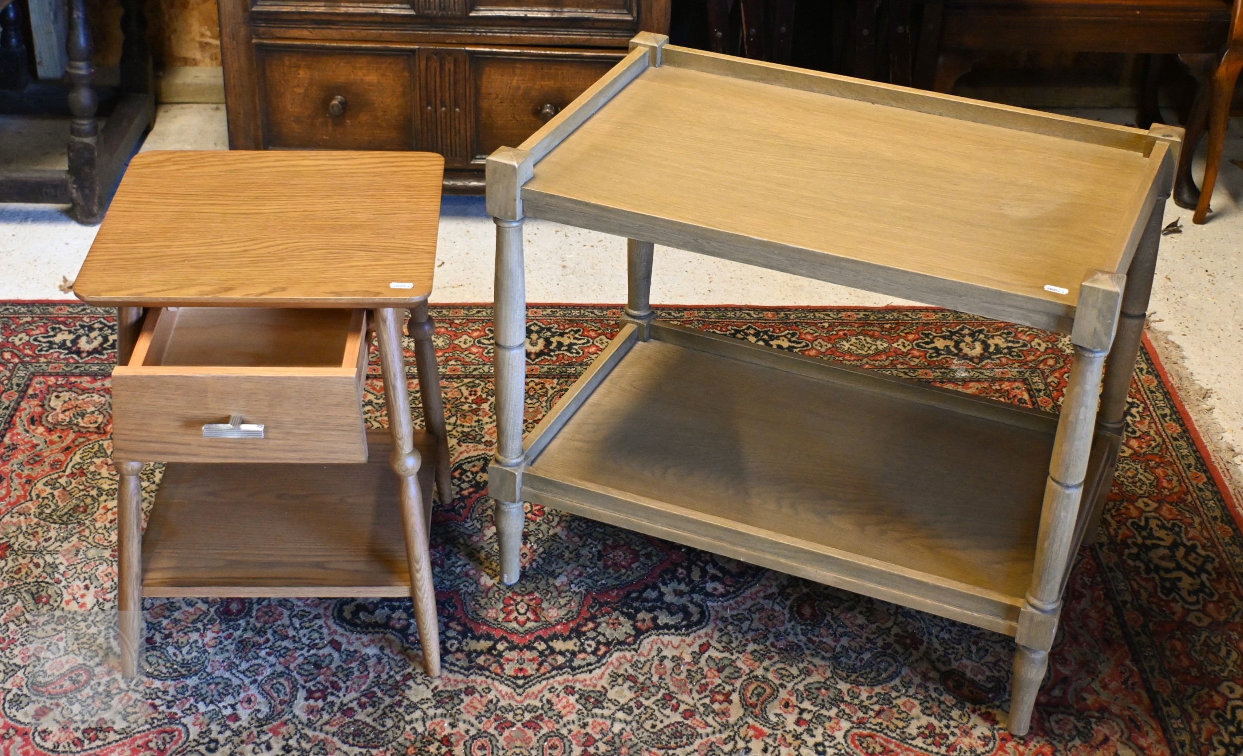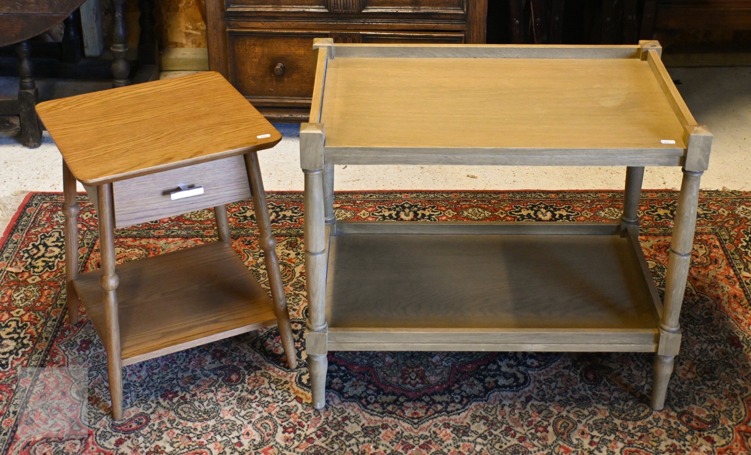 A modern stained two-tier side table with turned supports, 70 x 46 x 60 cm high, to/w a two-tier lamp table with single drawer (2)