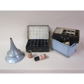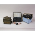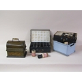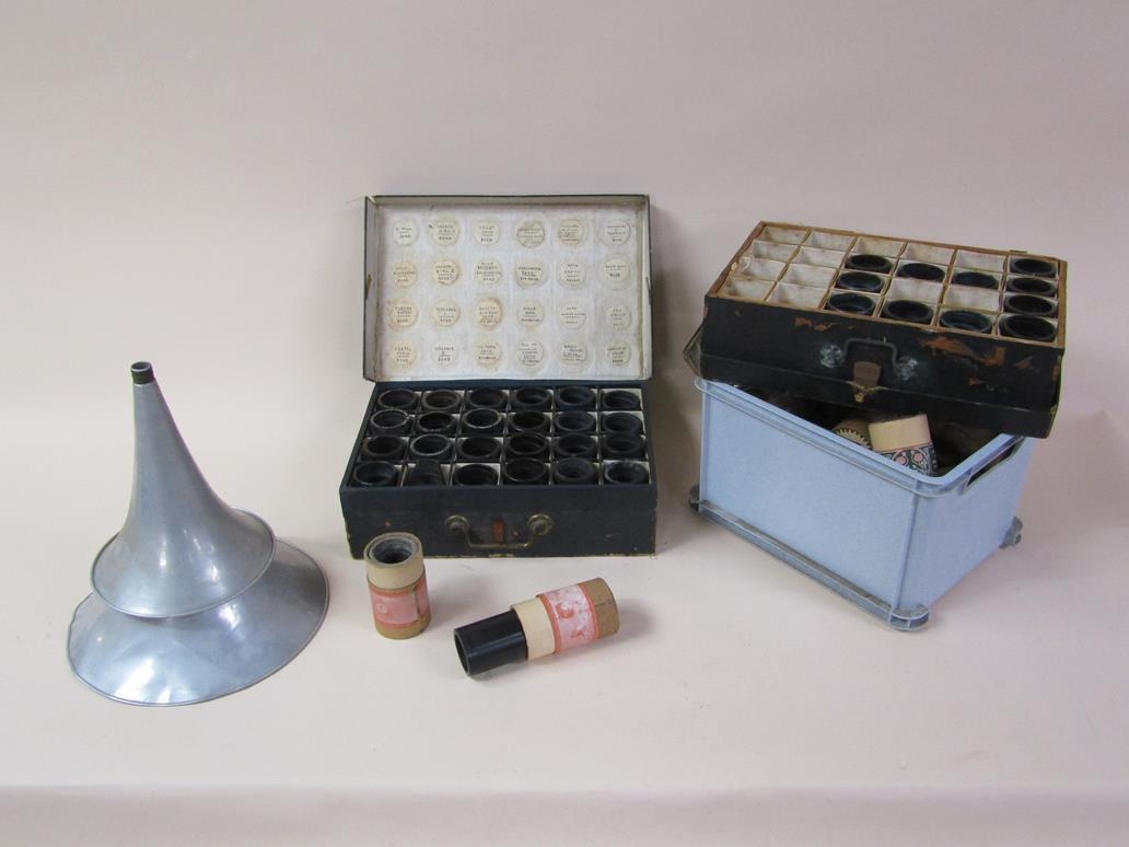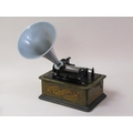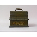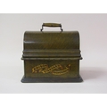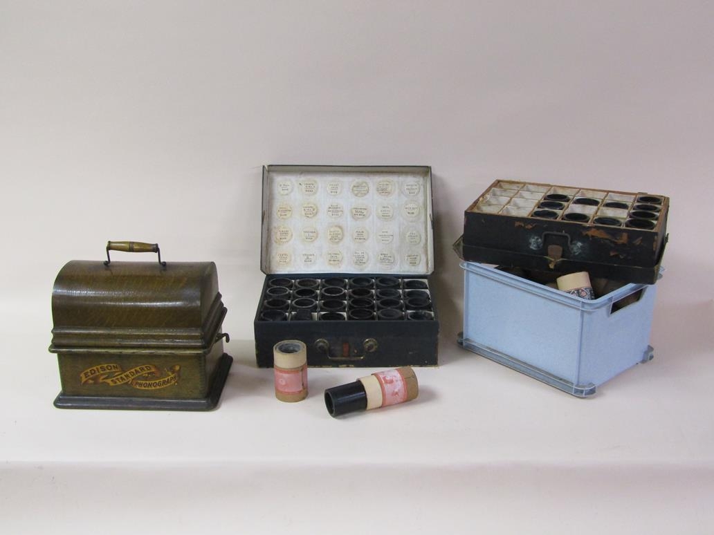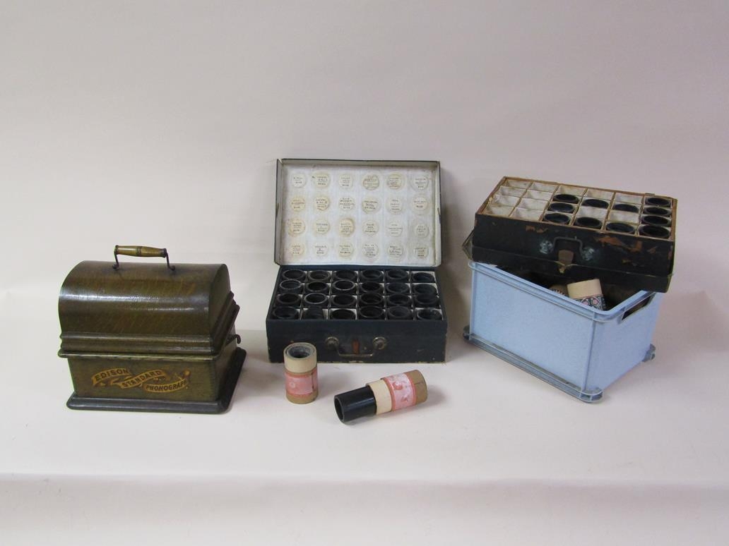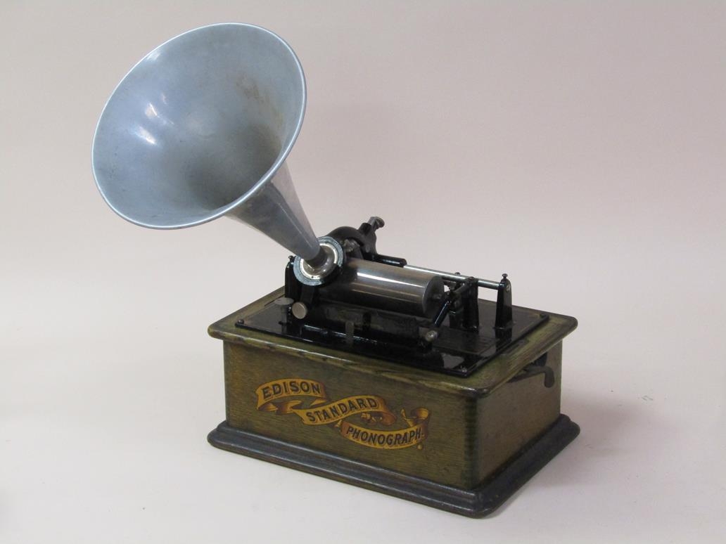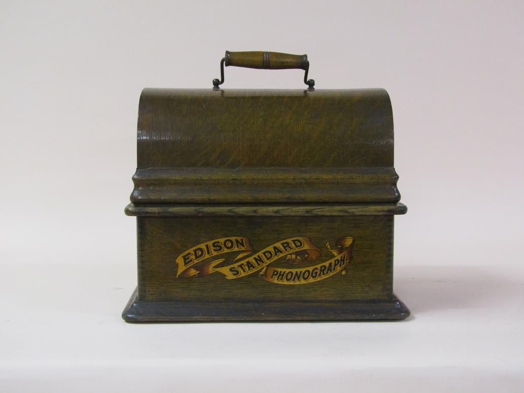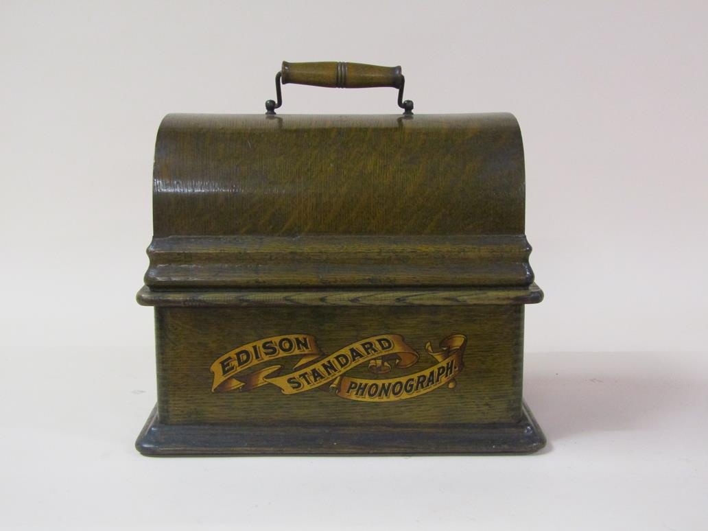 An early 20c Edison standard Phonograph, serial no.8182424 in oak case with barrel shaped lid and together with two aluminium horns. The phonograph is complete with a collection of eighty three music rolls. The case is 31cm l.