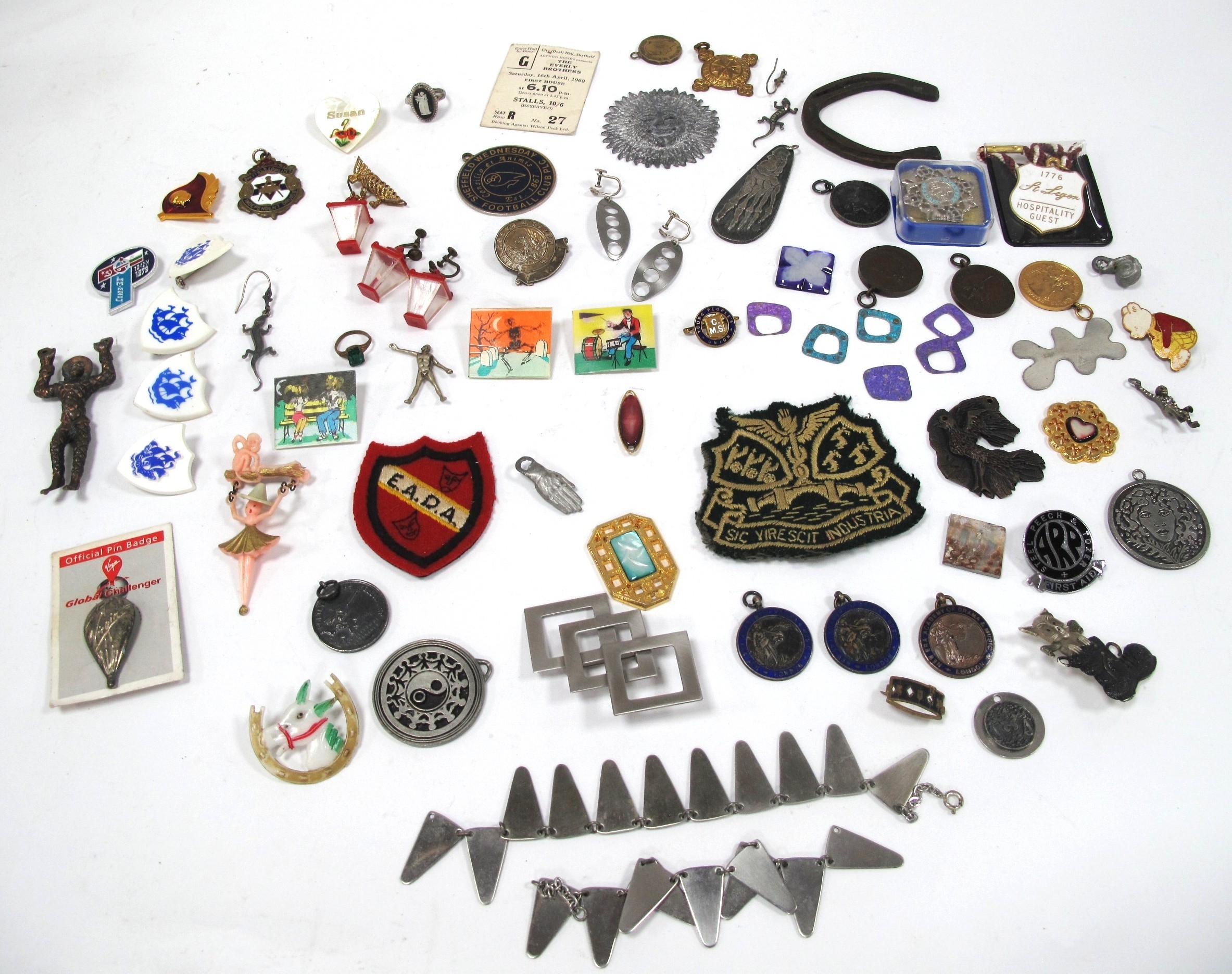 Badges - St. Leger, Blue Peter, Virgin etc, medals - drama, druids, stainless steel jewellery, etc:- One Tray.