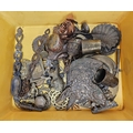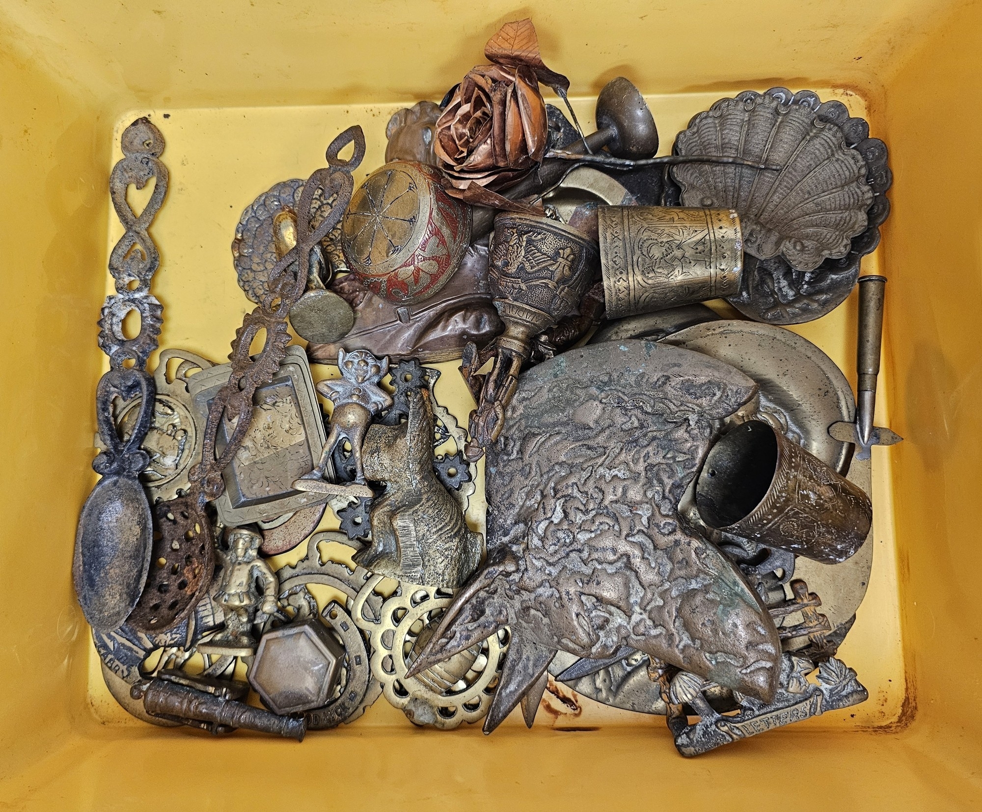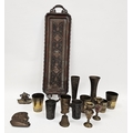 Collection of metalware including Indian brass inlaid goblets, tray and vases, Kashmir white metal inlaid beakers, 19th century brass inkwell in the form of a twin handled urn on stand, brass and copper wall plaques, brass horse brasses and other items