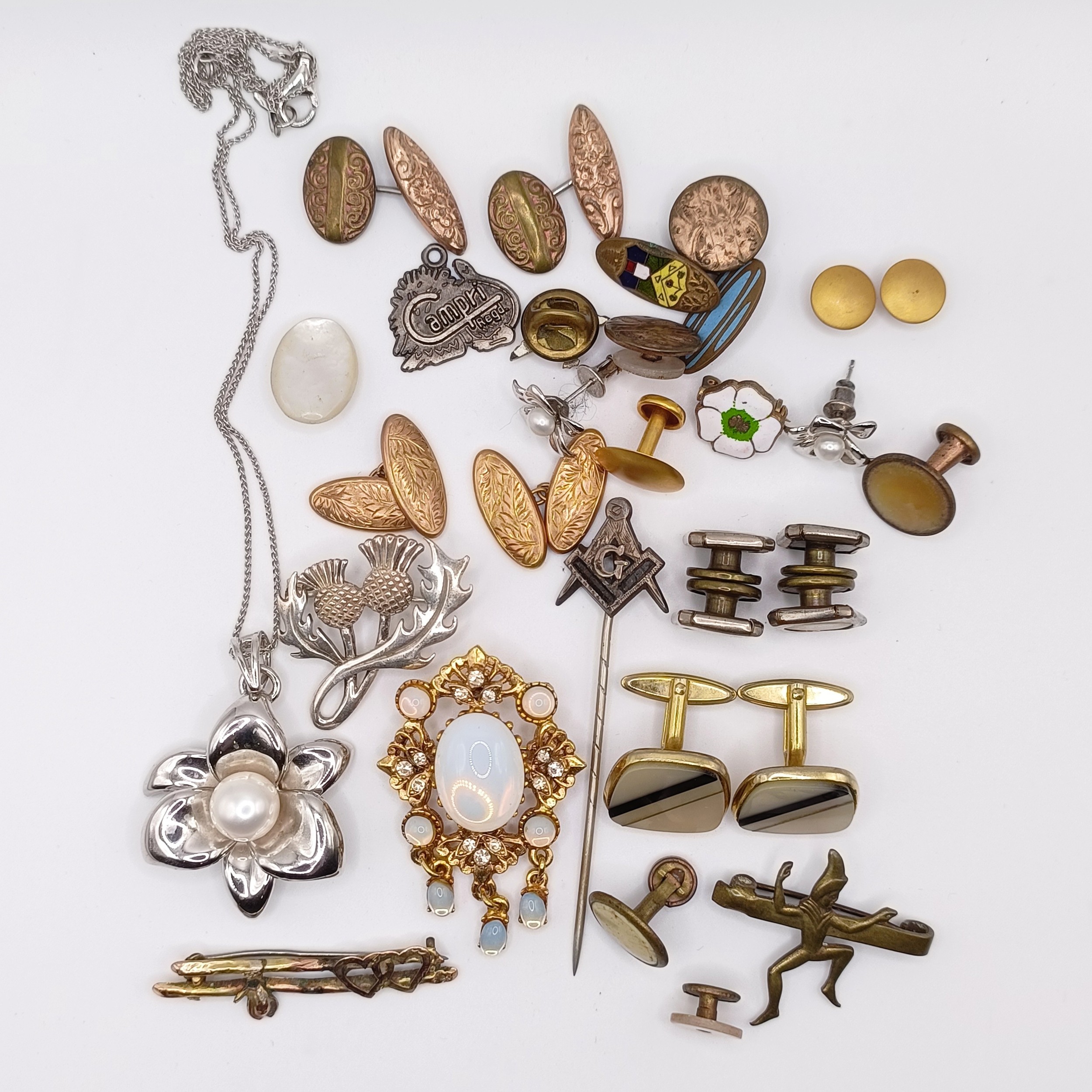 A pair of 9ct gold cufflinks, 2.1 g, a masonic pin, and assorted costume jewellery