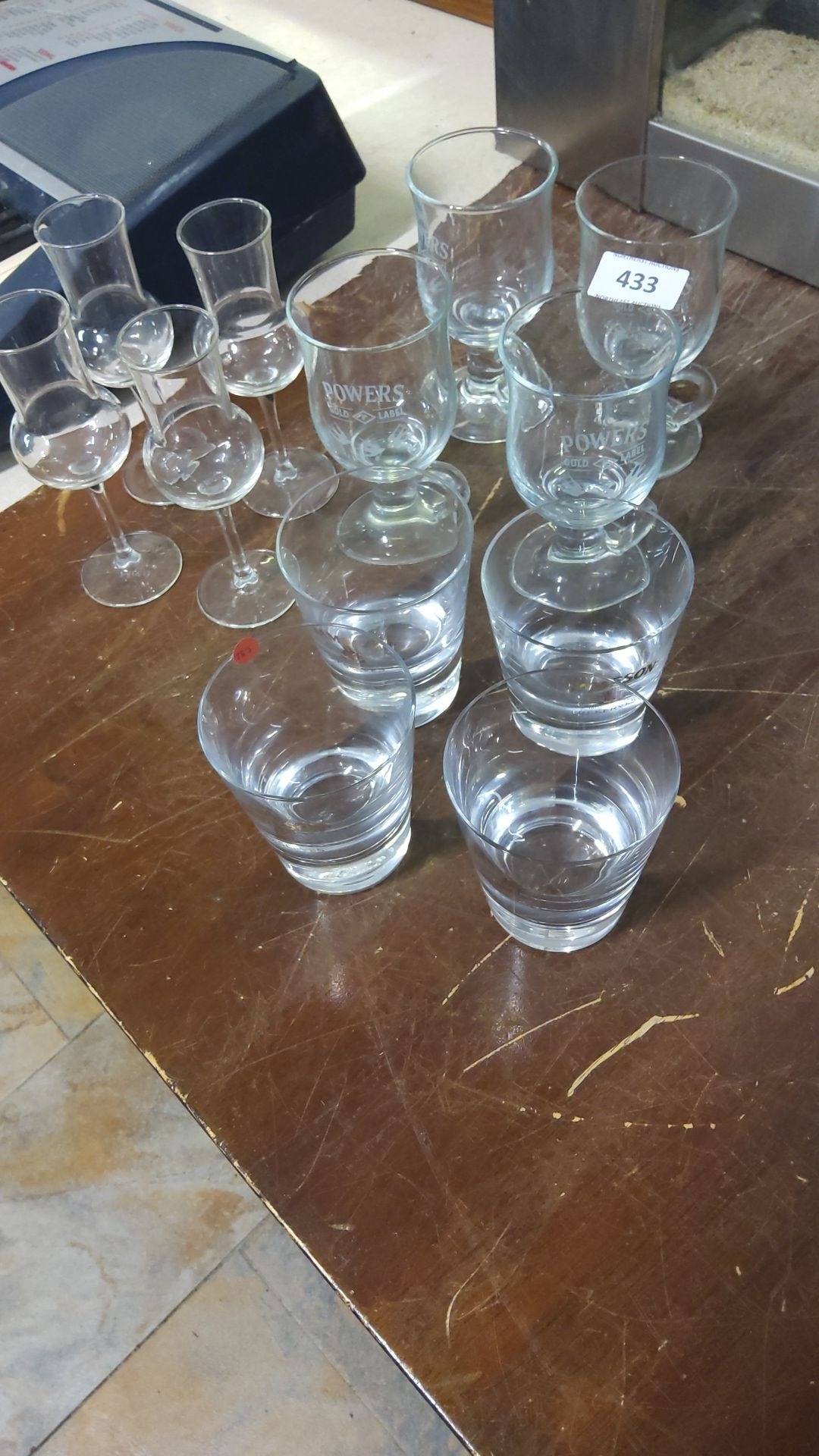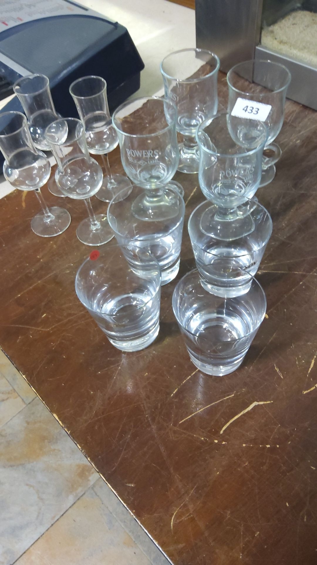 Set of branded assorted drinking glasses, including branded Powers Gold Label glasses.