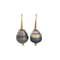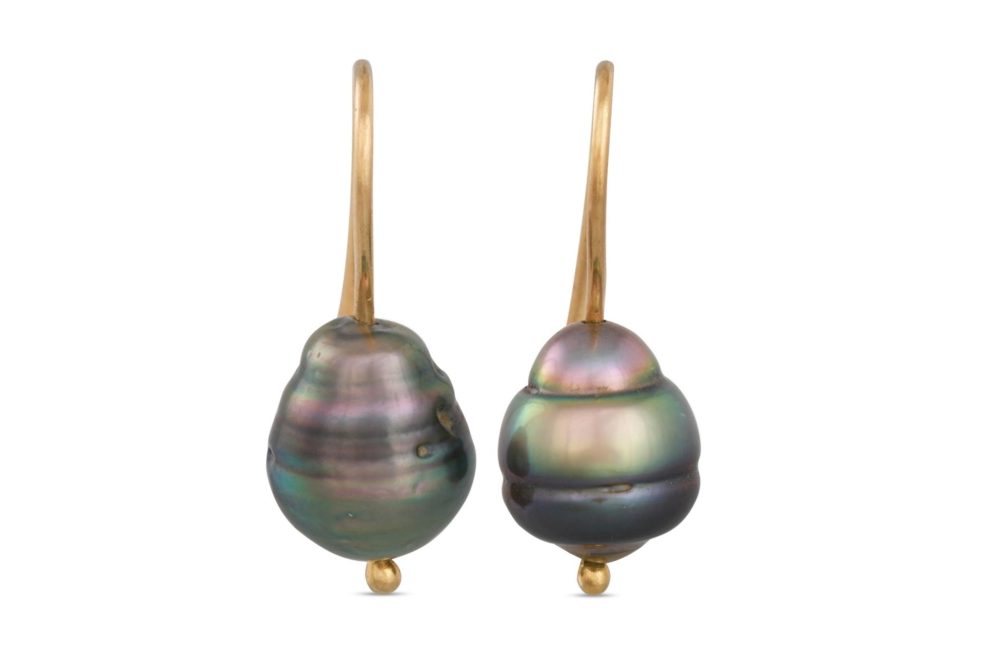 A PAIR OF BAROQUE TAHITIAN PEARL DROP EARRINGS mounted on 9ct yellow gold hooks