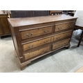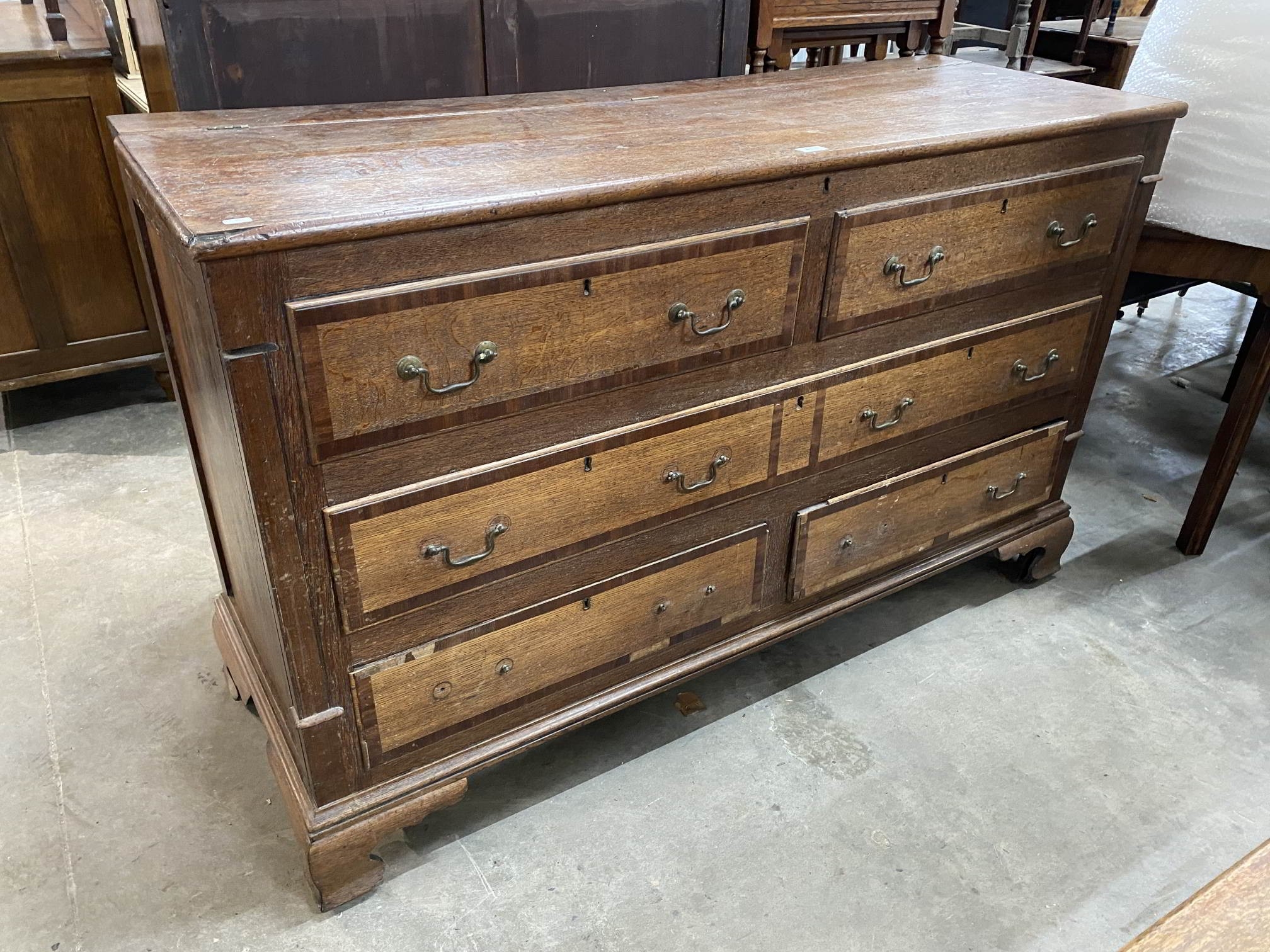 George III crossbanded oak Lancashire chest with three drawers and hinged top (two sham drawers) 97H 155W 56D