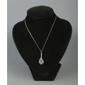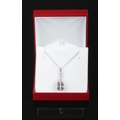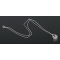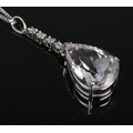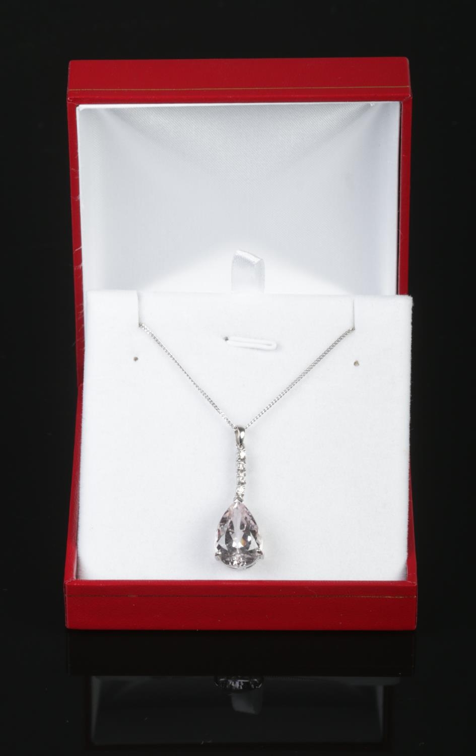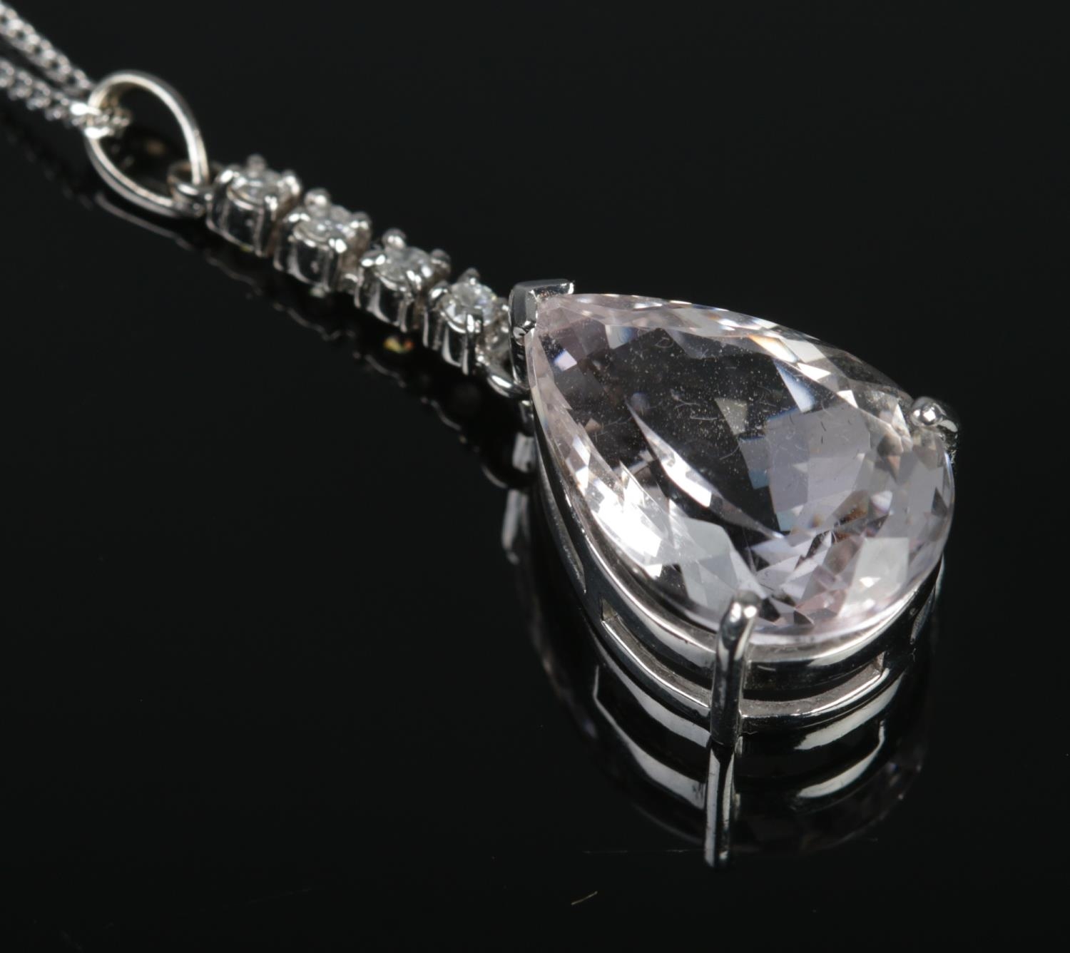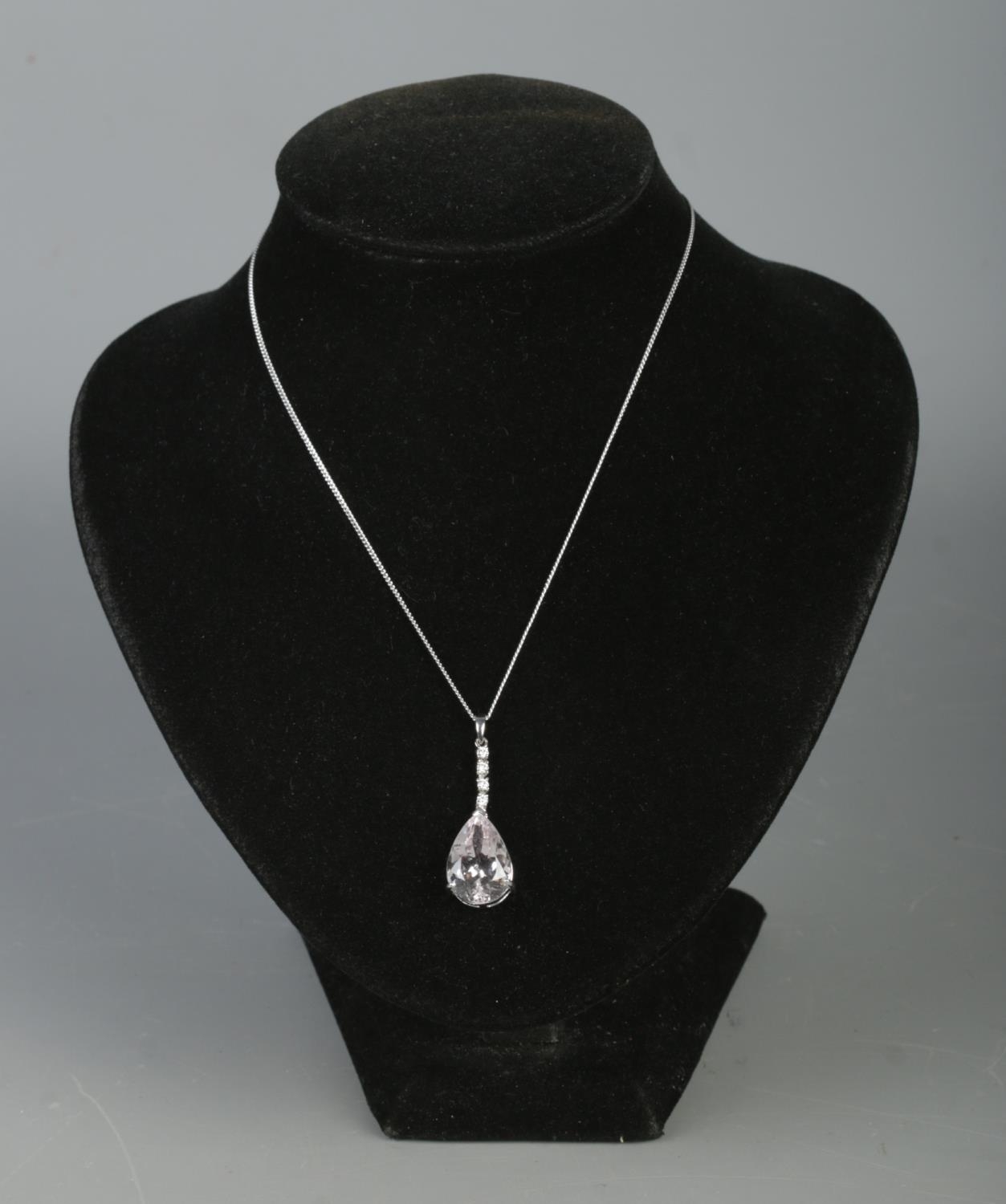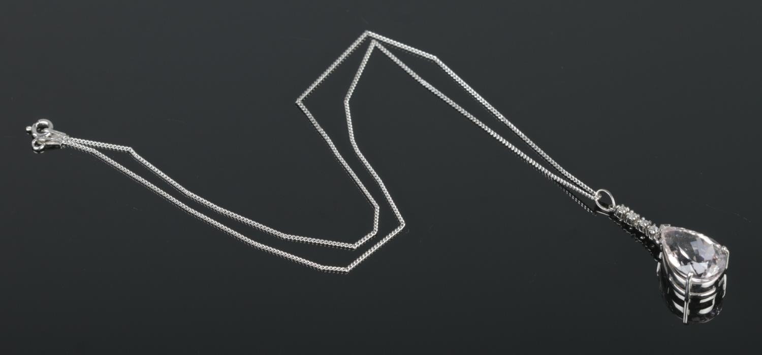 An 18ct white gold pear shaped kunzite pendant with diamond set bale on a silver chain. Kunzite approximately 15ct. Diamonds approximately 0.25ct.