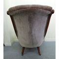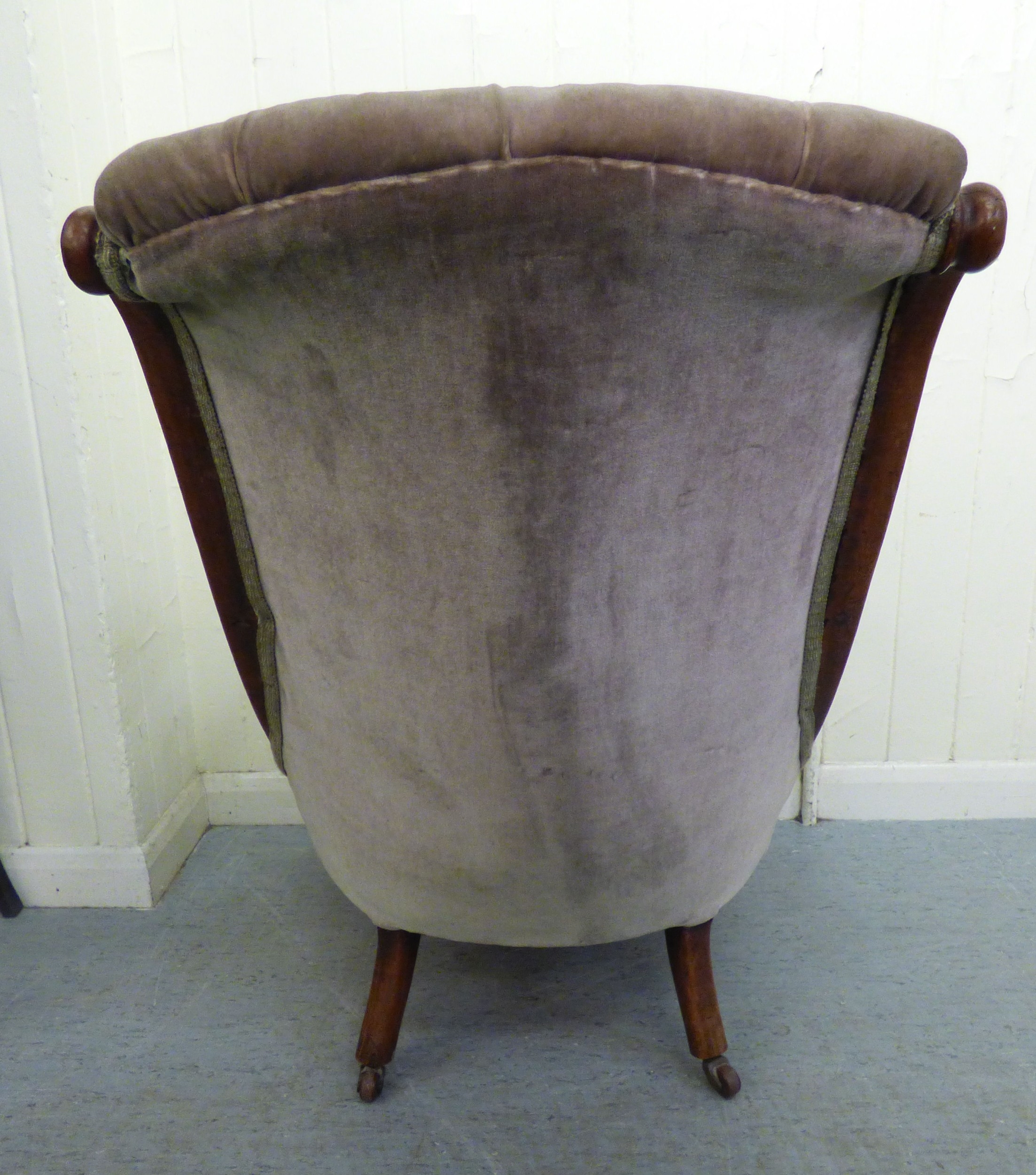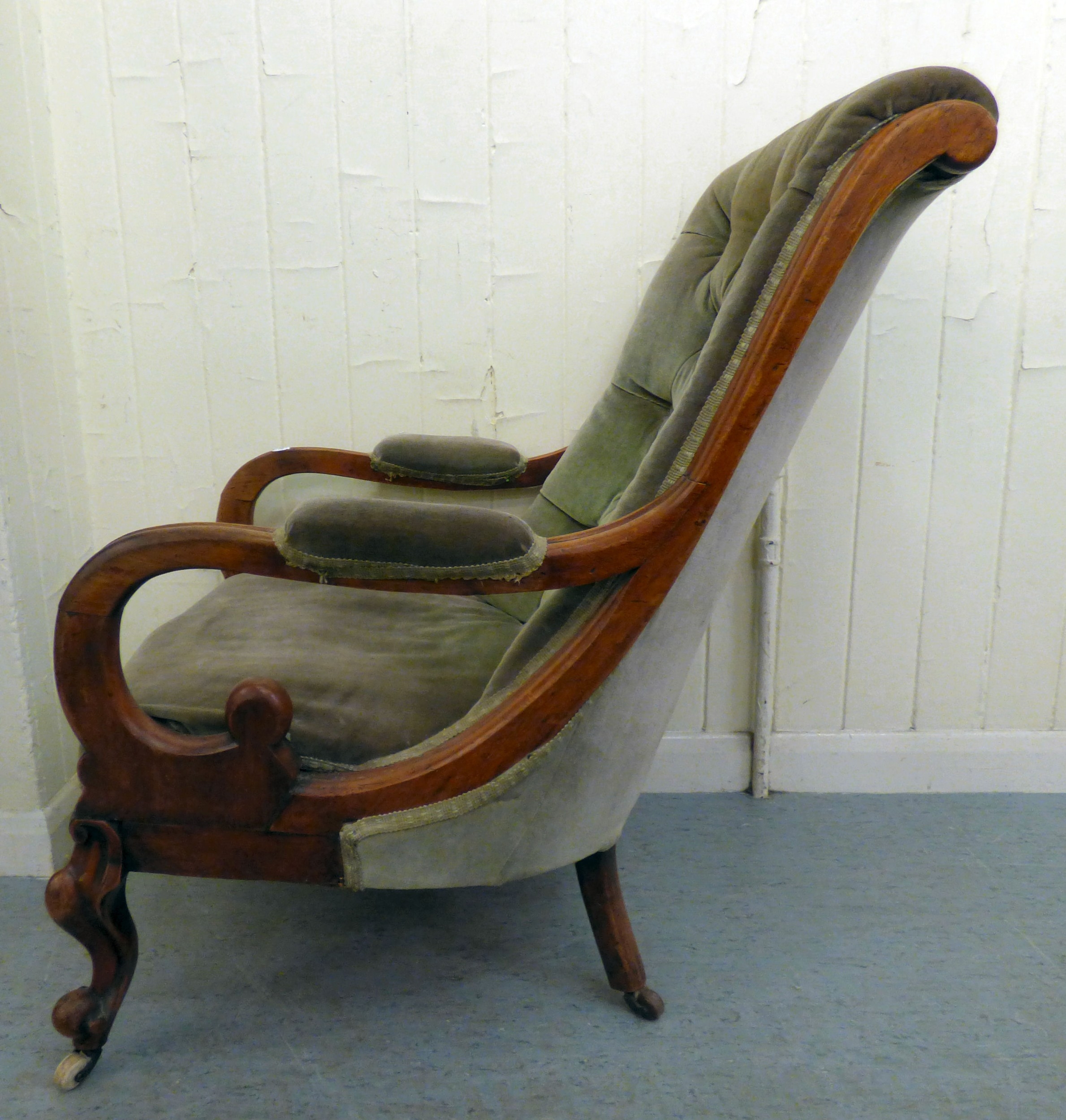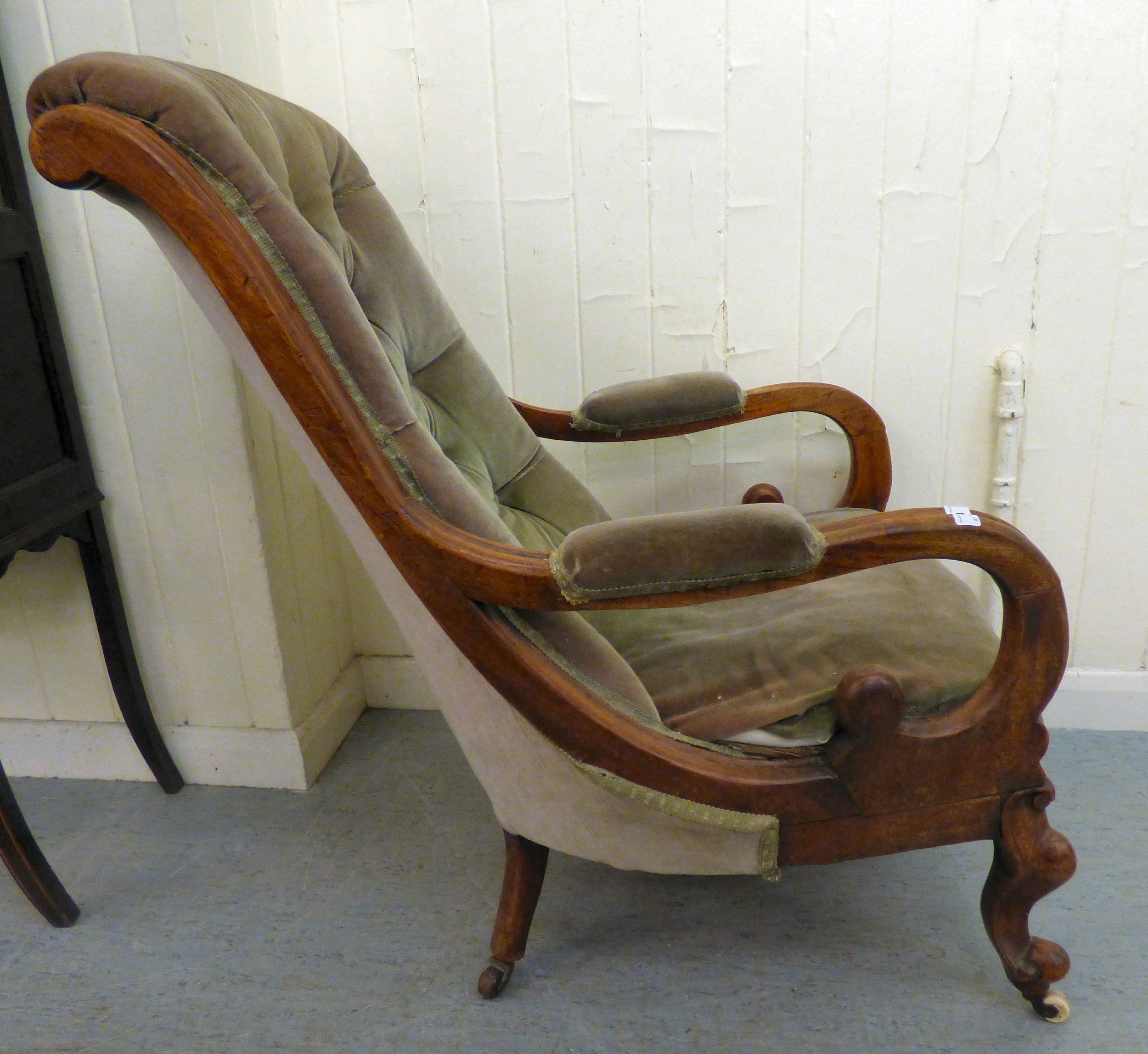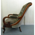 A mid/late Victorian mahogany showwood framed library chair, button upholstered in green fabric, raised on stubby cabriole forelegs and casters