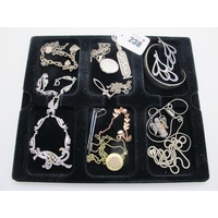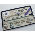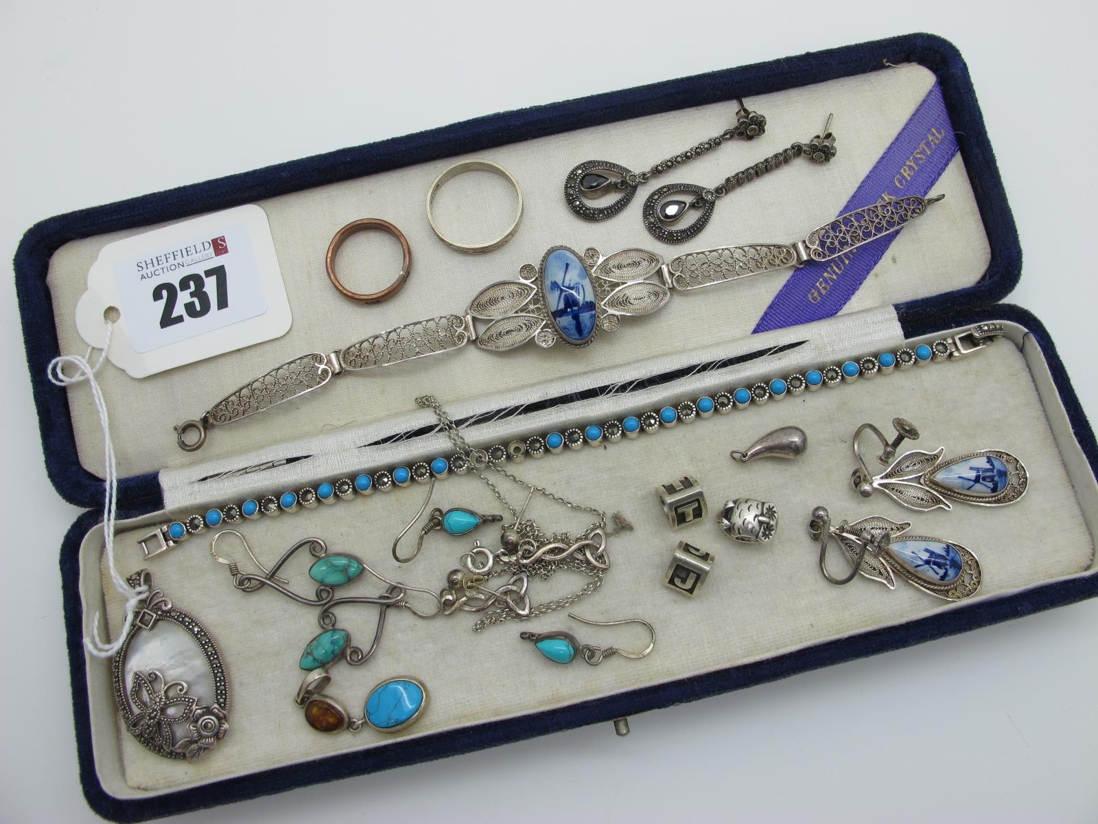 Blue and White Delft Filigree Bracelet, together with pair of Delft filigree drop earrings, a modern shell and marcasite set pendant, further earrings, bracelet, sliding charms, etc.