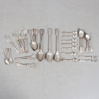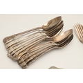 107 pieces total, hallmarked Mary Chawner, London, 1840. A George III dessert fork and spoon are matched to the part set. All are engraved with Rampant Lion crest. Total lot weight 250ozt.