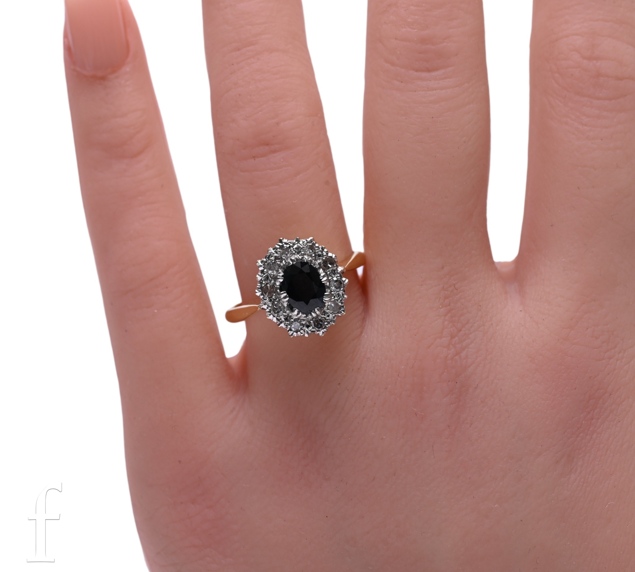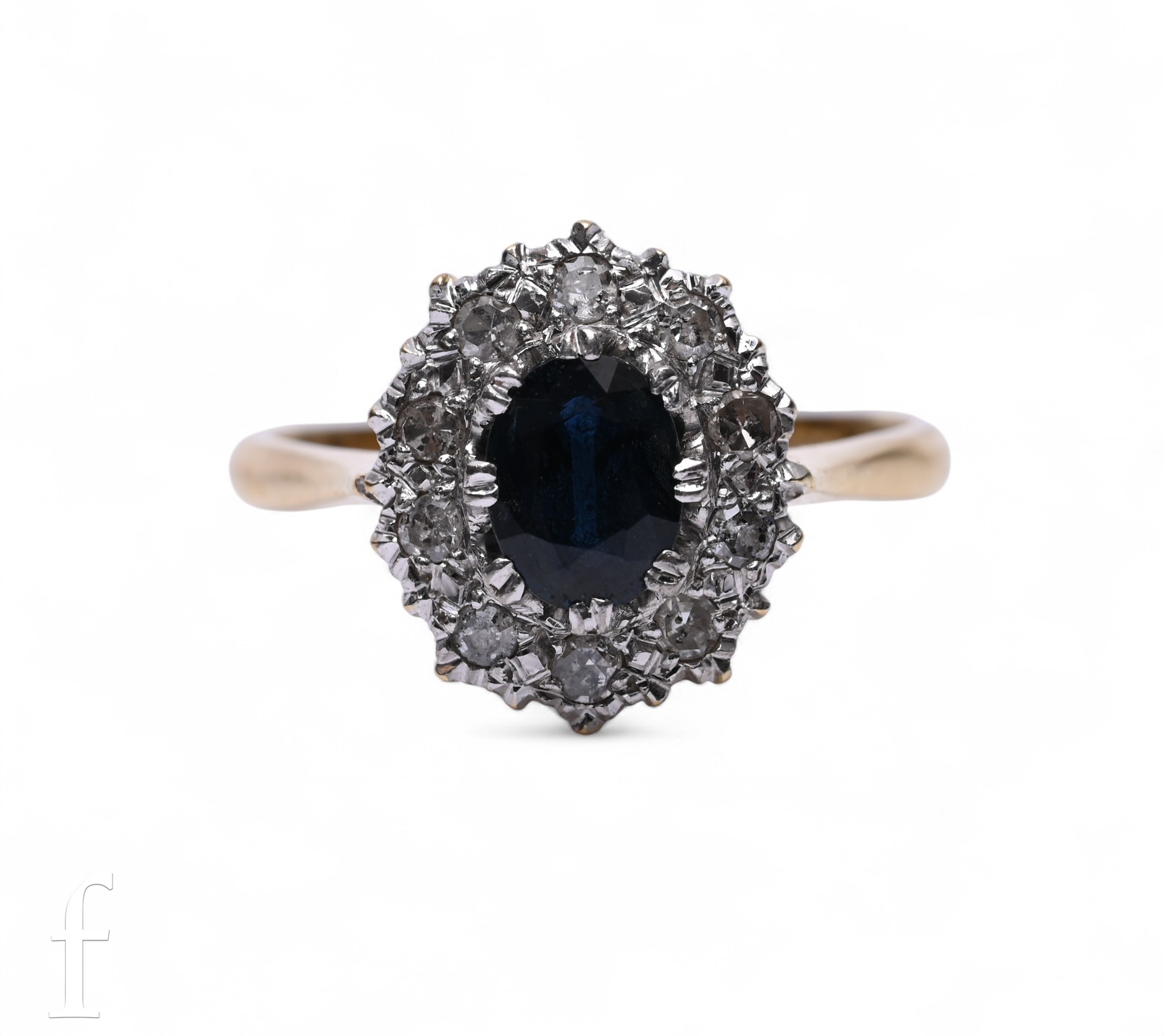 A sapphire and diamond cluster ring, the oval mixed-cut sapphire of green/blue colour, eight claw set within a bezel of ten eight-cut diamonds, above a pierced mount and between tapering shoulders, stamped '18CT 18CT', total weight 4.7g.