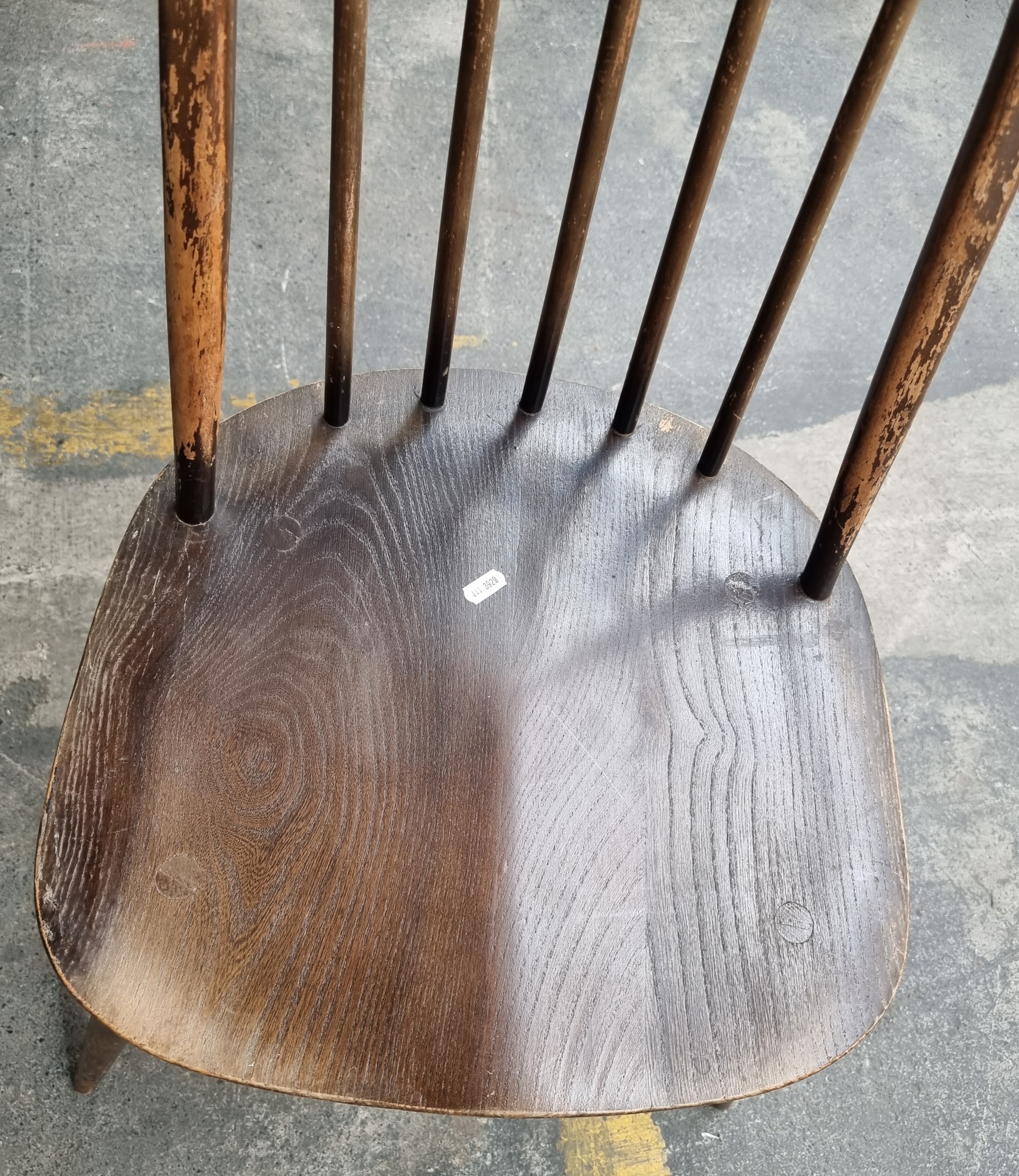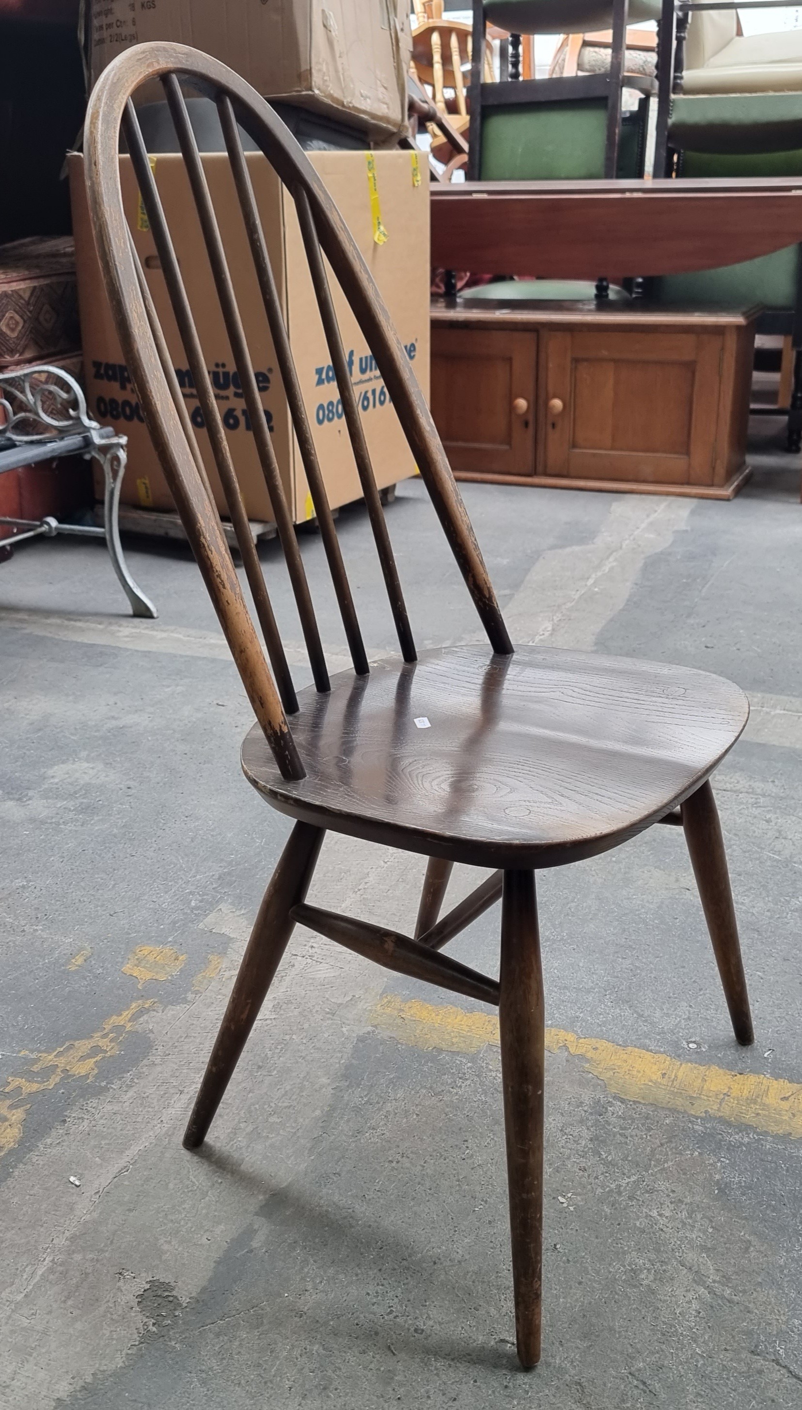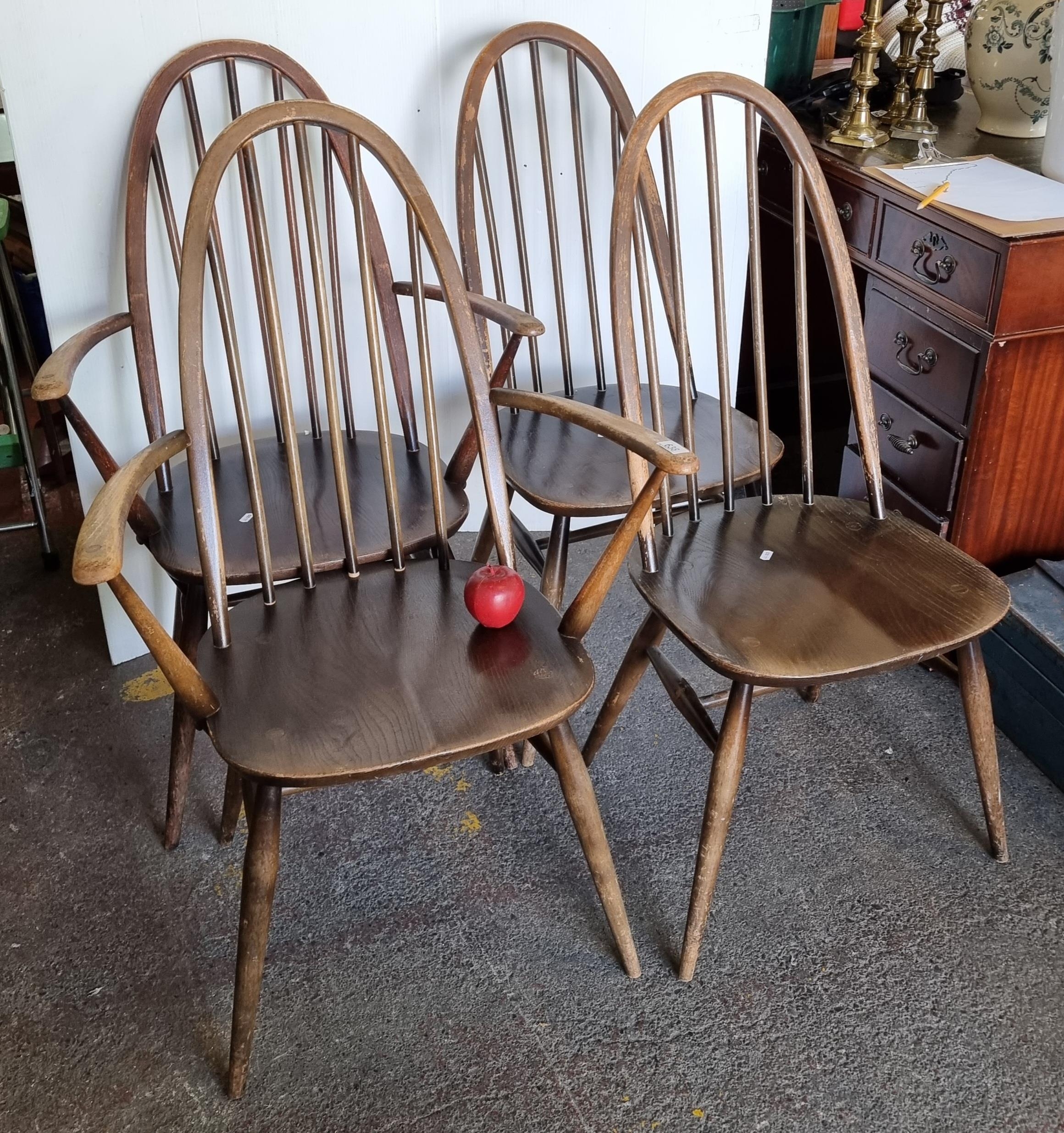 Star Lot : Four very handsome, genuine vintage Ercol chairs. With wonderful delicately turned spindles and legs. Including two example with arms and two without. Complete with Ercol vintage stickers to base. A lovely example of Mid Century Modern design.