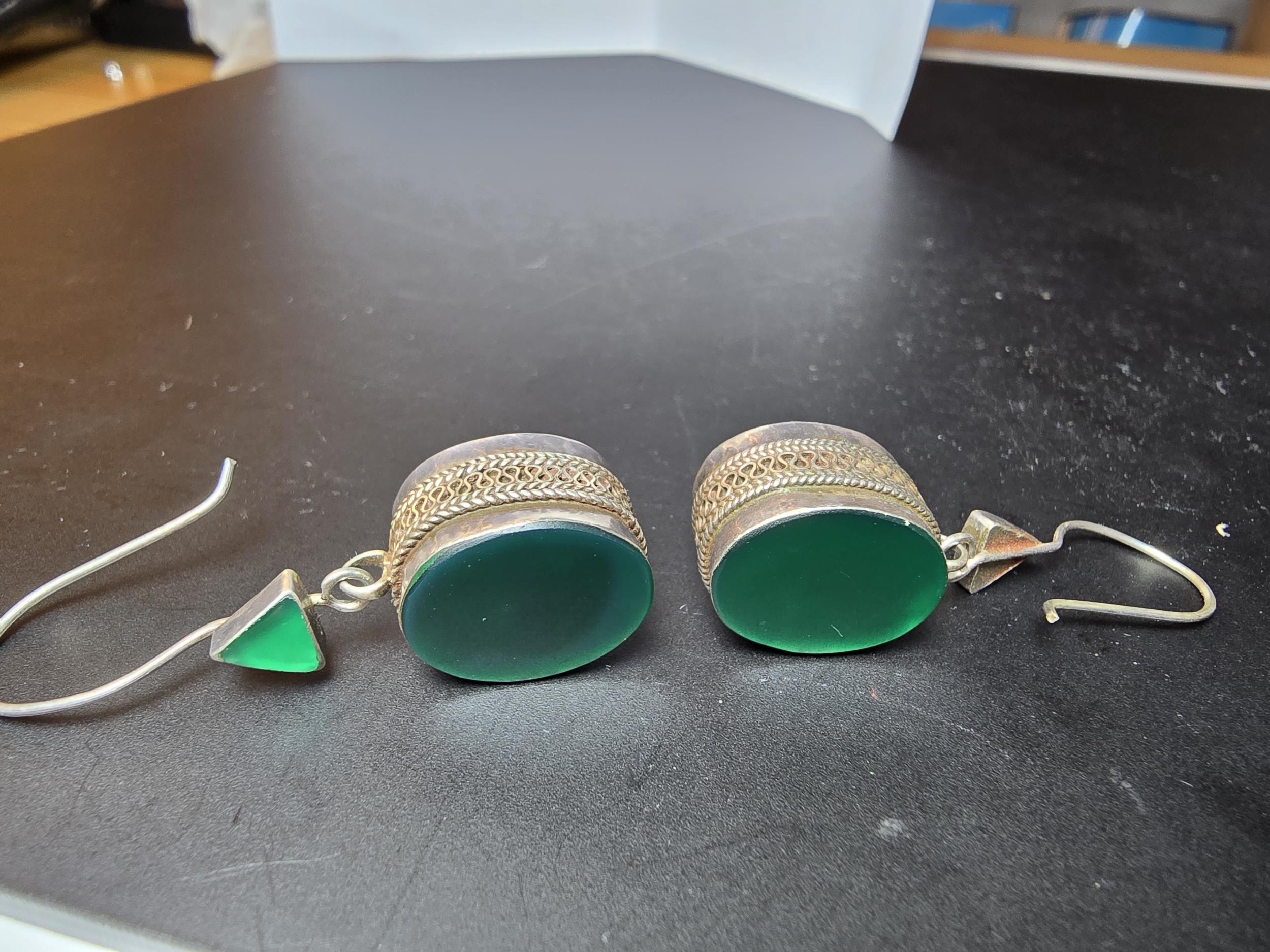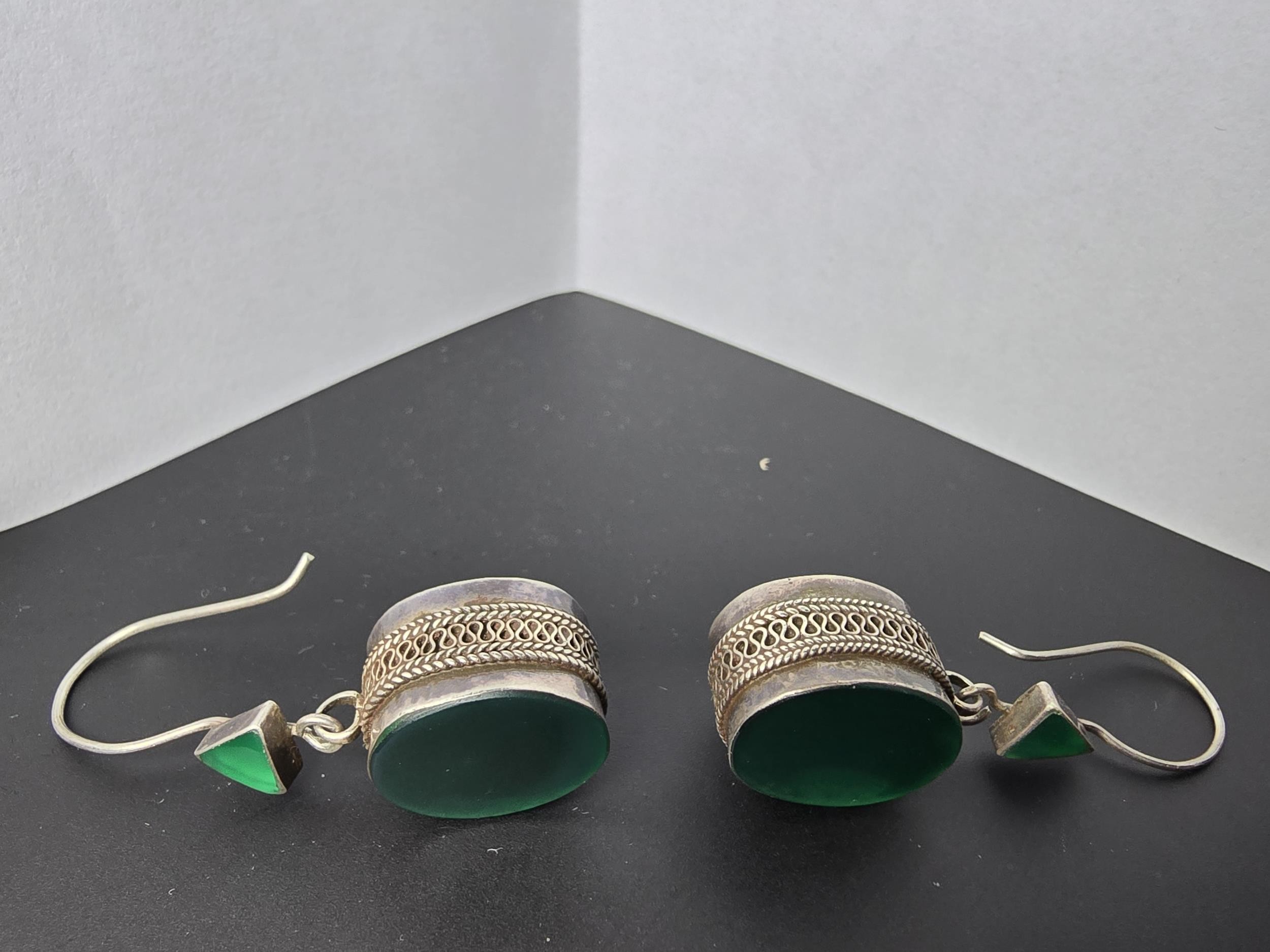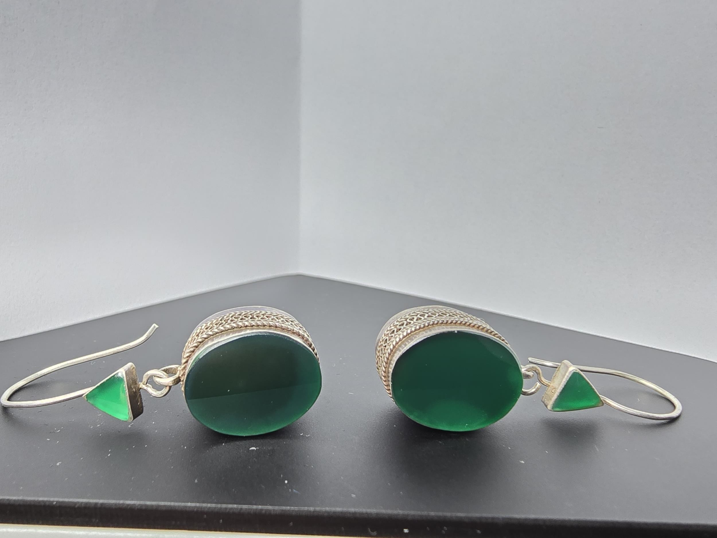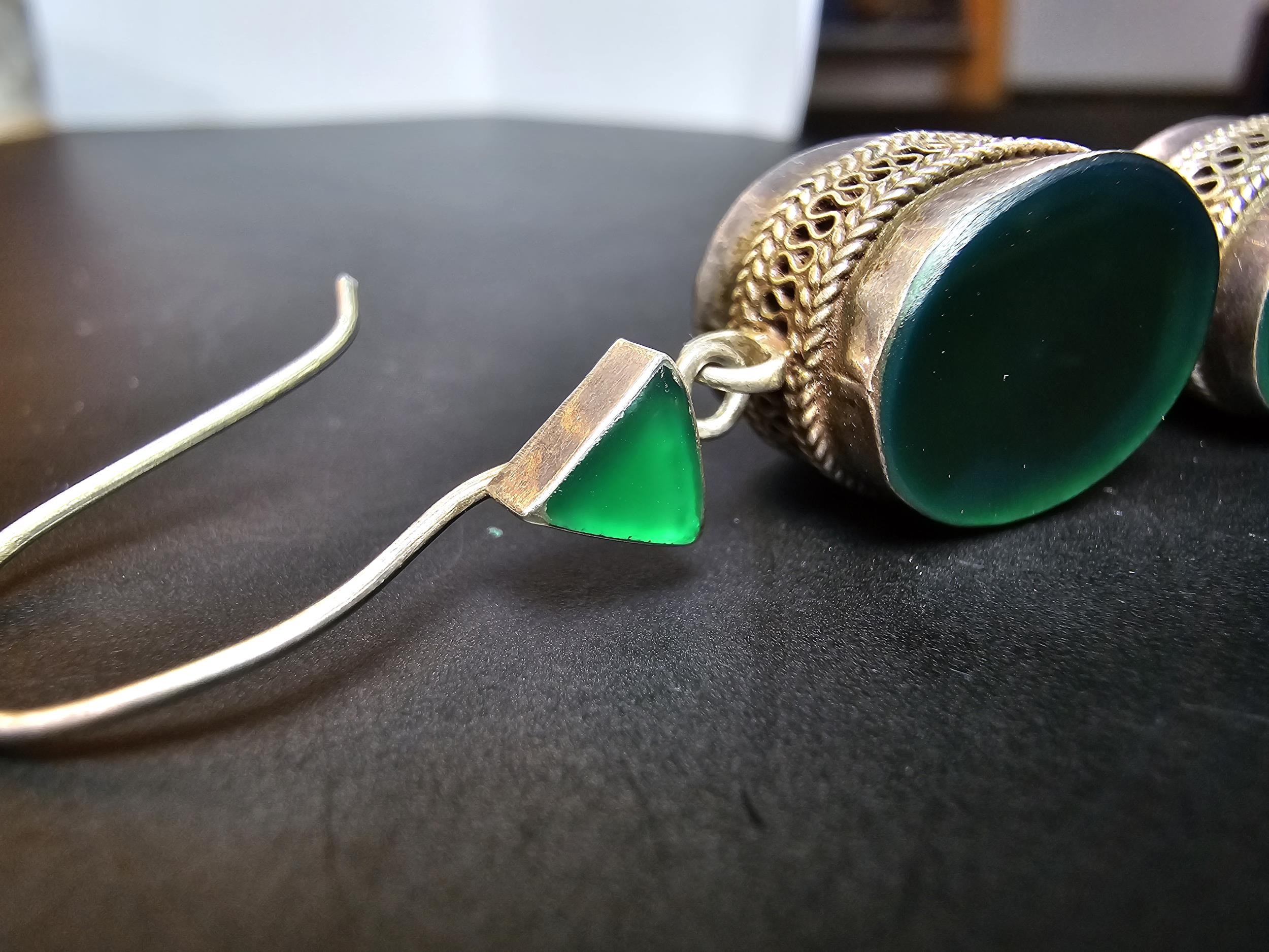 A pair of large ornate and unusual sterling silver drop earrings featuring a polished green glass inset to both sides of the earrings featuring a thick depth to the earrings and having a triangular green glass piece inset to the top, the earrings display very nicely and are in excellent clean condition, length of the drop is 30mm, the green oval stone has a height of 15mm and a width of 12mm and the depth of the earrings is 10mm.