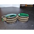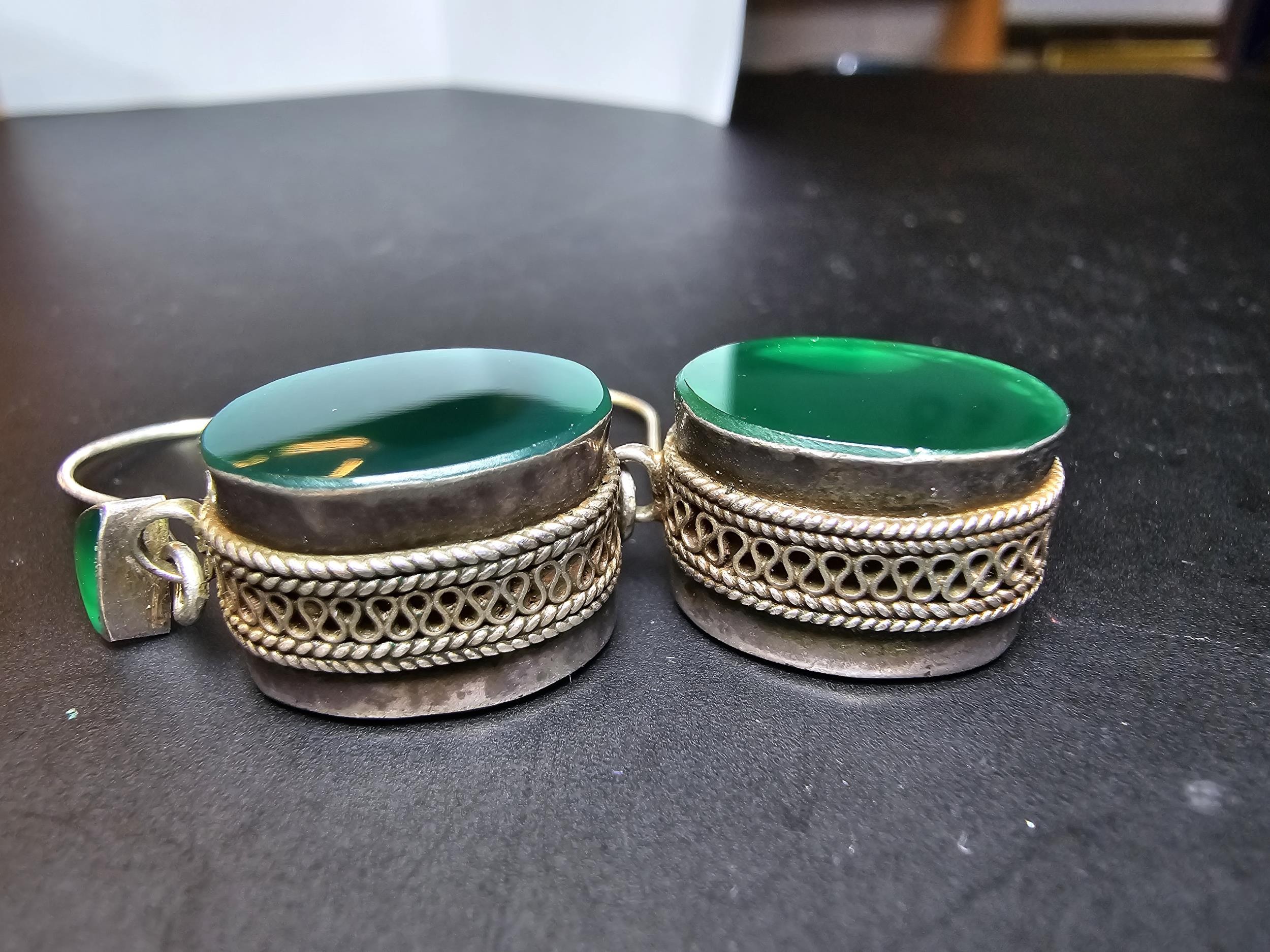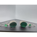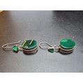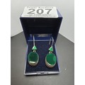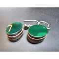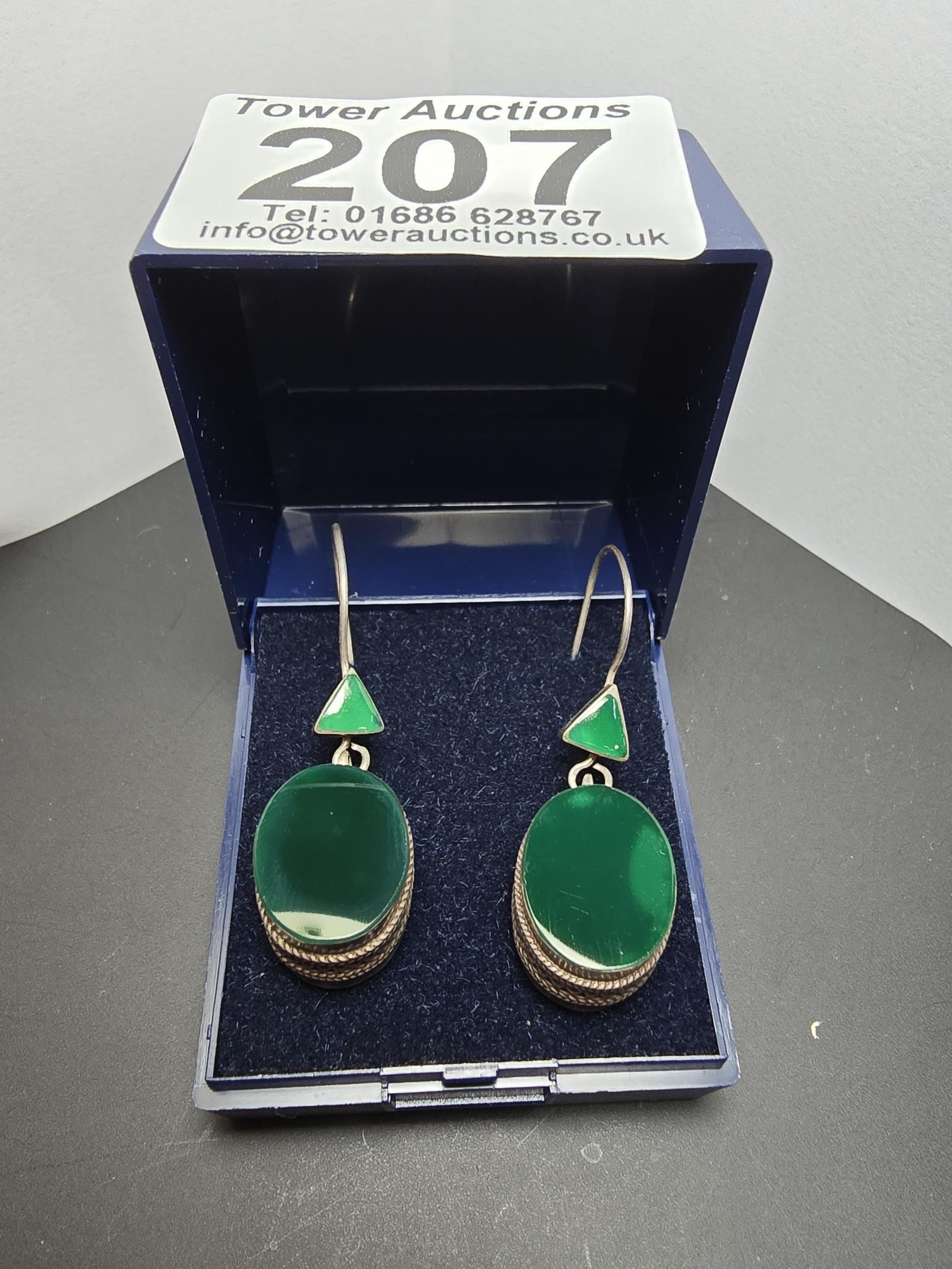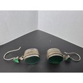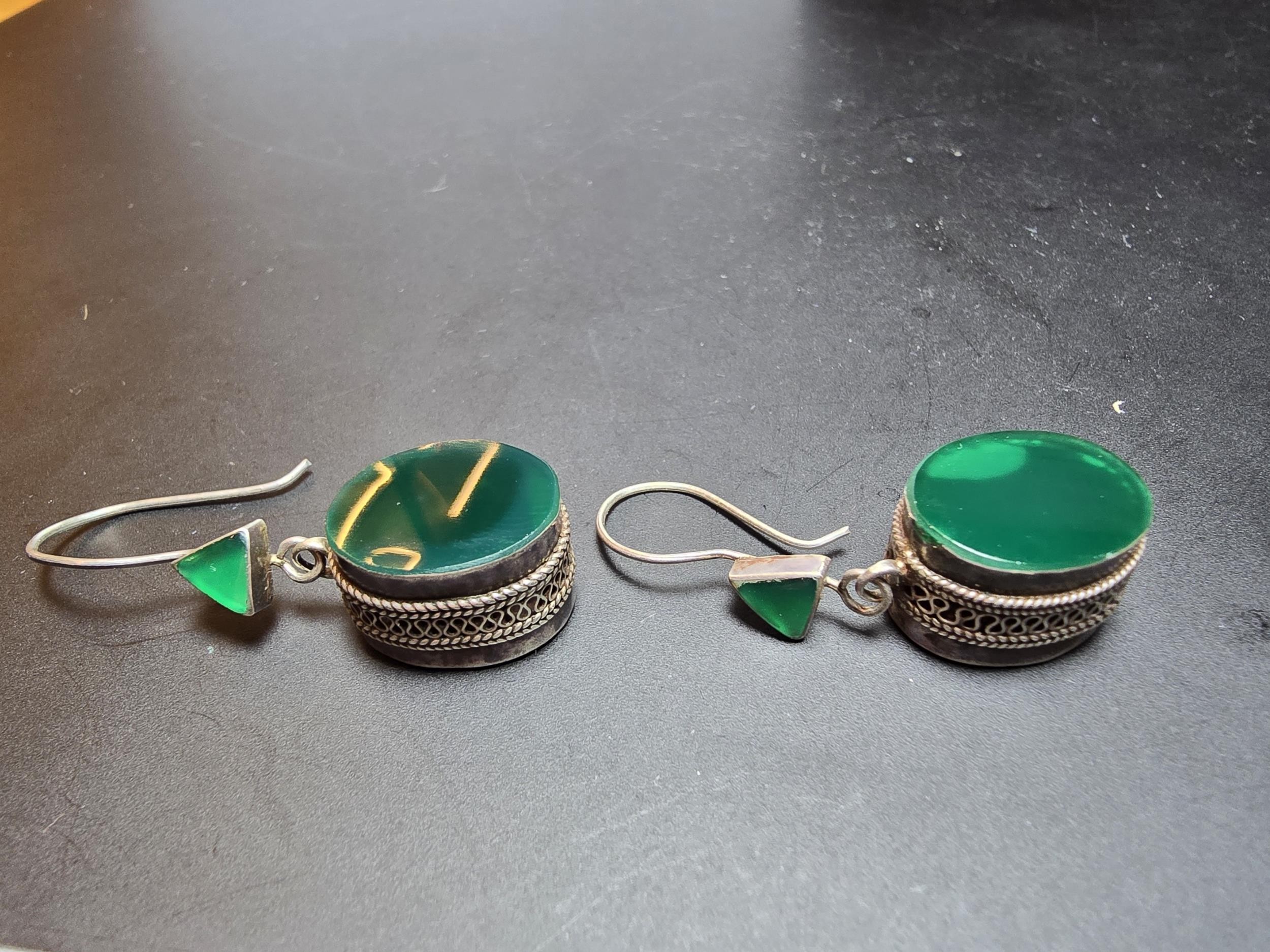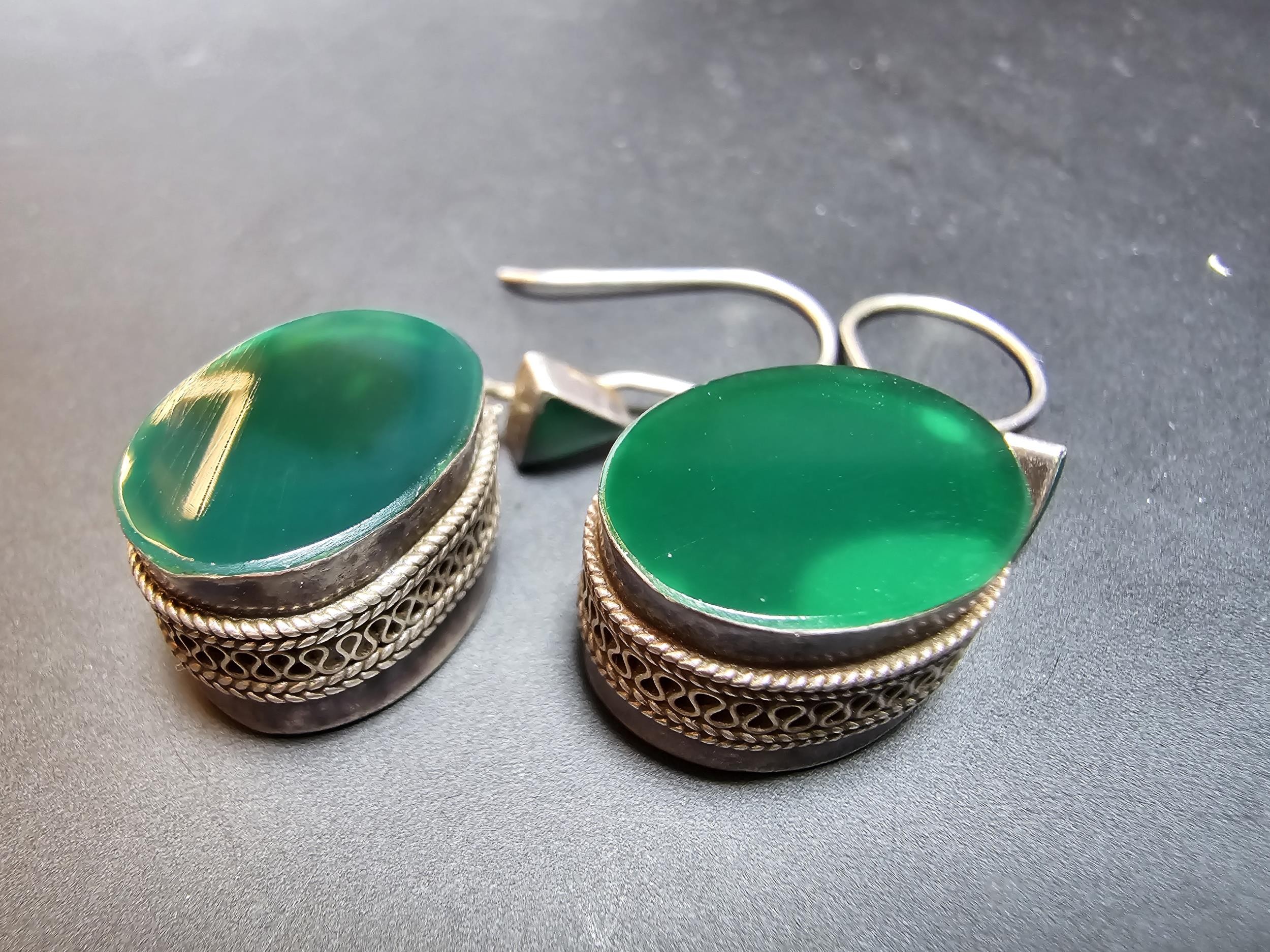 A pair of large ornate and unusual sterling silver drop earrings featuring a polished green glass inset to both sides of the earrings featuring a thick depth to the earrings and having a triangular green glass piece inset to the top, the earrings display very nicely and are in excellent clean condition, length of the drop is 30mm, the green oval stone has a height of 15mm and a width of 12mm and the depth of the earrings is 10mm.