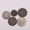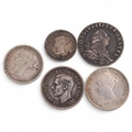A collection of 5 silver Maundy coins, George III 1800 4d, 3 Victorian and 1 George VI examples
