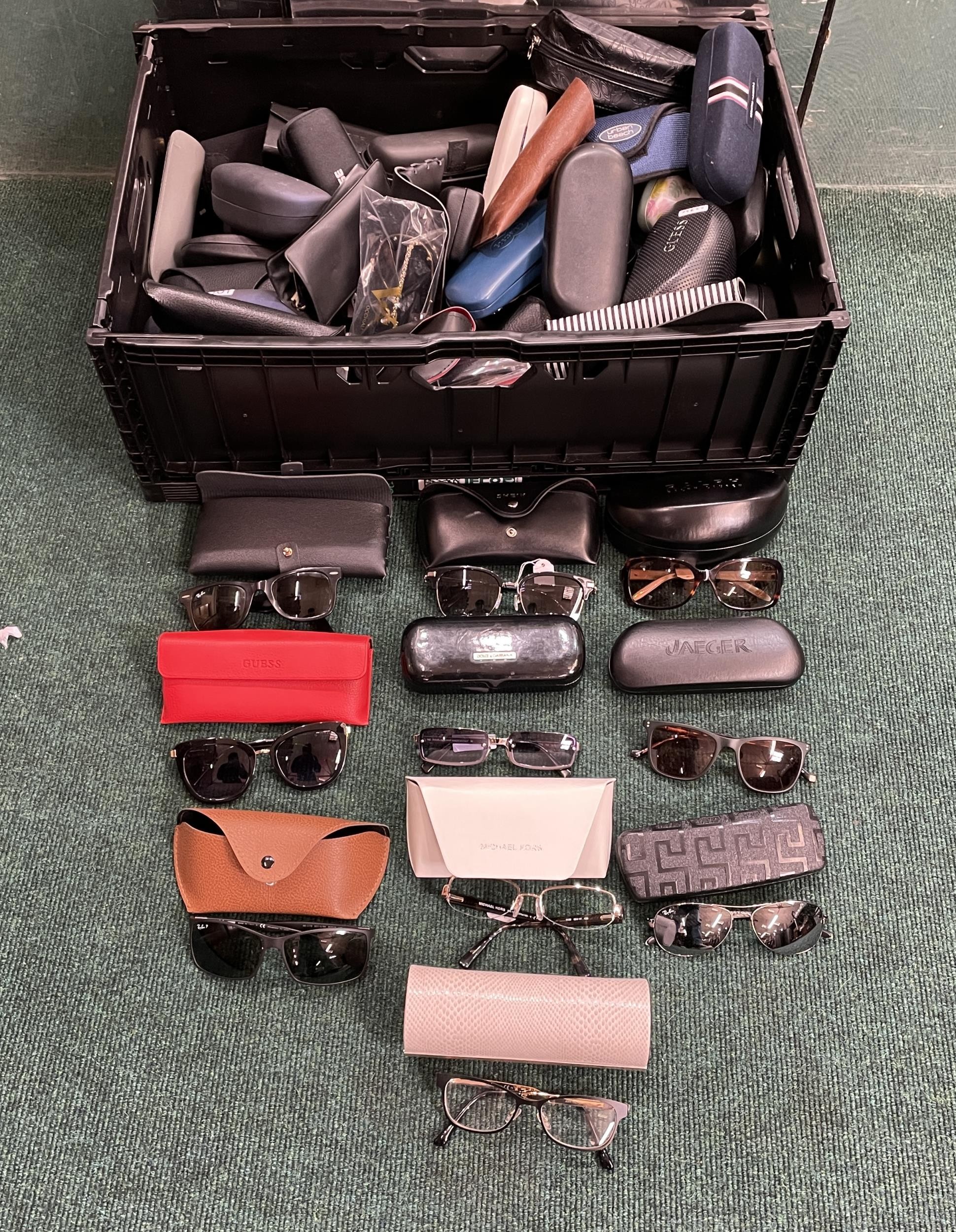 BOX OF APPROX 70 PAIRS OF VARIOUS SUNGLASSES/SPECTACLE FRAMES INC. TOM FORD, GUESS, RAYBAN, RAYBEN ETC. - ALL WITH PREVIOUS USEAGE, SOME WITH PRESCRIPTION LENSES, SOME CASES