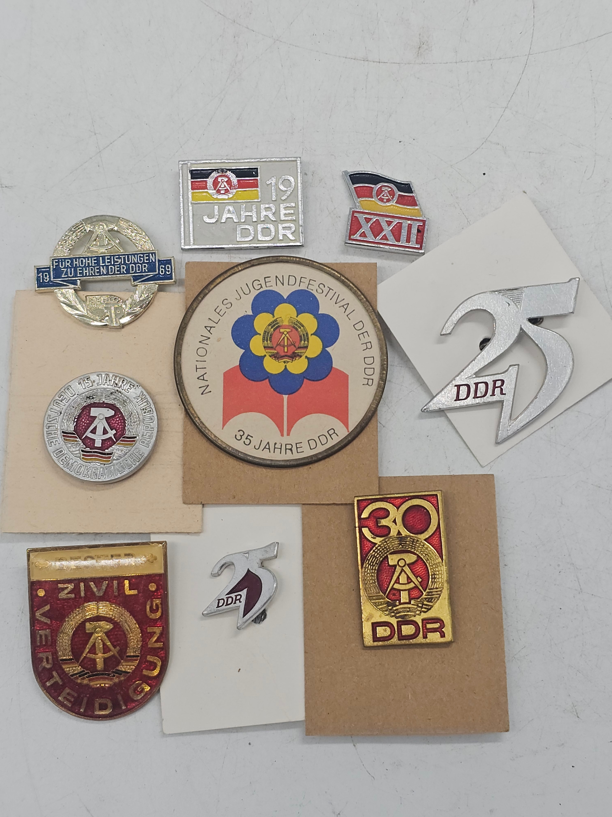 Selection of vintage political pin badges commemorating different anniversaries of the German Democratic Republic