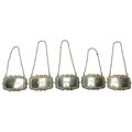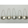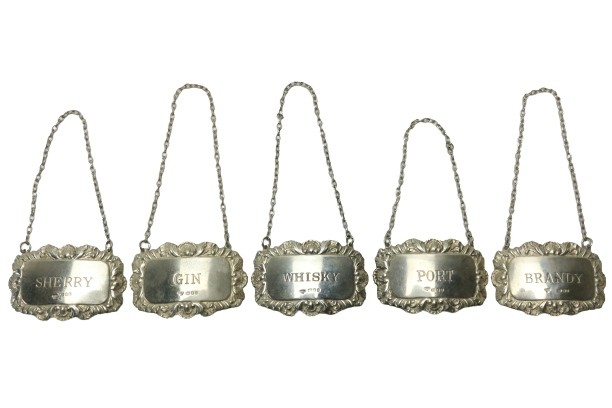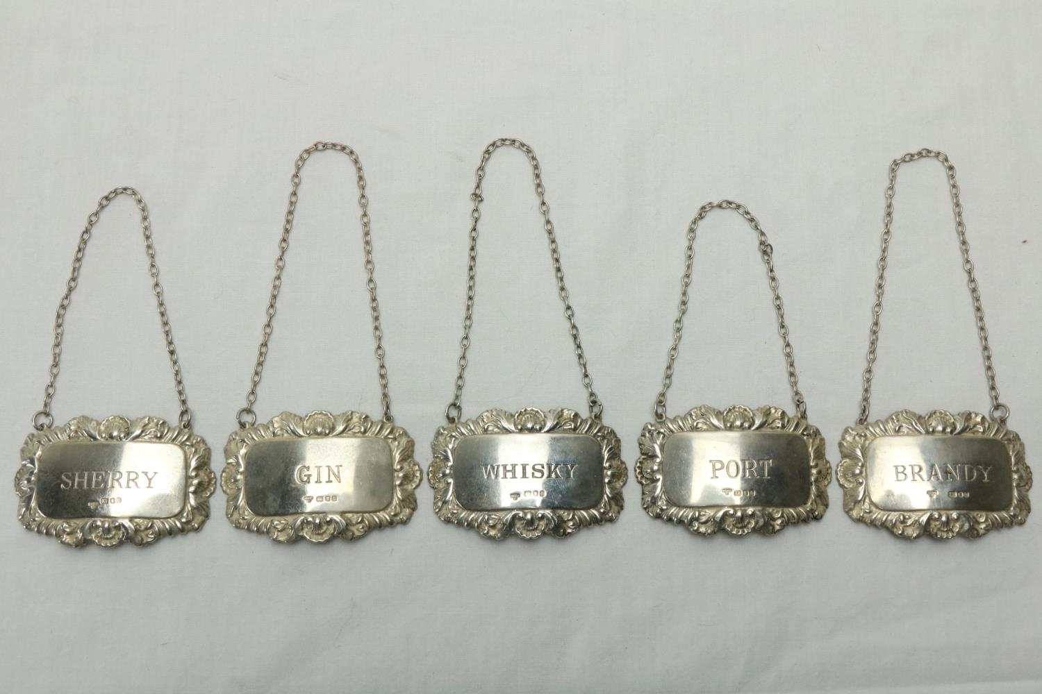 A good set of 5 silver Decanter Labels, for Whiskey, Brandy, Port, Gin & Sherry, London 1977, each with shell and foliate border. (5)