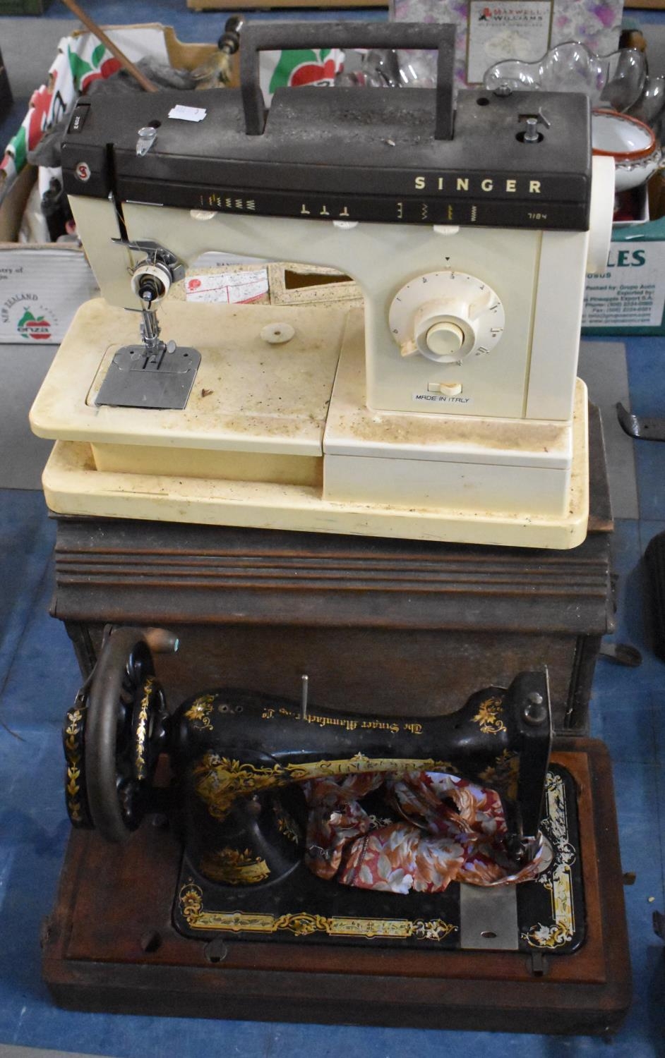 A Cased Manual Singer Sewing Machine Together with an Electric Example, Not Tested and No Plug