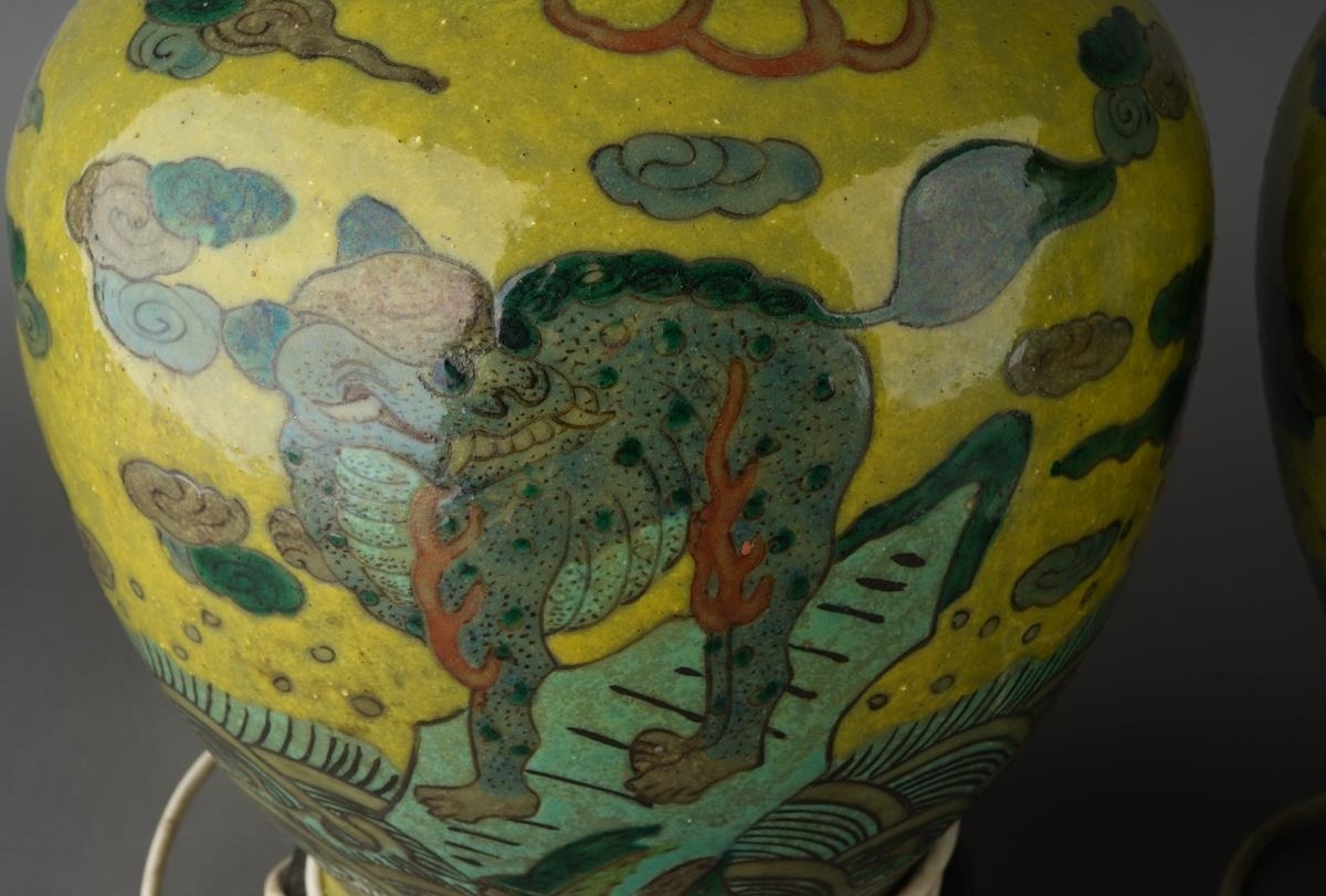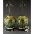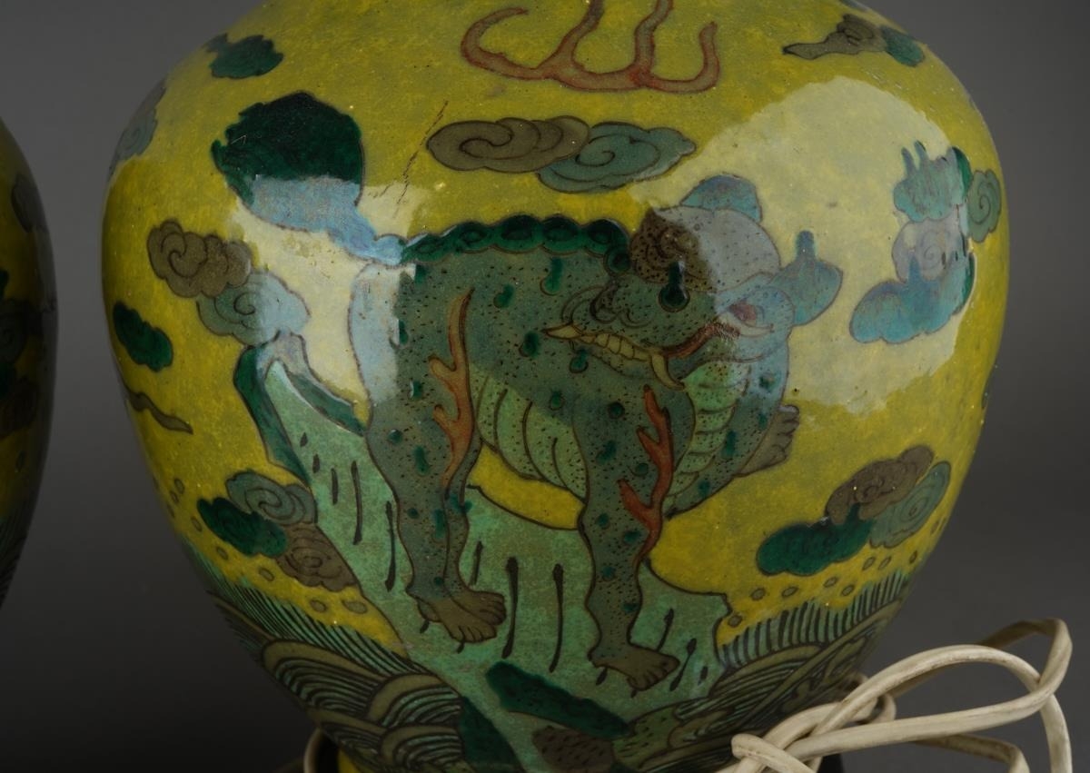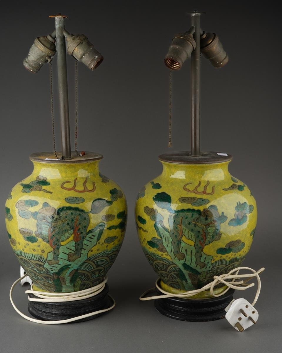 A pair of Chinese baluster vases, each lime green ground decorated with Mythical beasts standing on rocks above water with clouds and motifs above, converted to table lamps, electrified but untested, the entire approx 53cm high [2]