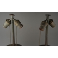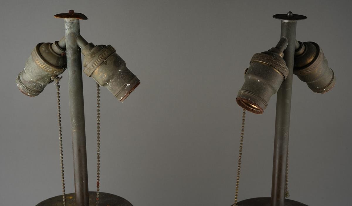 One vase’s body appears to be in good condition but has some rusting and denting on the metal, the other has some chipping on the paint of the body but the metal is in good condition. There do not appear to be any hairline cracks on either vase.