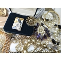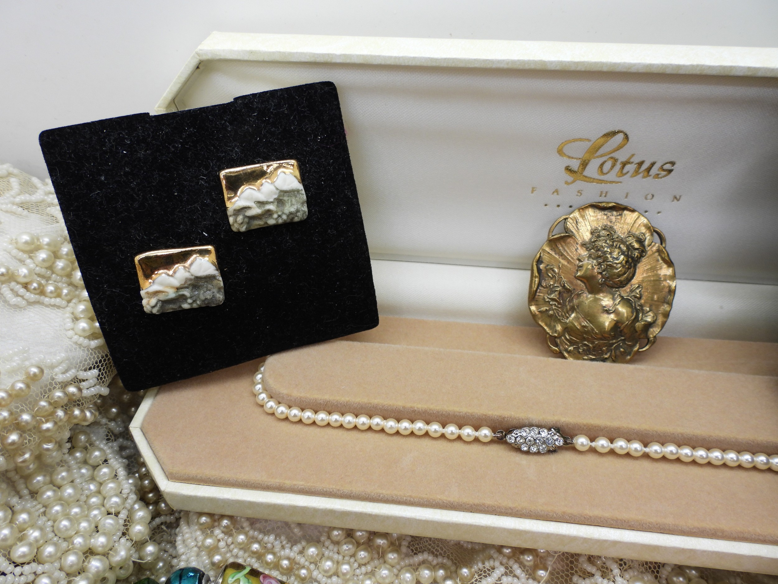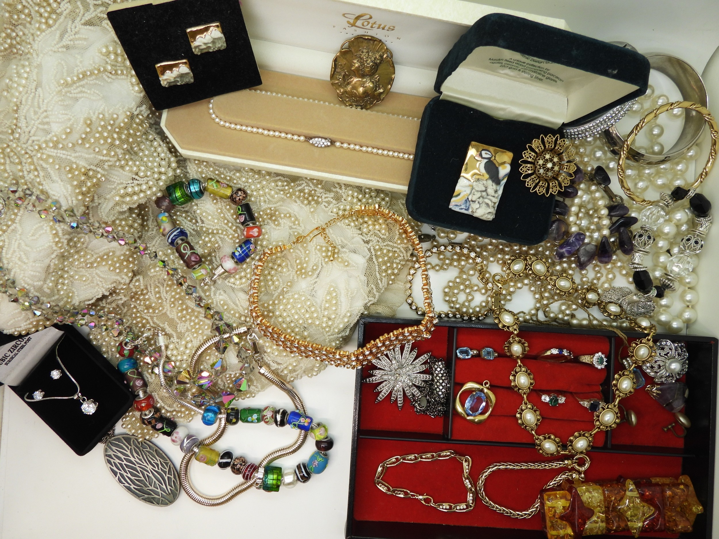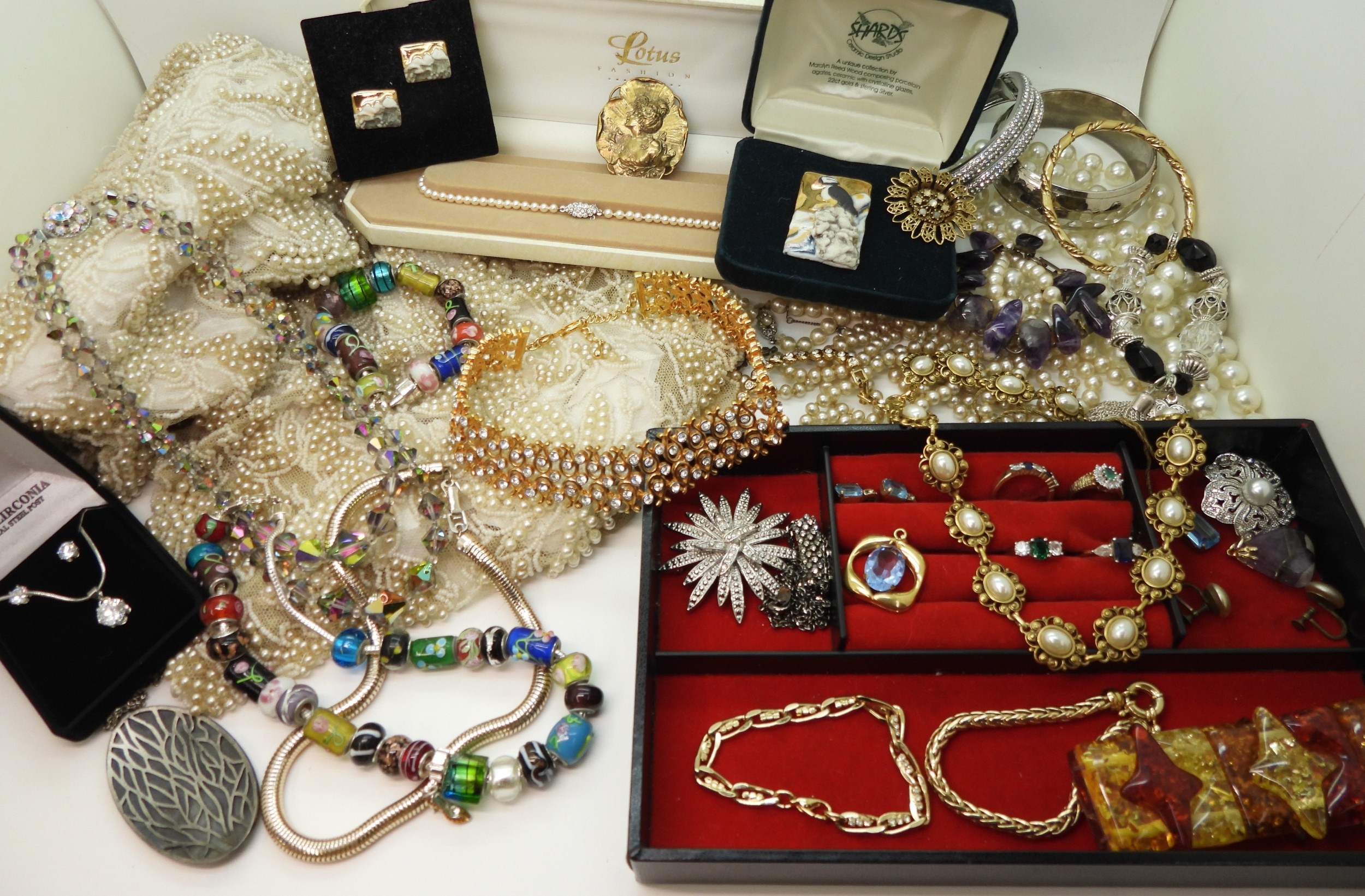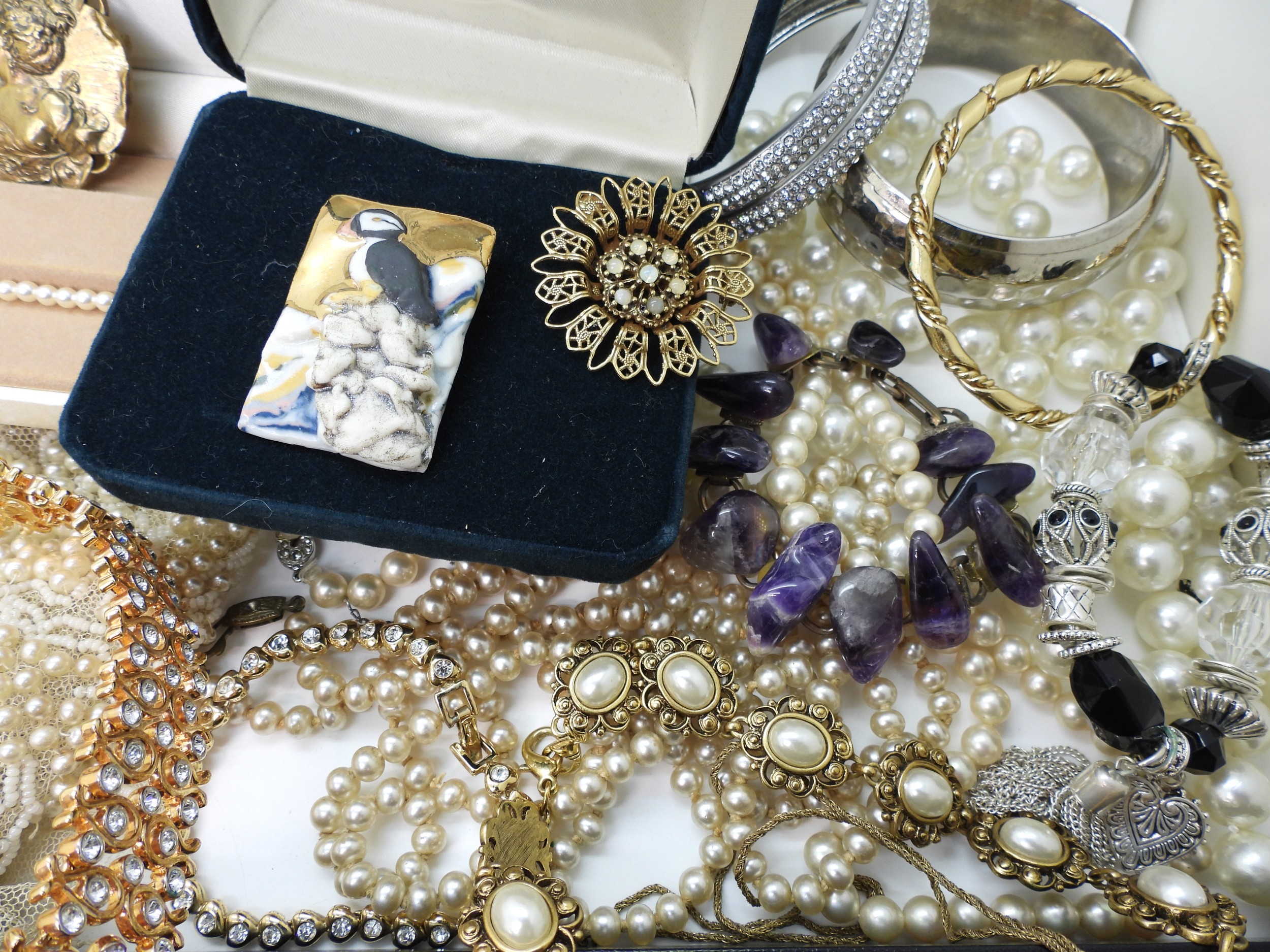 A quantity of vintage heavily beaded net material, a retro diamante collar necklace, faux pearls, aurora beads, an Art nouveau style brooch, a puffin brooch and earrings by Shards (Maralyn Reed Woods) and other items