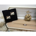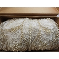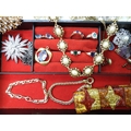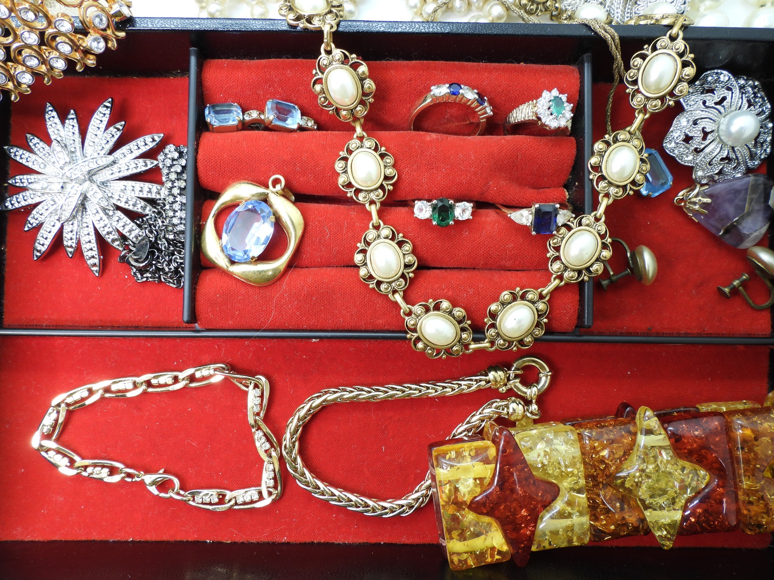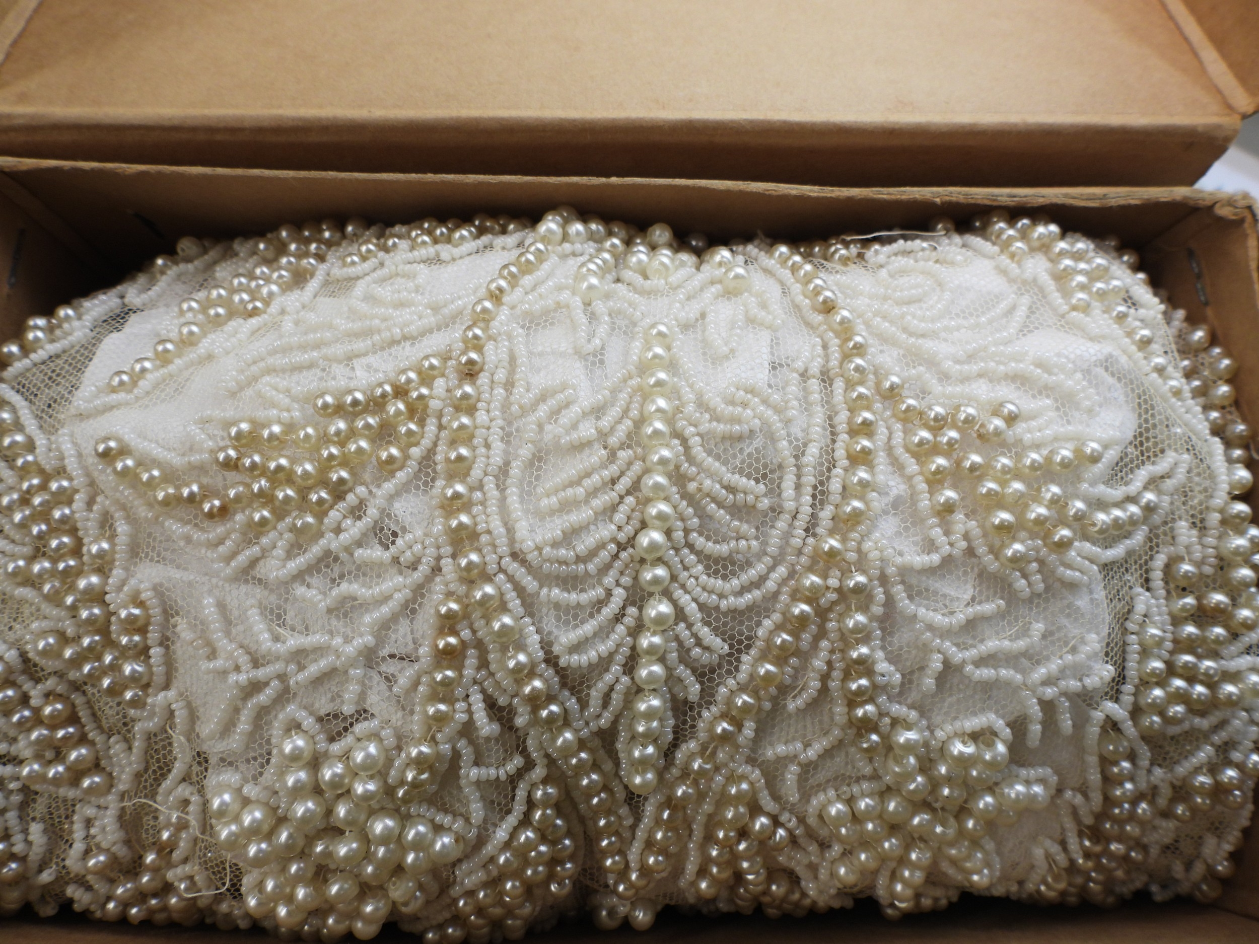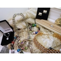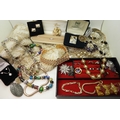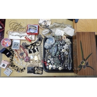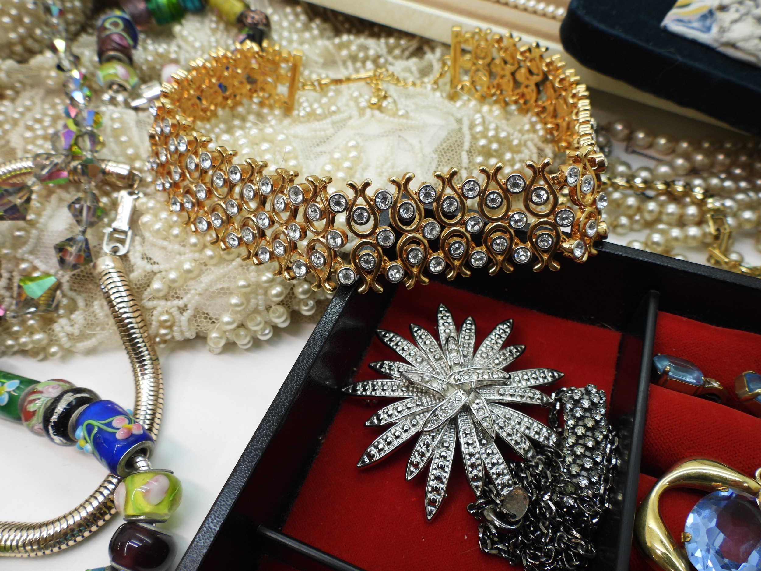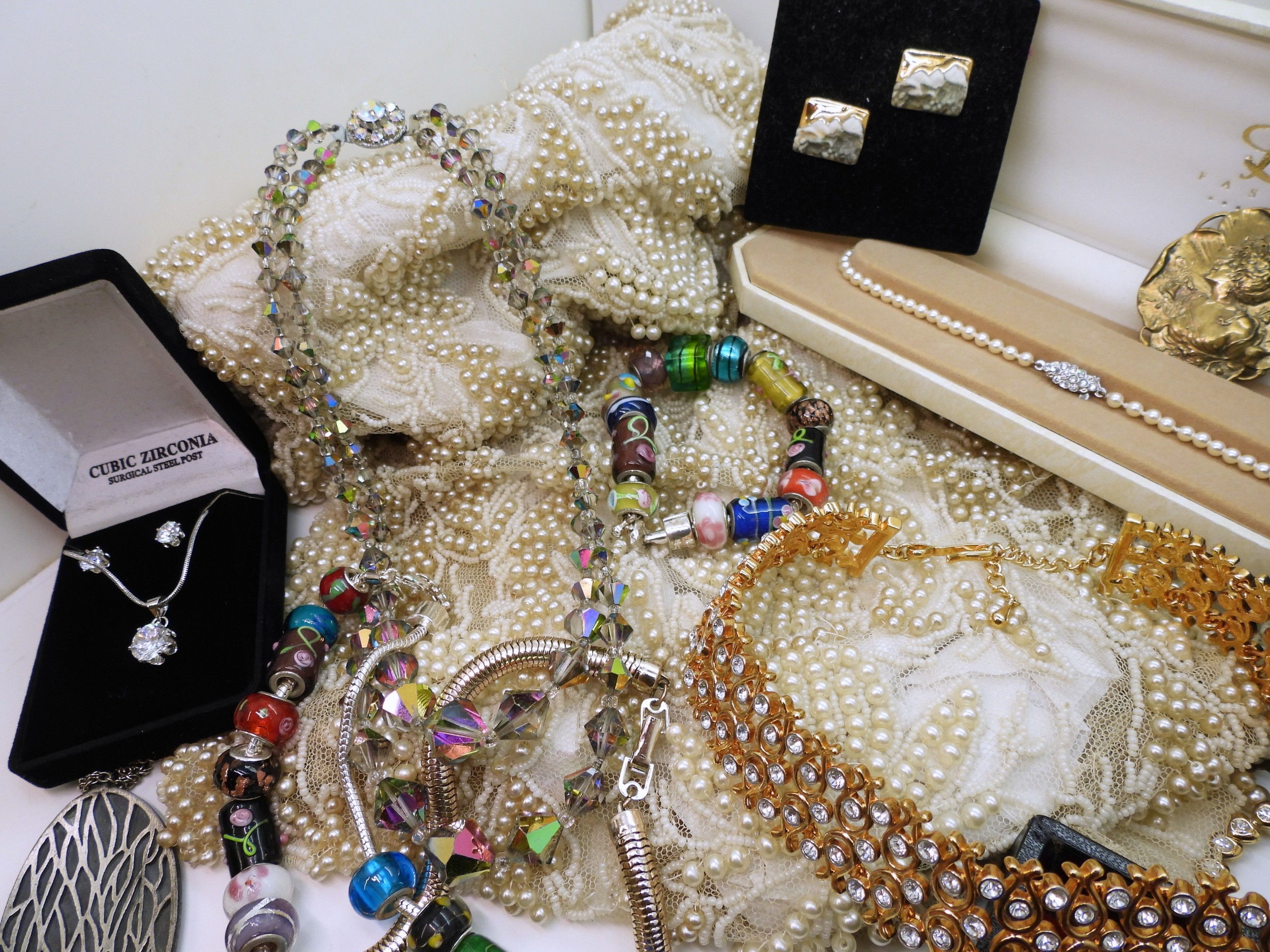 A quantity of vintage heavily beaded net material, a retro diamante collar necklace, faux pearls, aurora beads, an Art nouveau style brooch, a puffin brooch and earrings by Shards (Maralyn Reed Woods) and other items