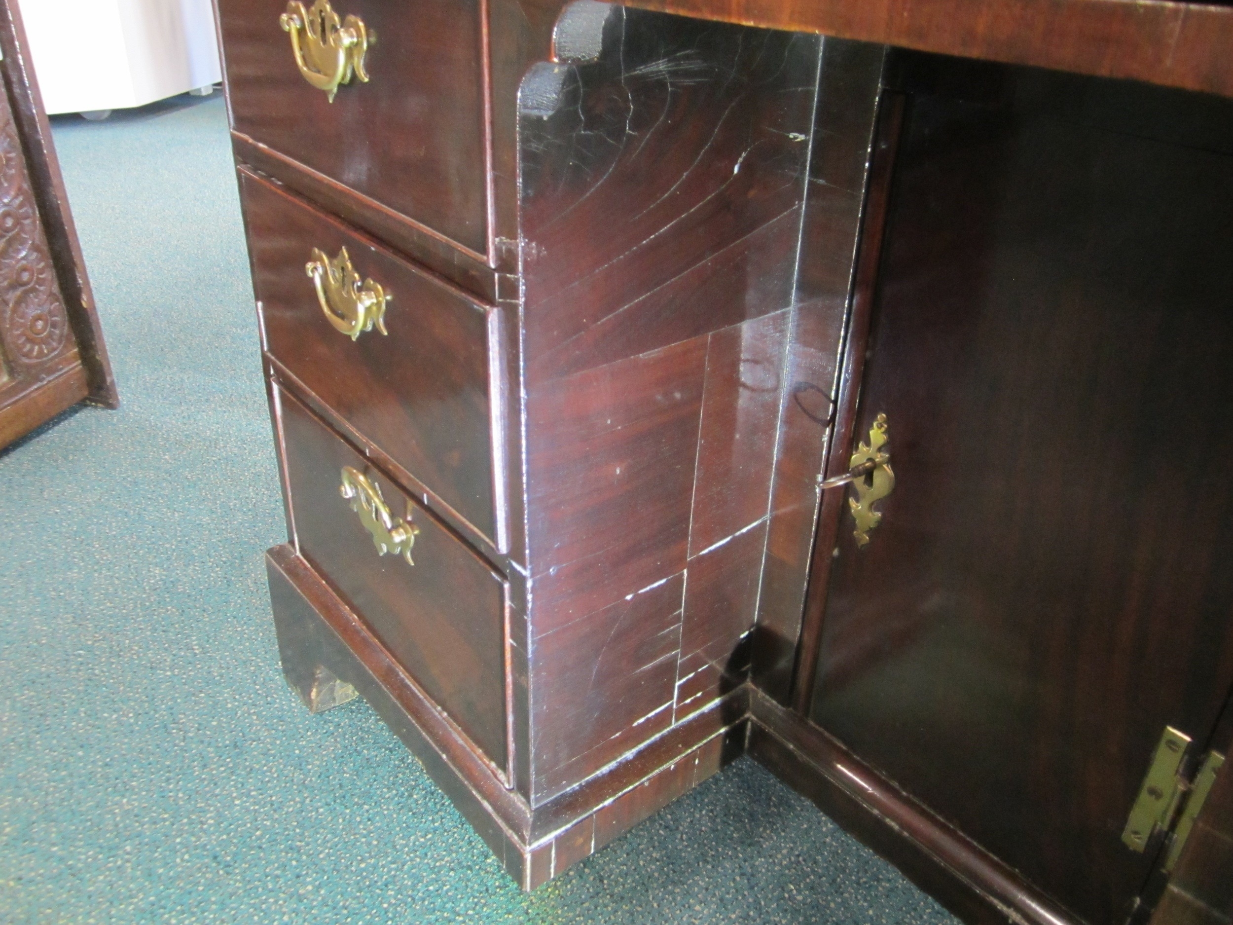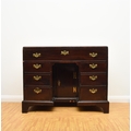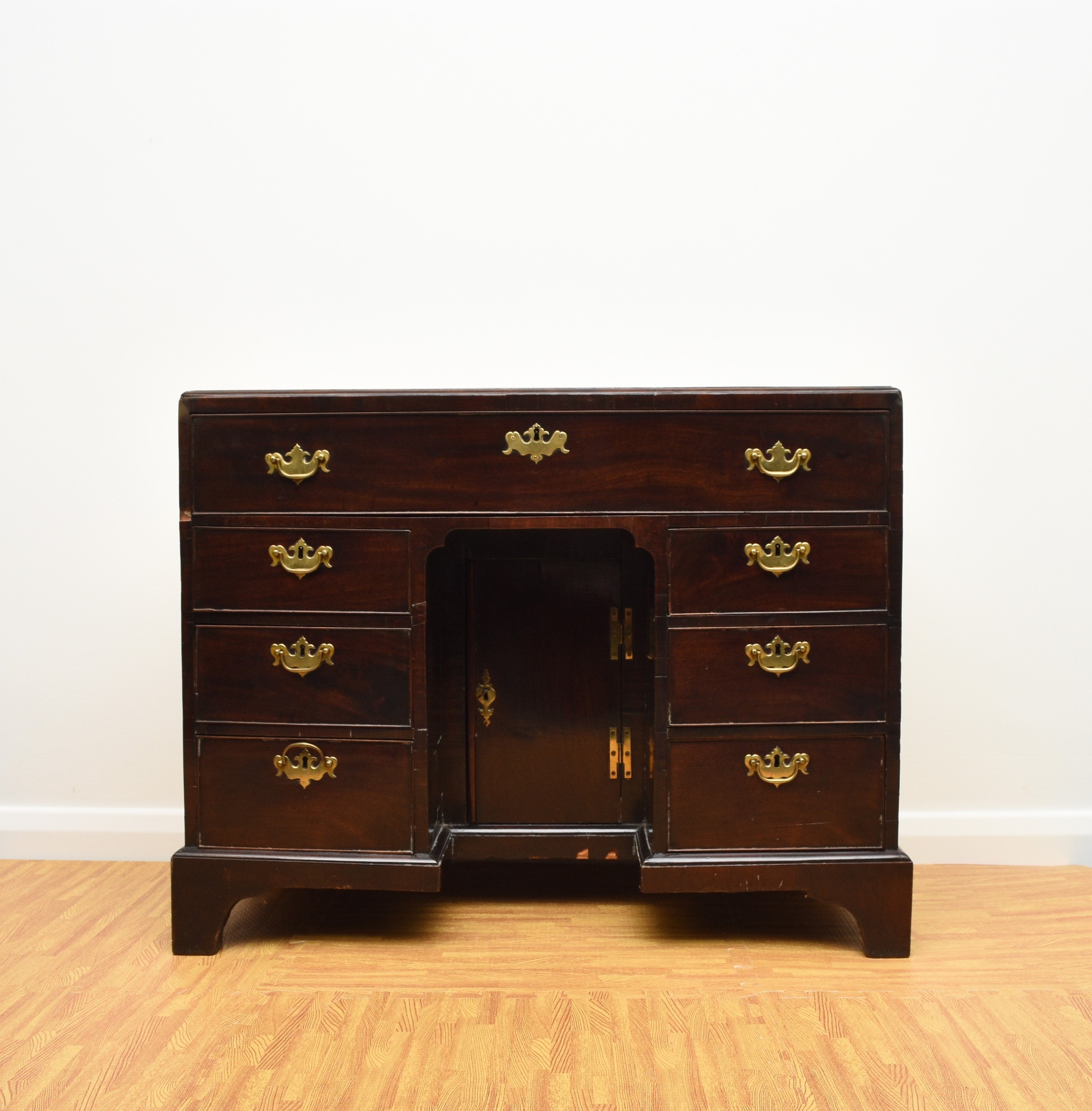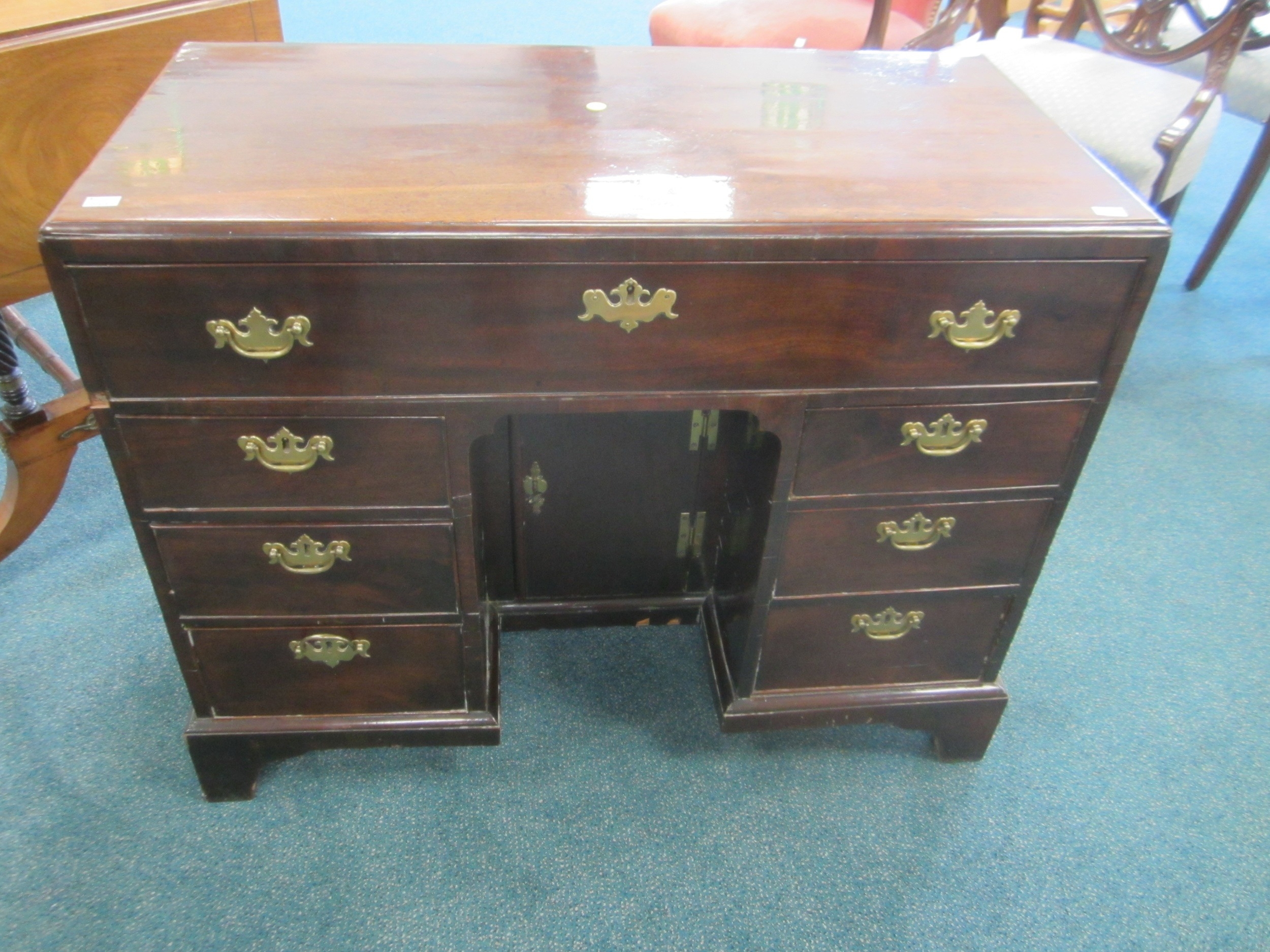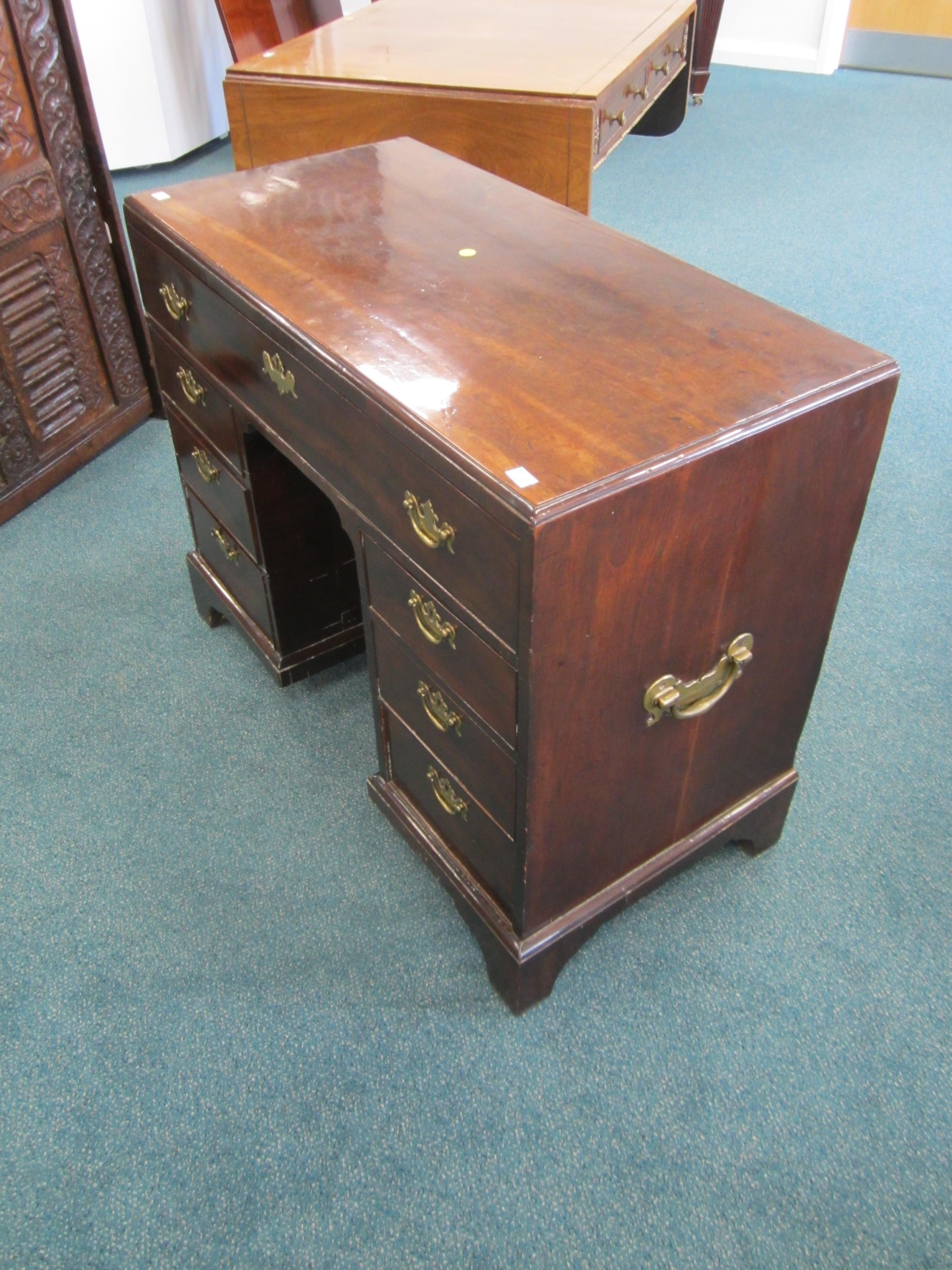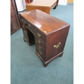 A George III mahogany veneered campaign type kneehole desk The moulded top above a long frieze drawer, above six short drawers and a recessed cupboard, raised on bracket feet and with brass carrying handles to the sides. 92cm wide x 45cm deep x 73cm high Wirswall Hall, Whitchurch, Shropshire Condition:Generally good and structurally sound. Minor cosmetic marks consistent with age and use. Some small old stains to the top. Veneer patch along back edge of top. Small veneer losses to the base beneath the cupboard. Fine veneer splits inside the kneehole and around the base supports. No evidence of worm.