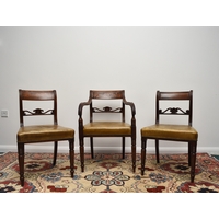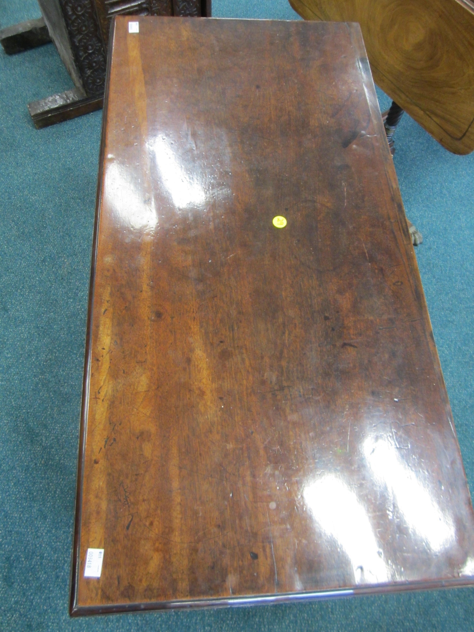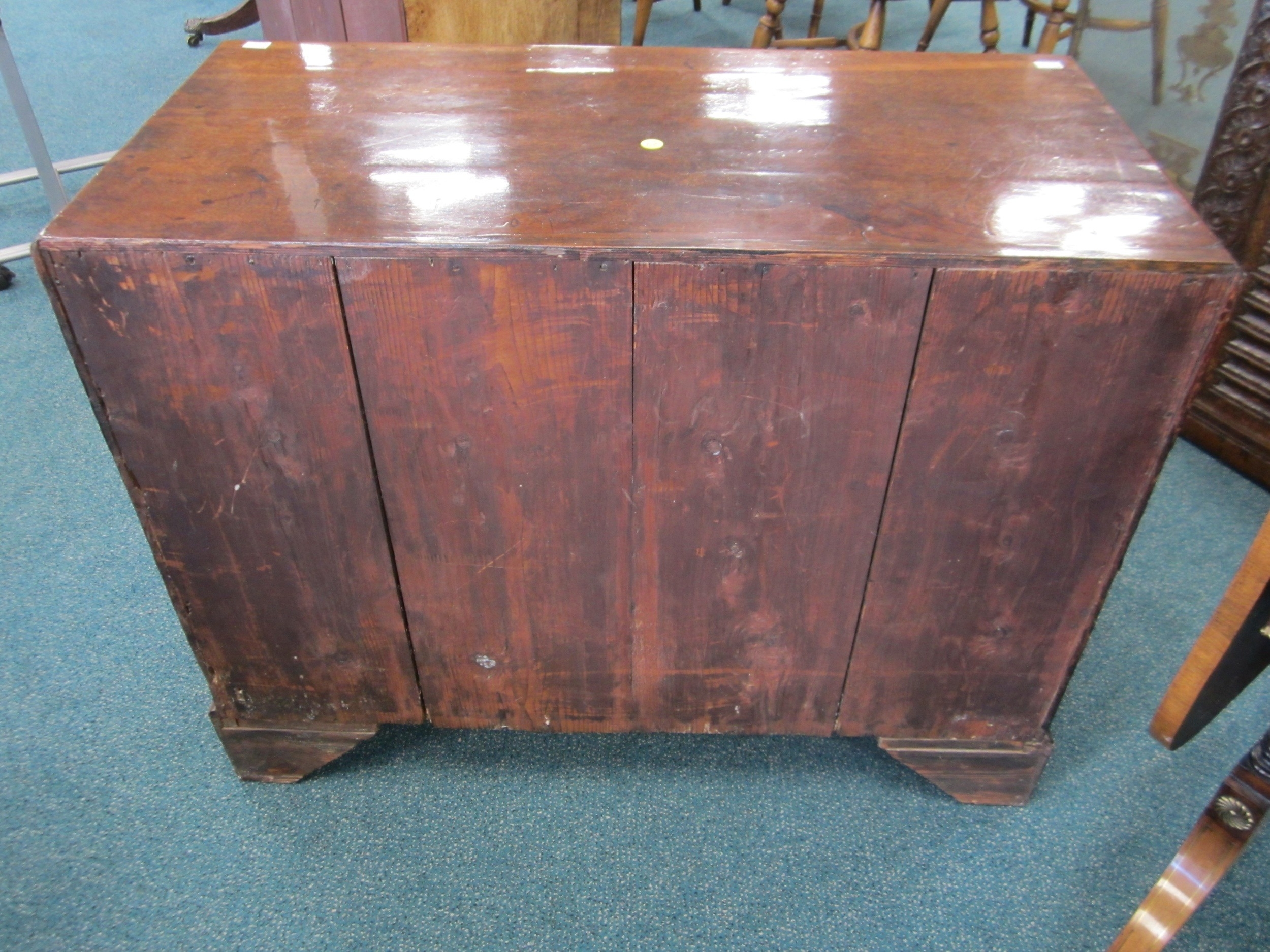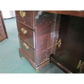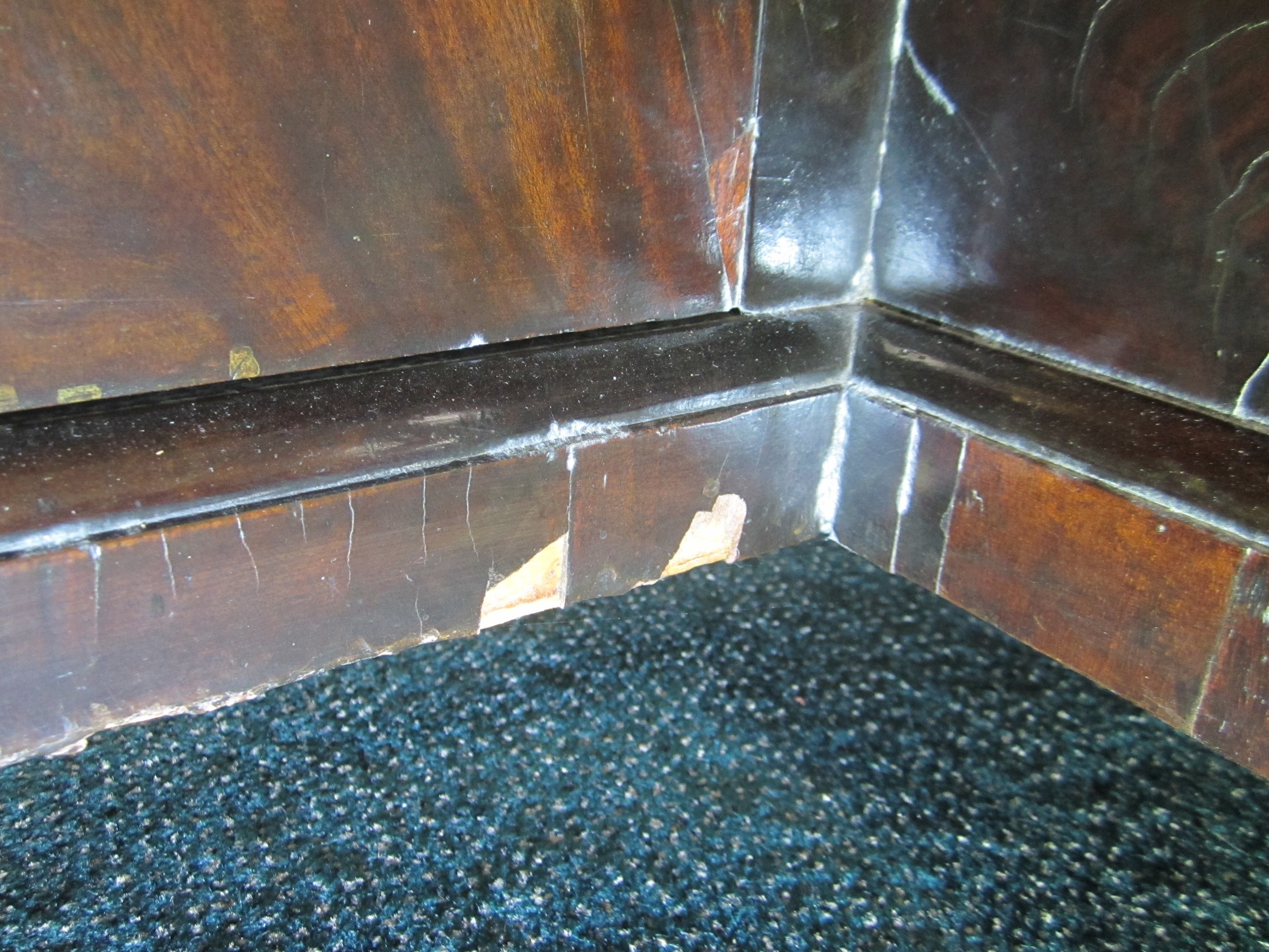 A George III mahogany veneered campaign type kneehole desk The moulded top above a long frieze drawer, above six short drawers and a recessed cupboard, raised on bracket feet and with brass carrying handles to the sides. 92cm wide x 45cm deep x 73cm high Wirswall Hall, Whitchurch, Shropshire Condition:Generally good and structurally sound. Minor cosmetic marks consistent with age and use. Some small old stains to the top. Veneer patch along back edge of top. Small veneer losses to the base beneath the cupboard. Fine veneer splits inside the kneehole and around the base supports. No evidence of worm.