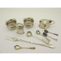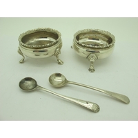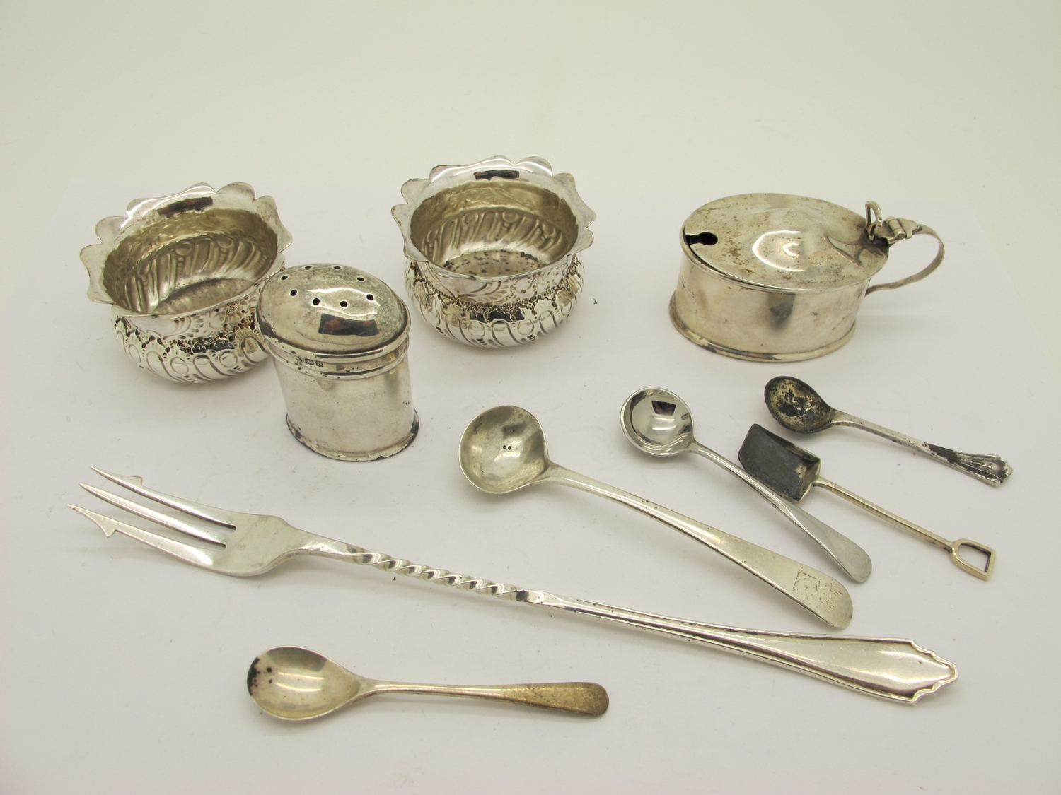 A Pair of Hallmarked Silver Salts, Sheffield 1893, each foliate decorated; together with a plain oval hallmarked silver lidded mustard and matching pepperette, a hallmarked silver pickle fork, novelty shovel salt spoon, etc.