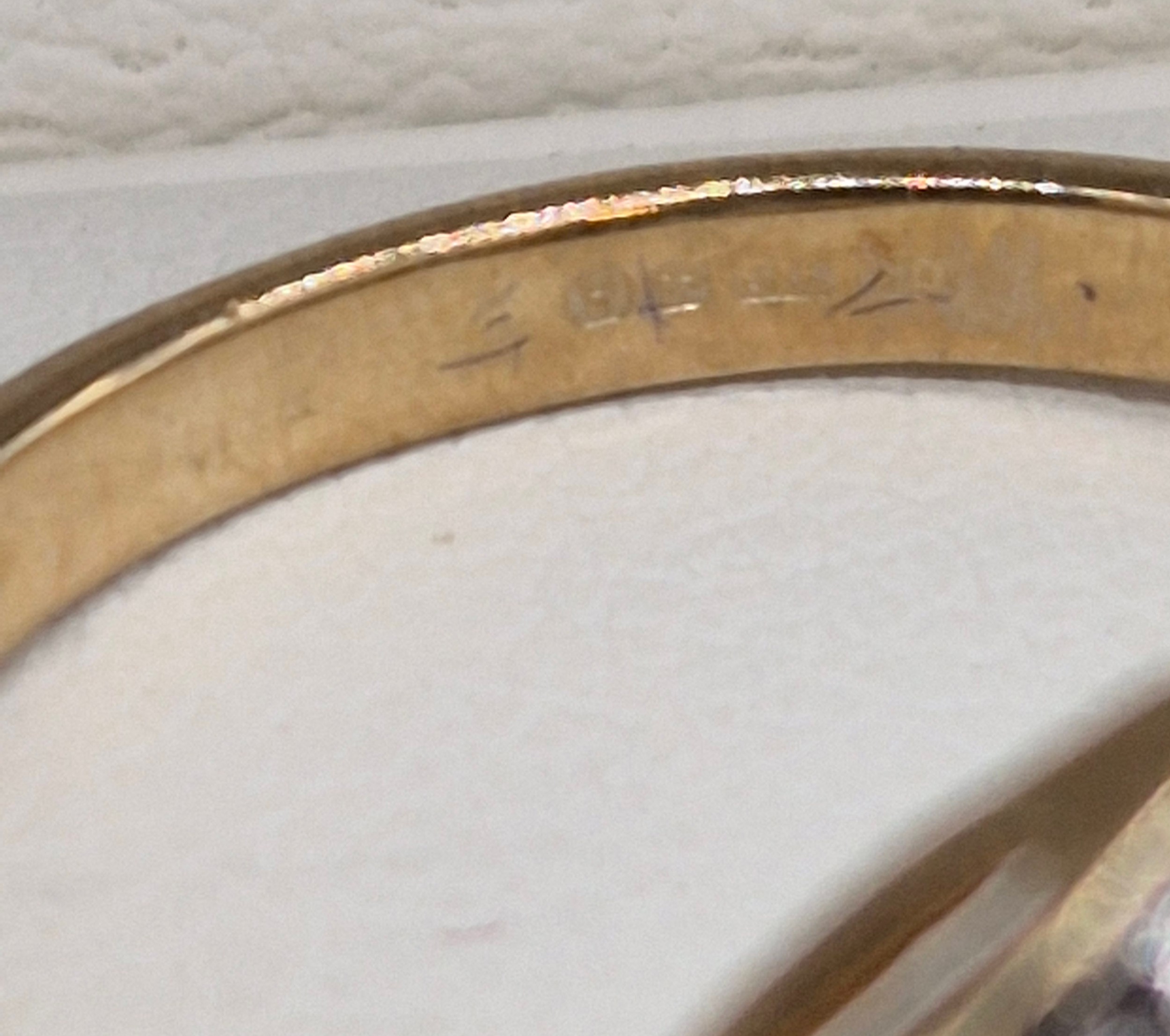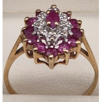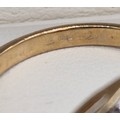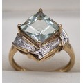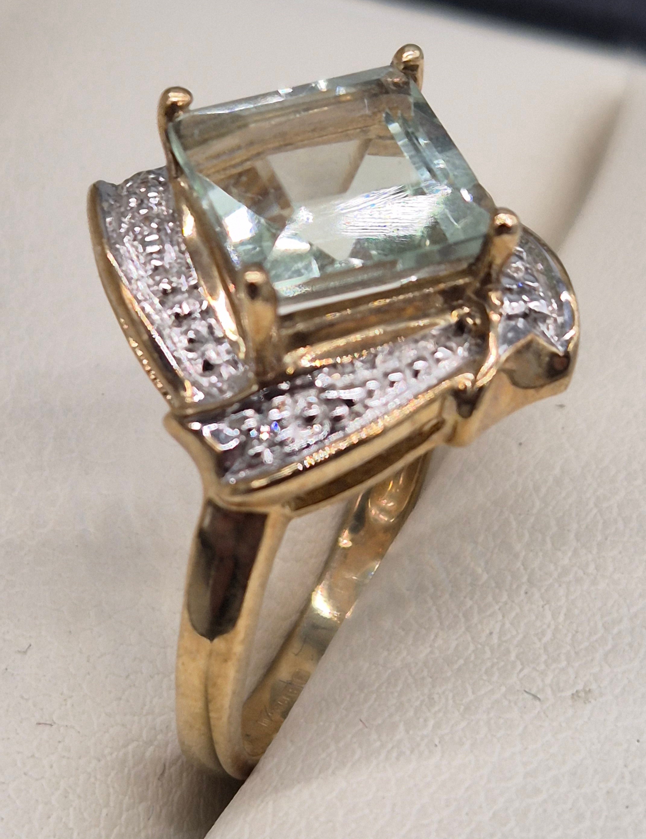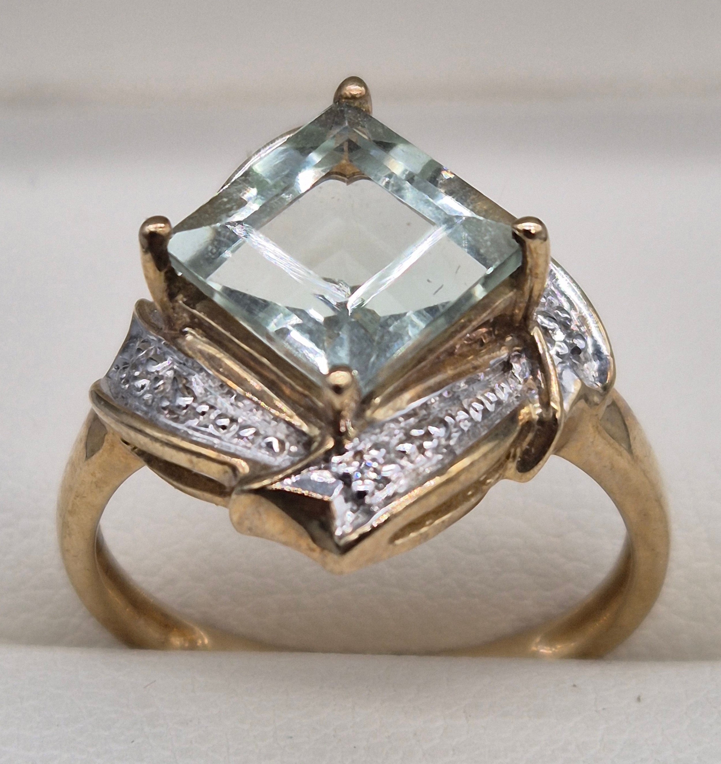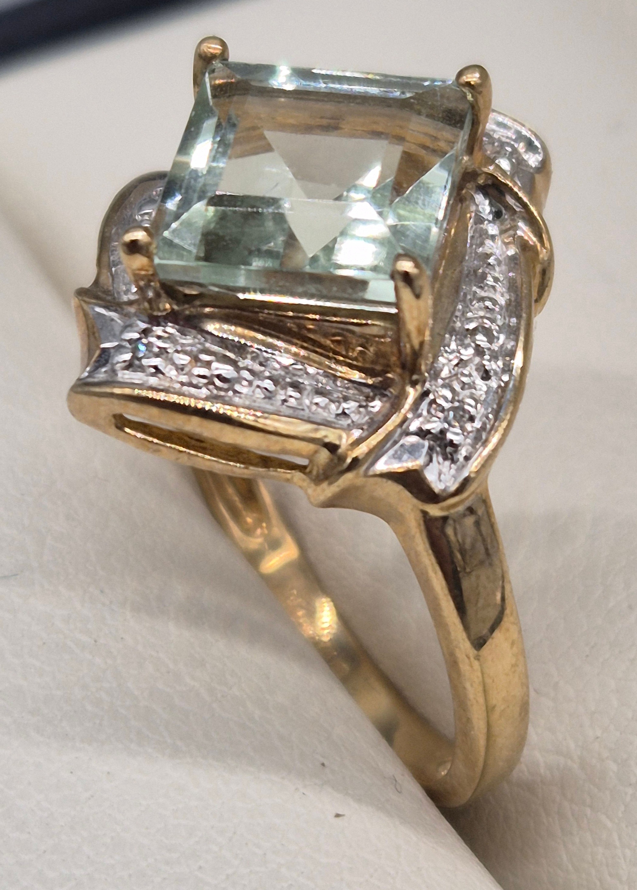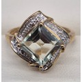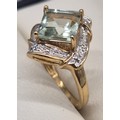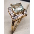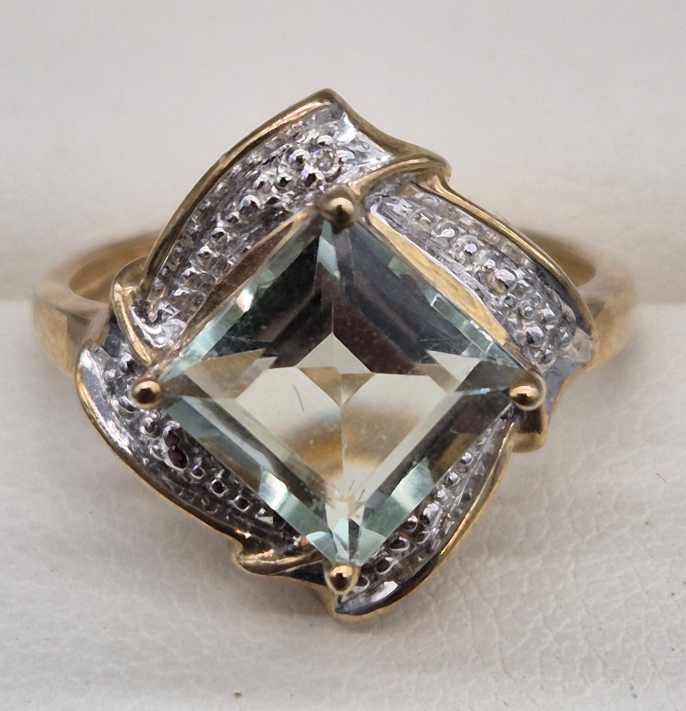 9ct yellow gold, green amethyst and diamond stone ring. 3.44grams. Ring size N.