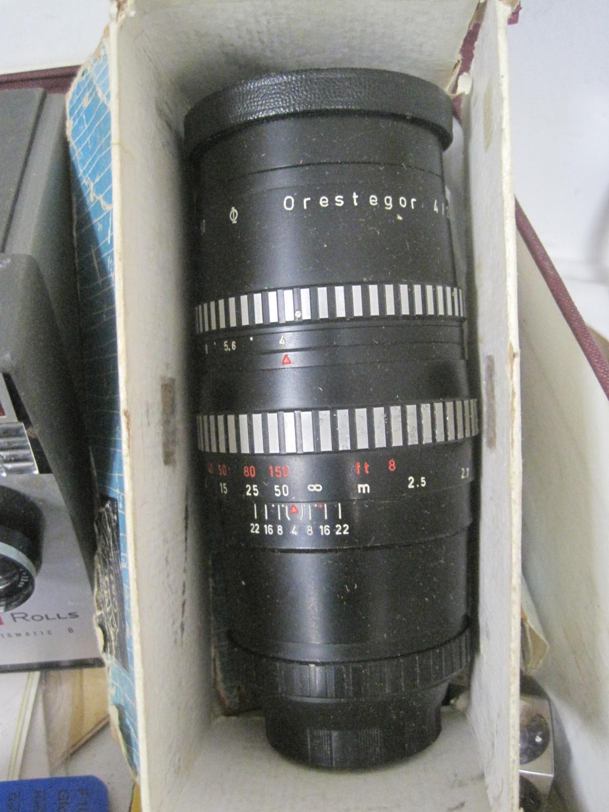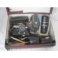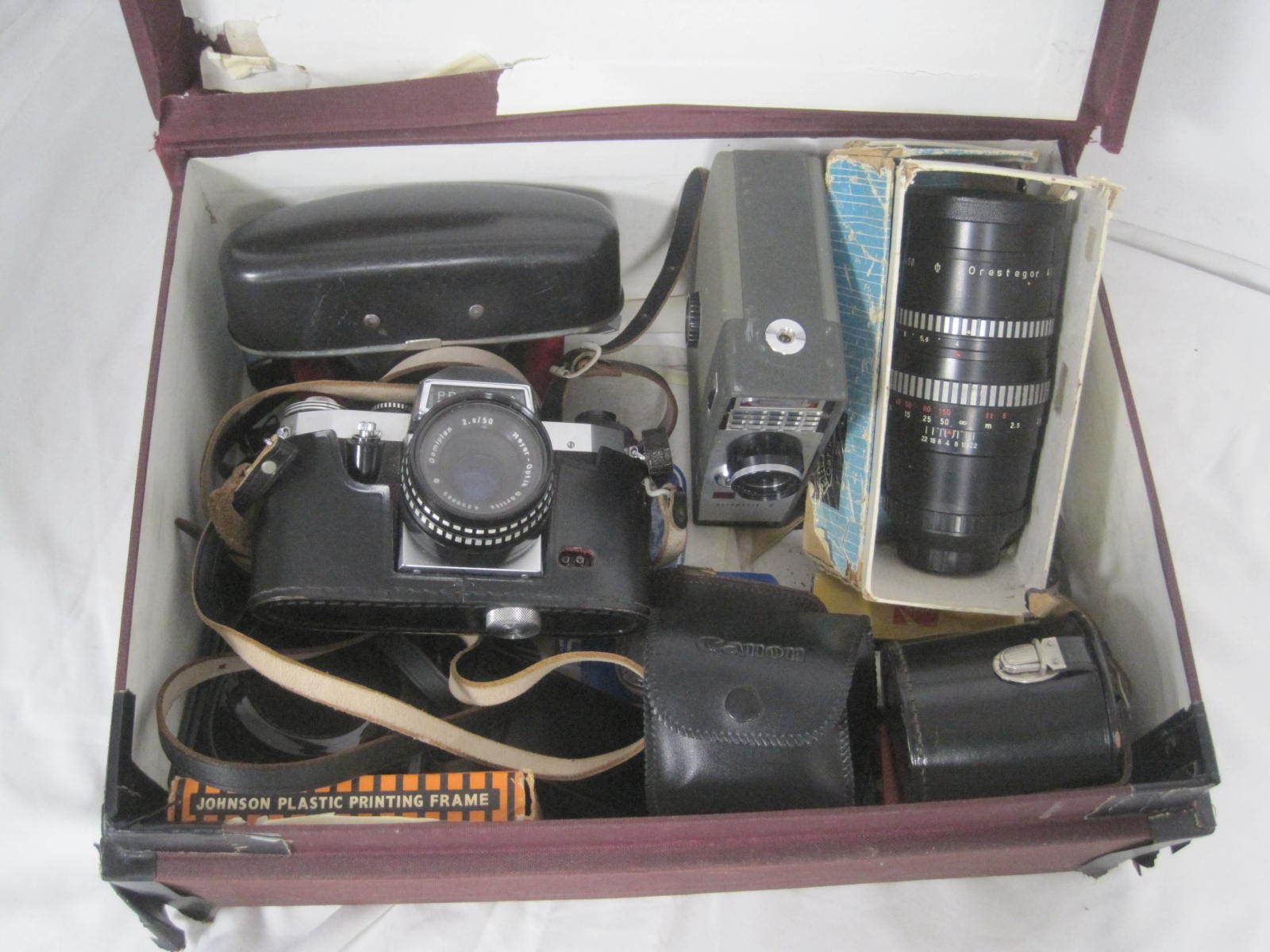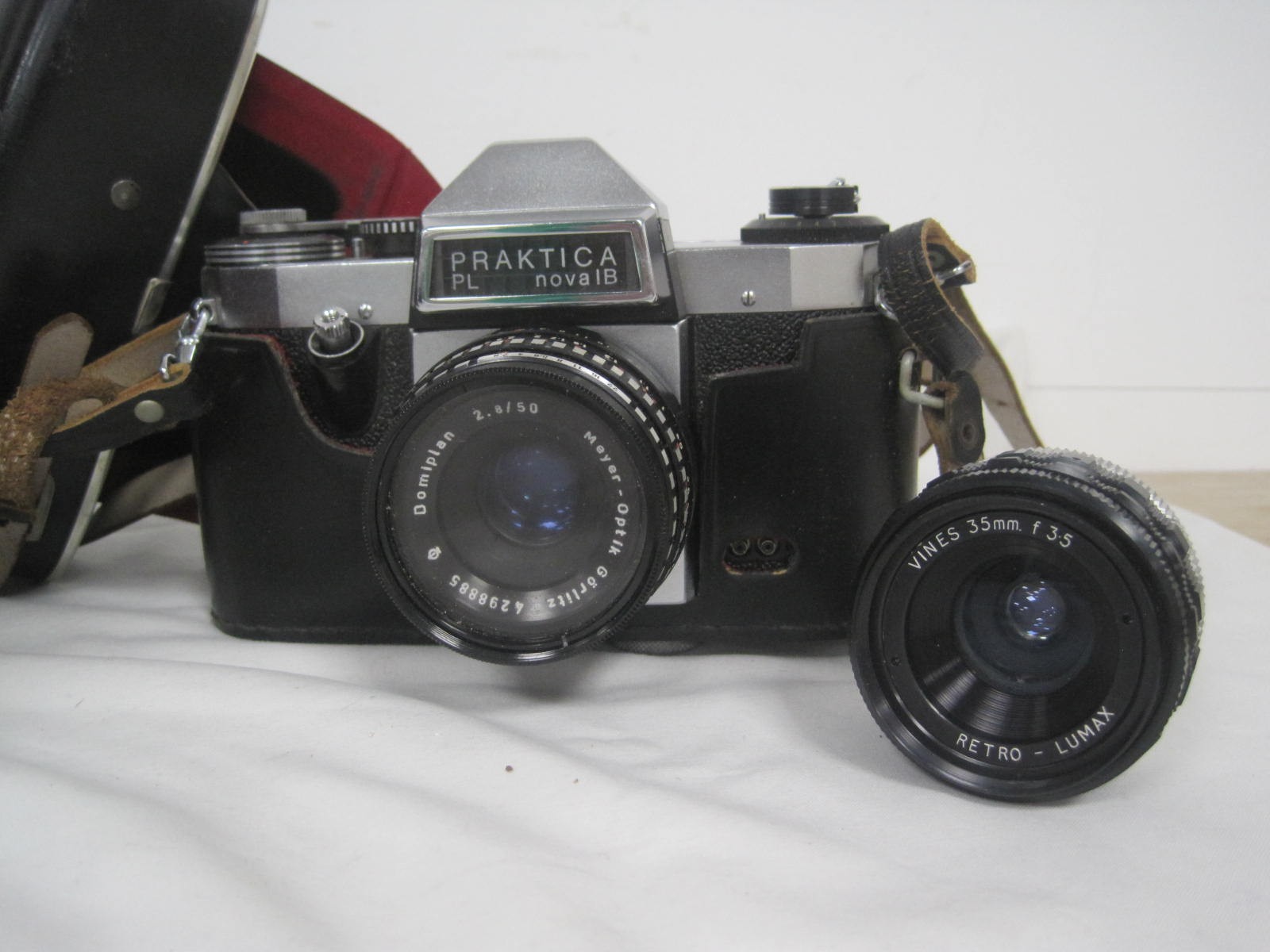 A Praktika Noval B SLR 35mm Camera, cased, various assorted lenses for the same, a Rolls Automatic 8 cine camera and various photographic accessories.
