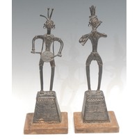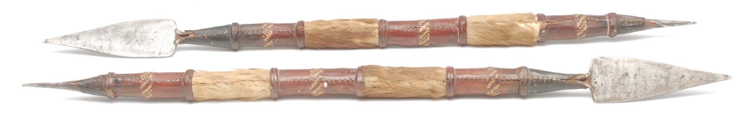 Tribal Art - a pair of early 20th century Maassai lion hunting spears, alternating panels of leather and caribou skin, double edged, each 69cm long, Kenya (2)