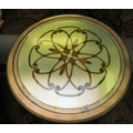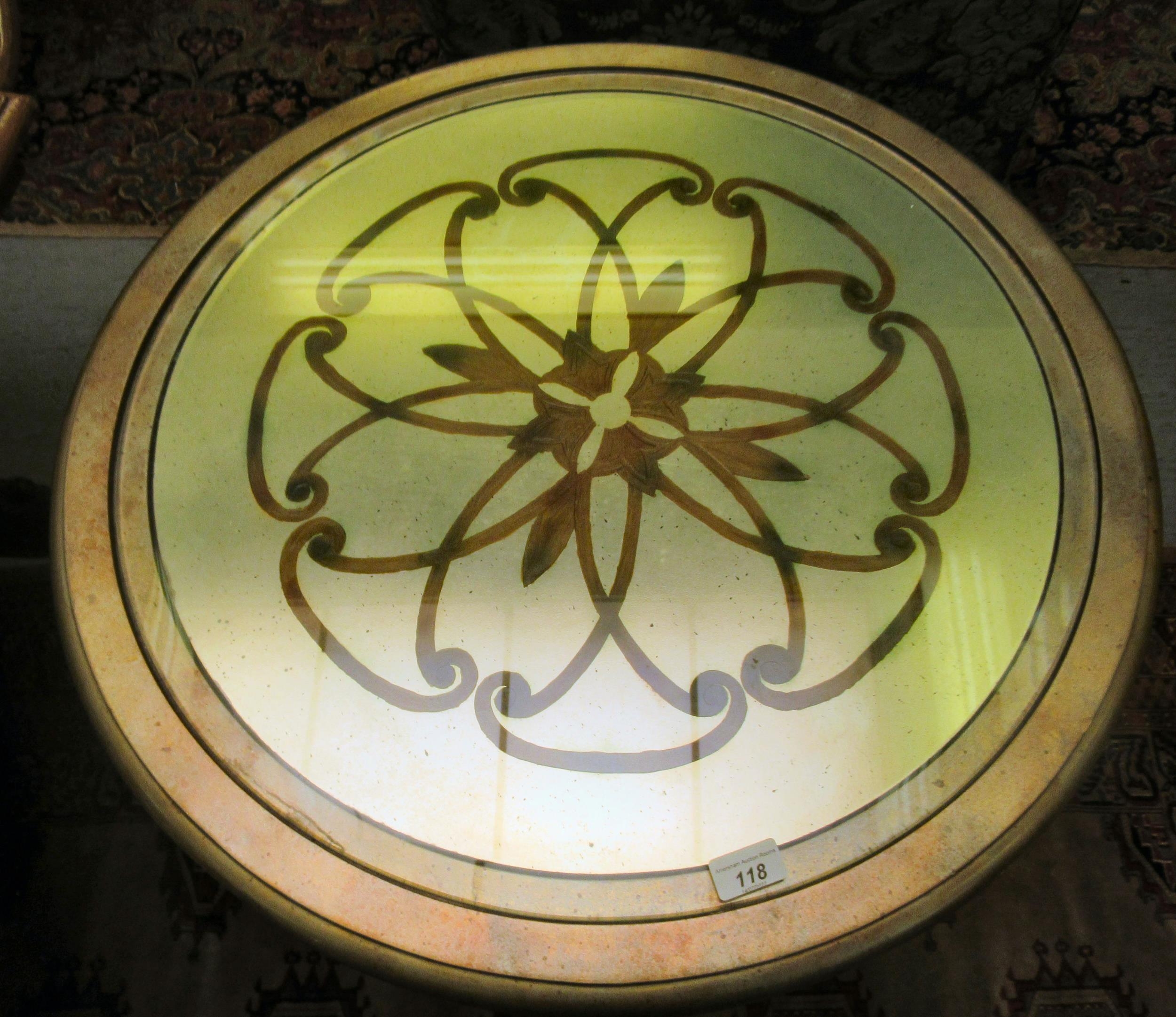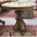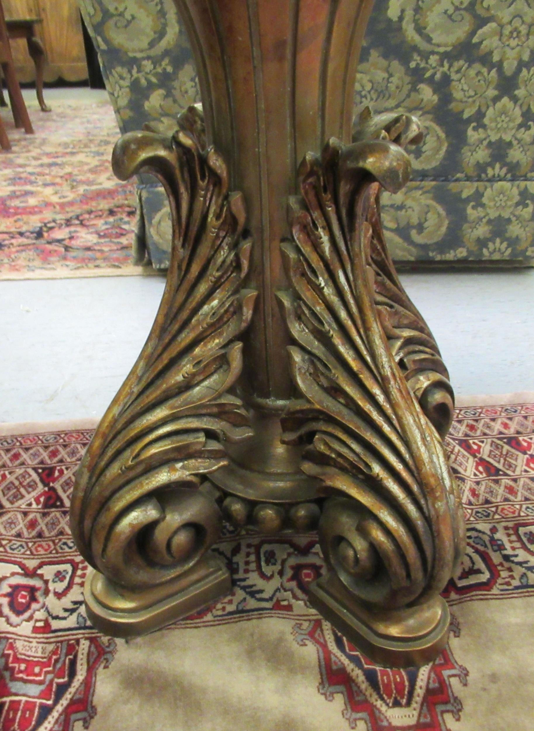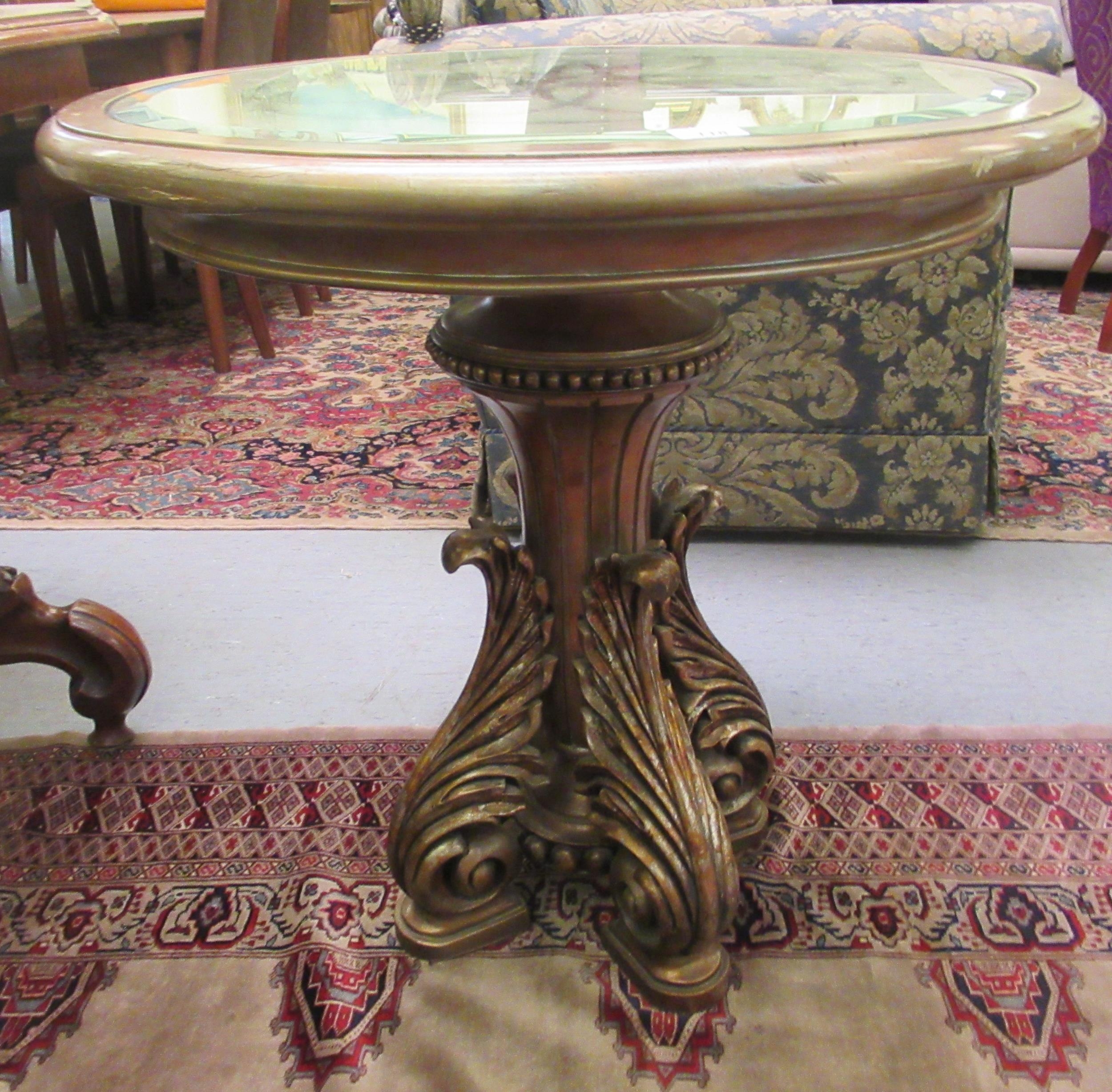 A modern antique finished composition pedestal centre table, the overpainted and partially mirrored top raised on a foliate and C-scroll carved columns 28"h 28"dia