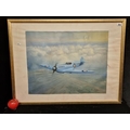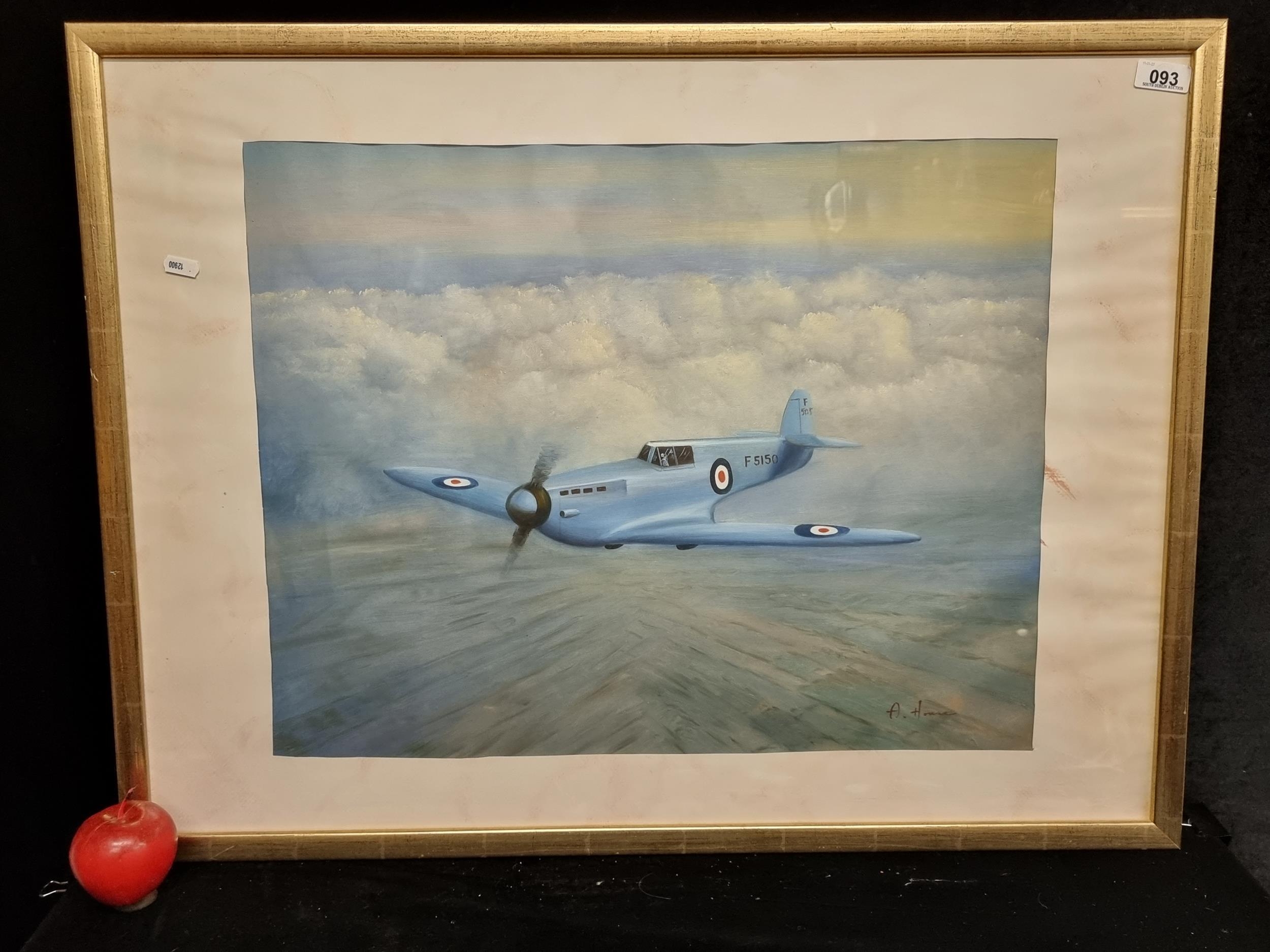 An original vintage oil on canvas painting showing a spitfire in flight, signed indistinctly bottom right. Housed in a gilt frame.