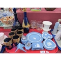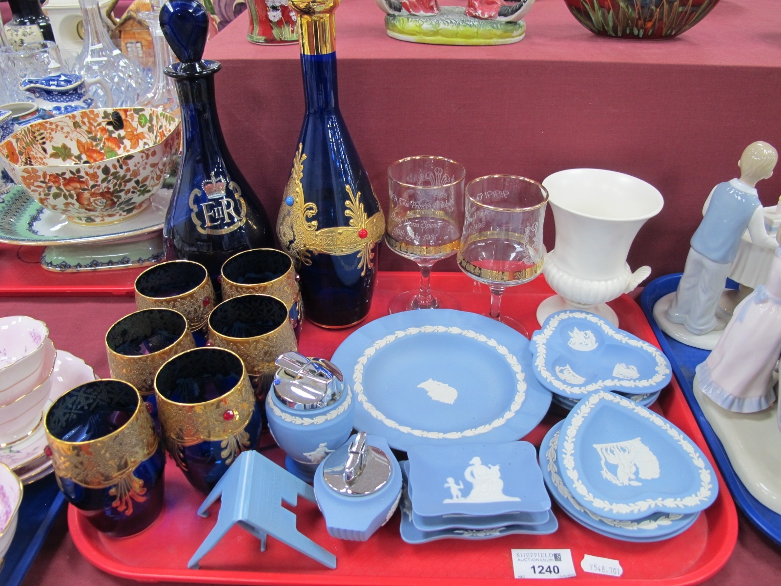 Wedgwood Powder Blue Jasper Ware, blue glass overlaid drinks set and Royalty decantner etc:- One Tray.