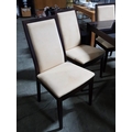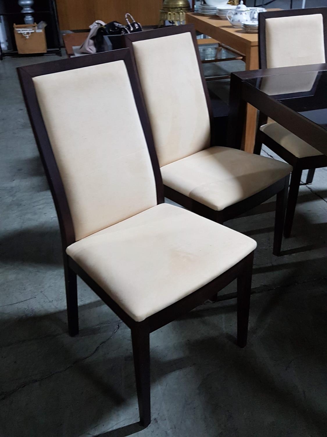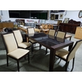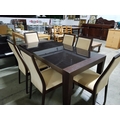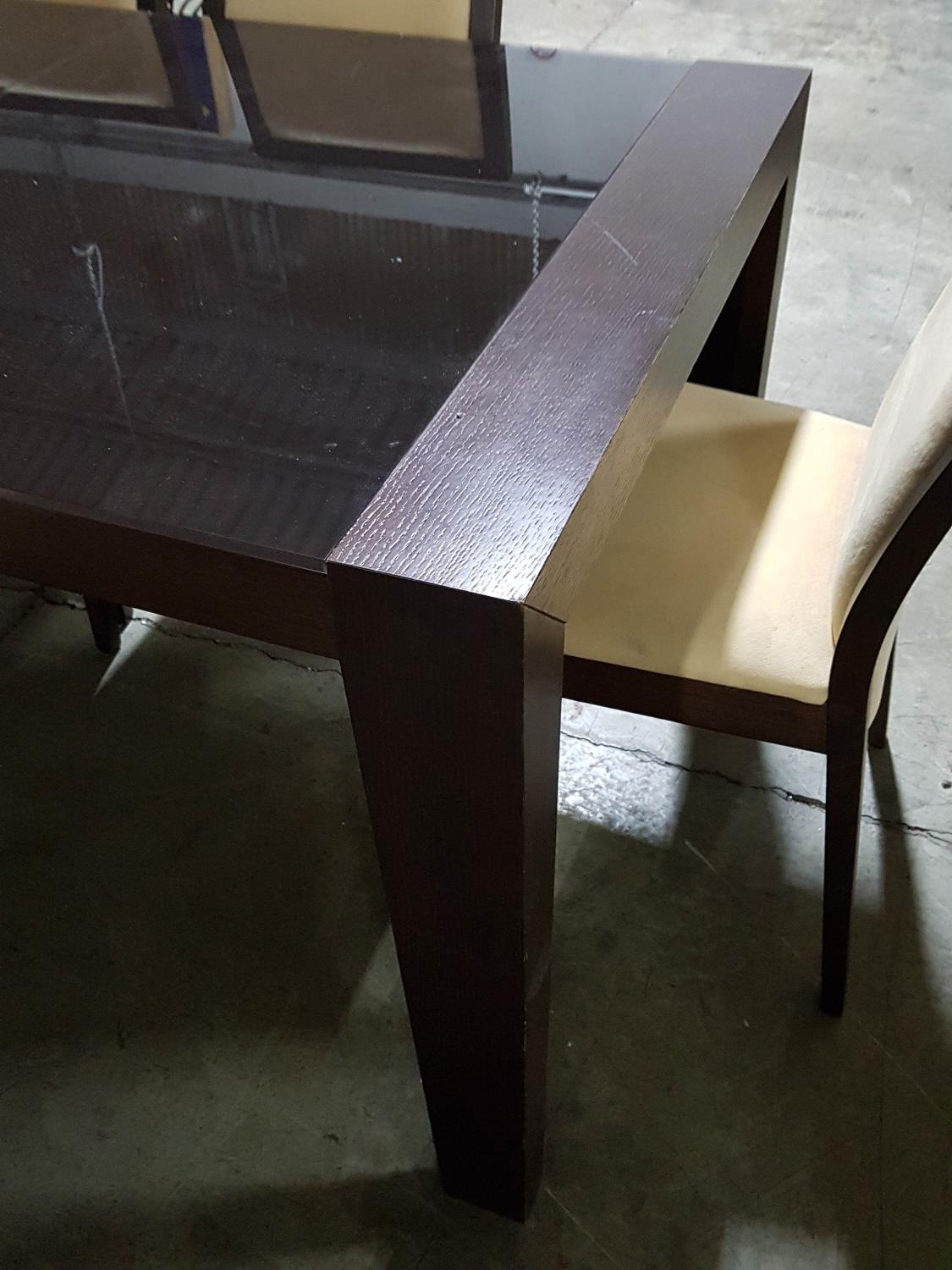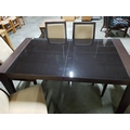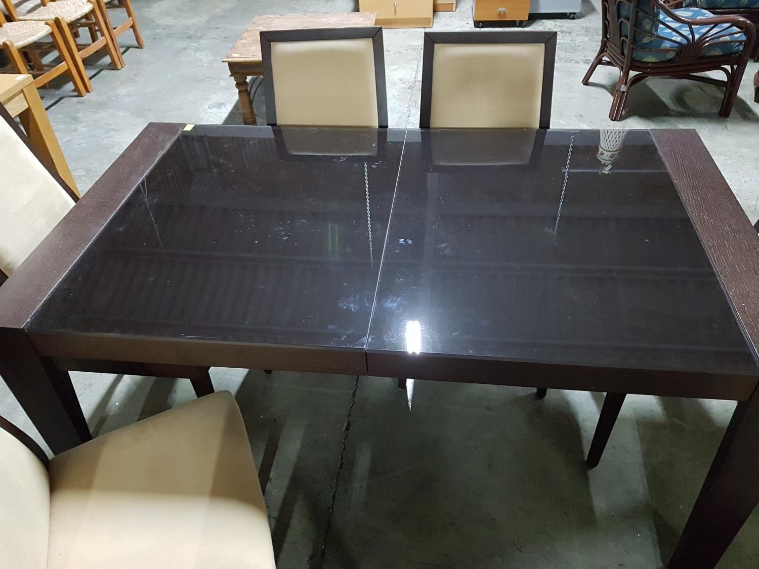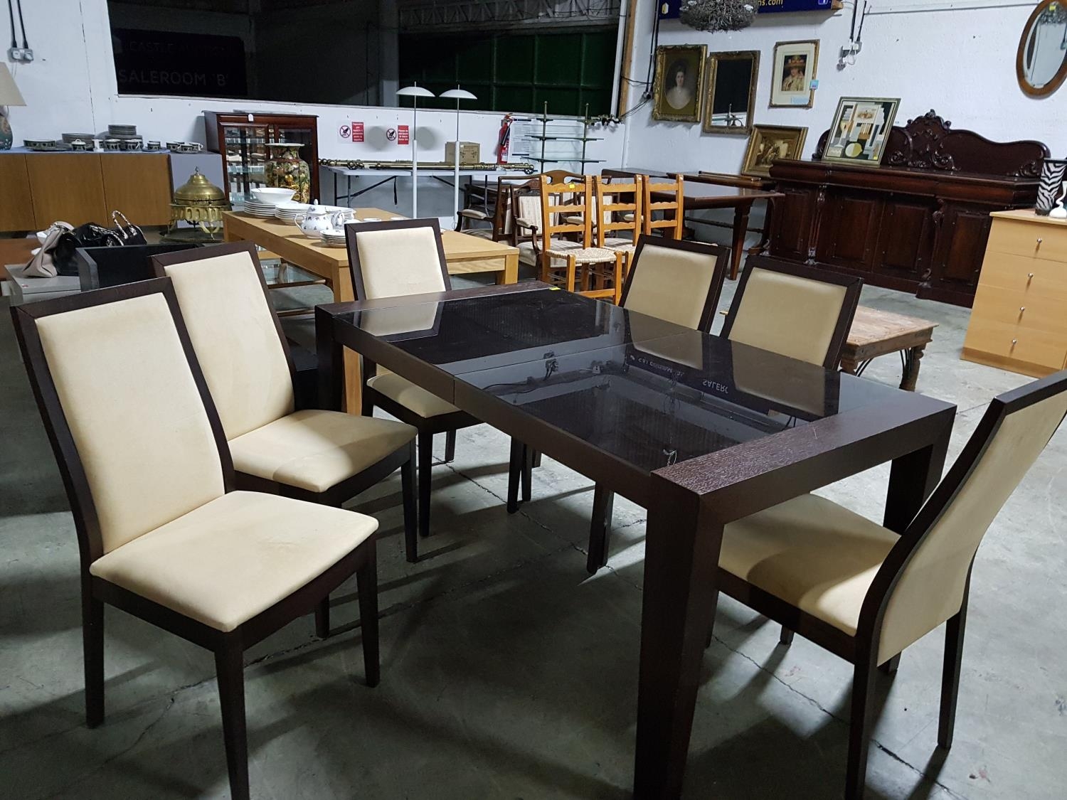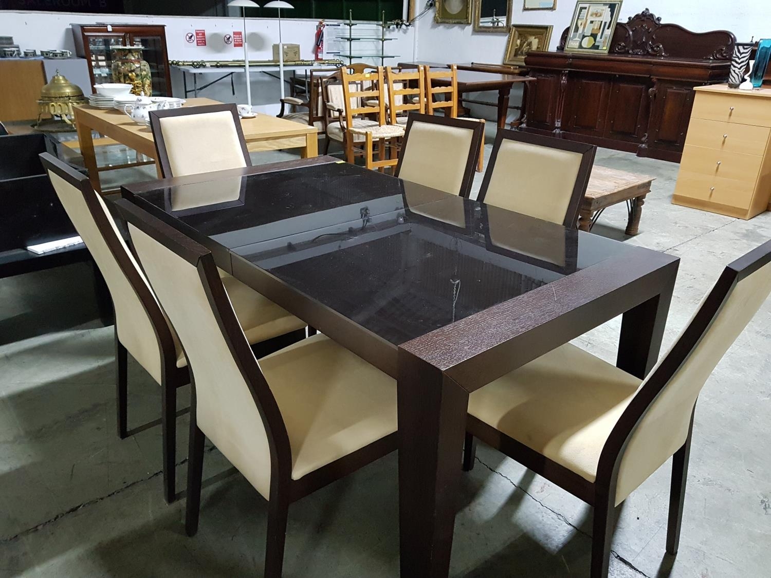 Modern Black Glass Top Extendable Dinning Table Together with 6 x Matching Dinning Chairs with Beige Fabric Seats