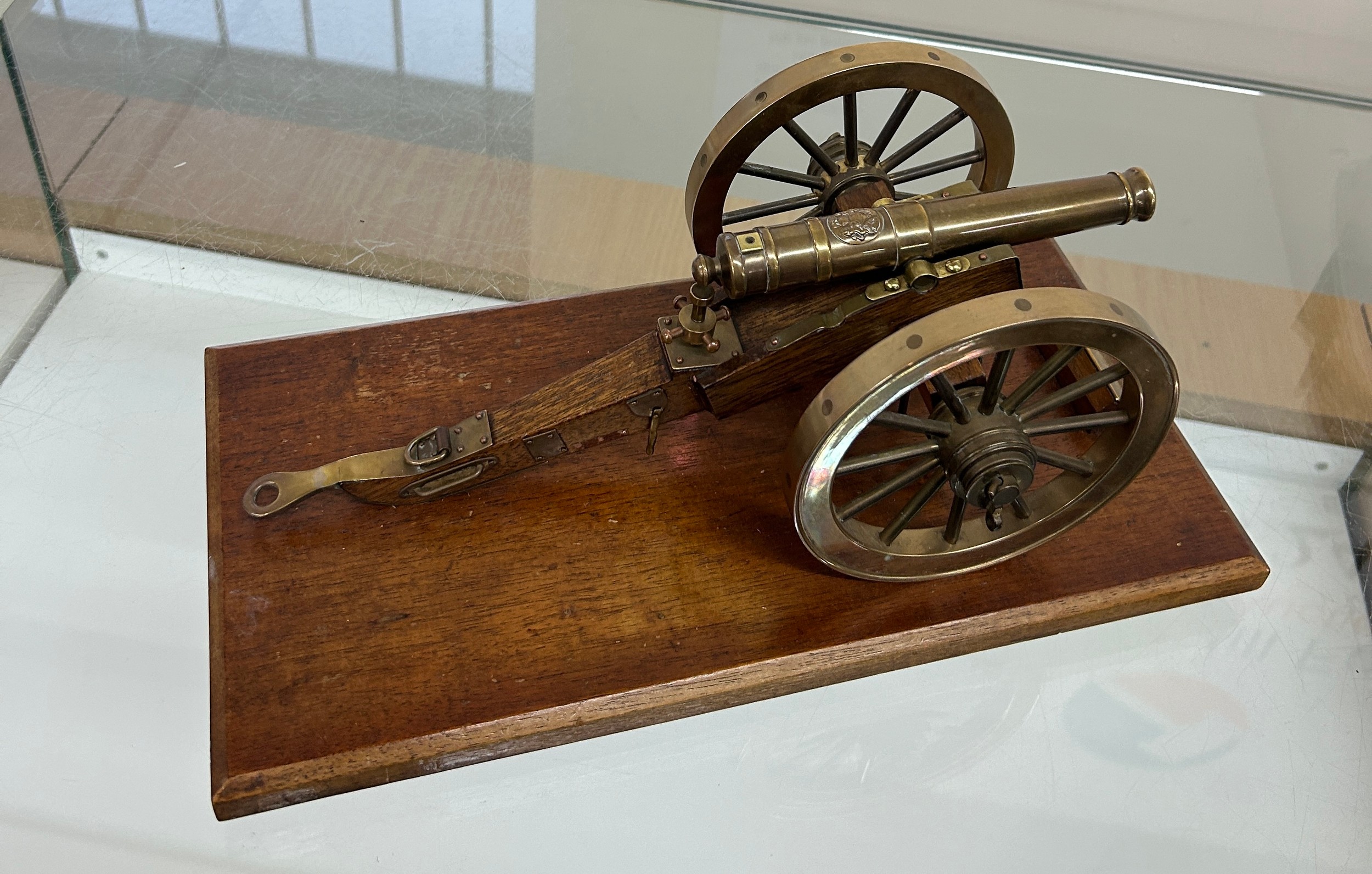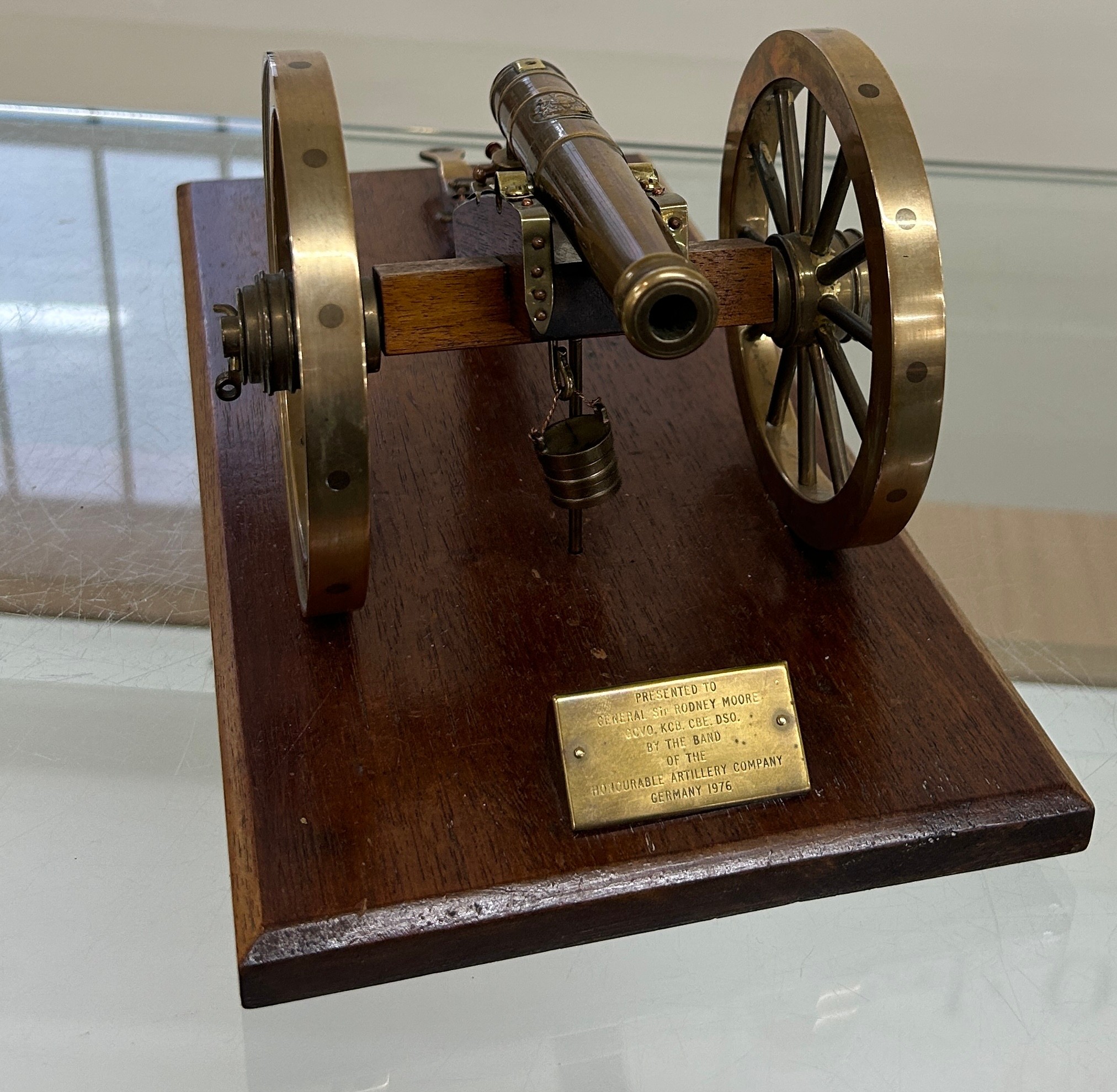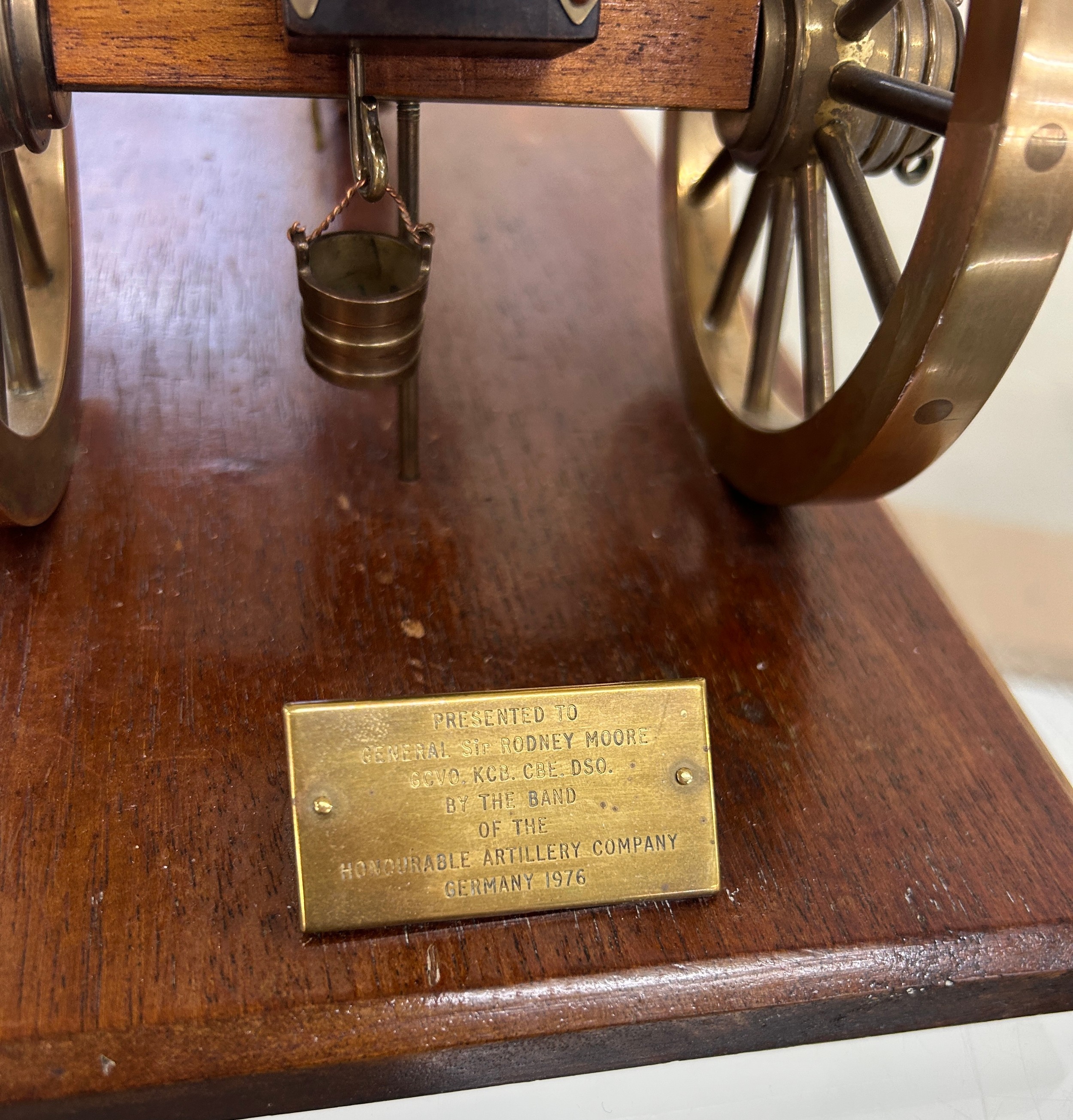 Royal Artillery model of a field gun of Waterloo/Napoleonic wars. Possibly 6 or 9 pounder. ' Presented to General Sir Rodney Moore by Honourable Artillery company- Germany 1976' measures approximately: 14 inches wide x 7 long