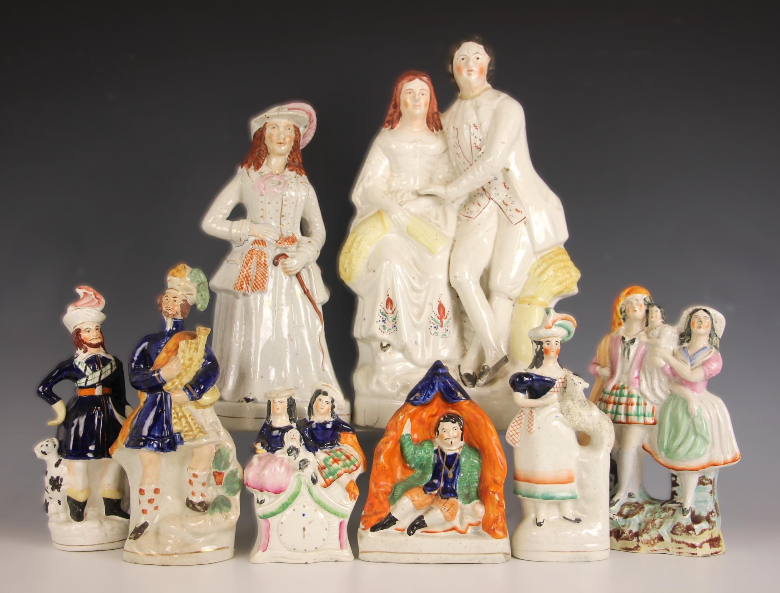 A Victorian Staffordshire pottery D1279 'Unknown Actress' or 'Miss Whiplash' figure, mid to late 19th century, 30cm high; with a Staffordshire figural group of large proportions modelled as a man and woman with wheat sheaves, 36cm high; and six Staffordshire flatback figures, to include David Garrick As Richard III, 16cm high, a Scotsman with bagpipes, 24cm high, and a huntsman with dog, 22.5cm high (8) (at fault)
