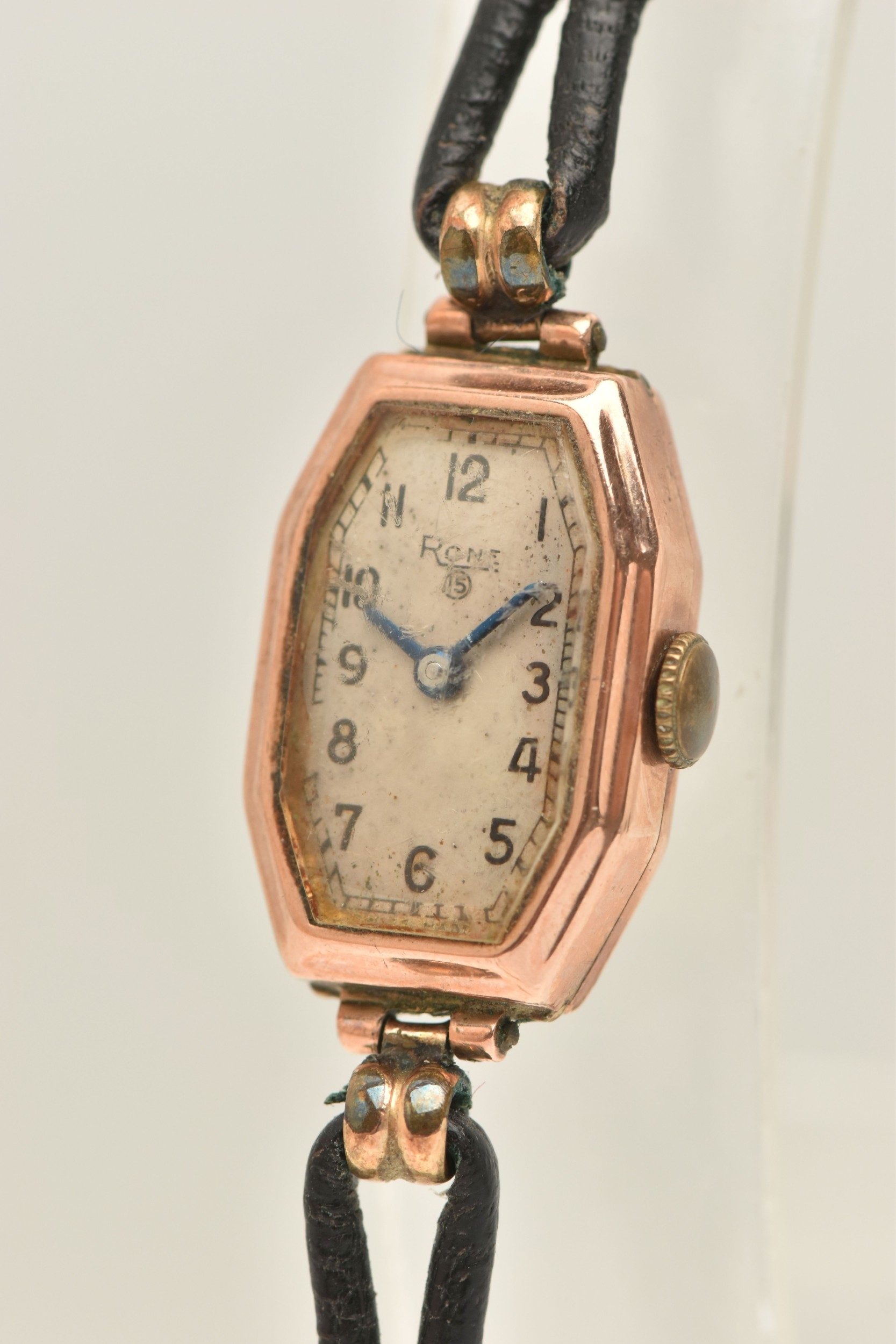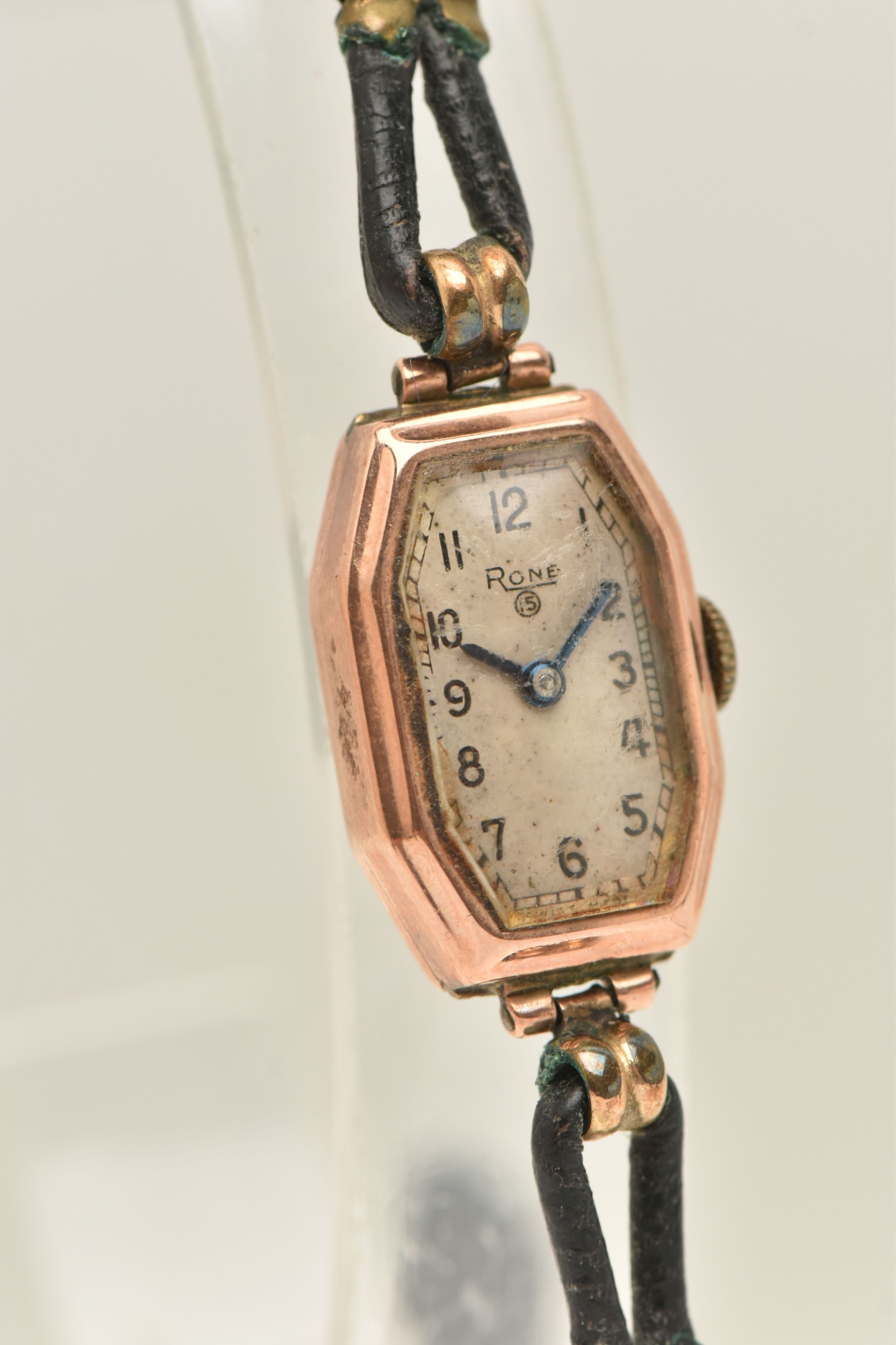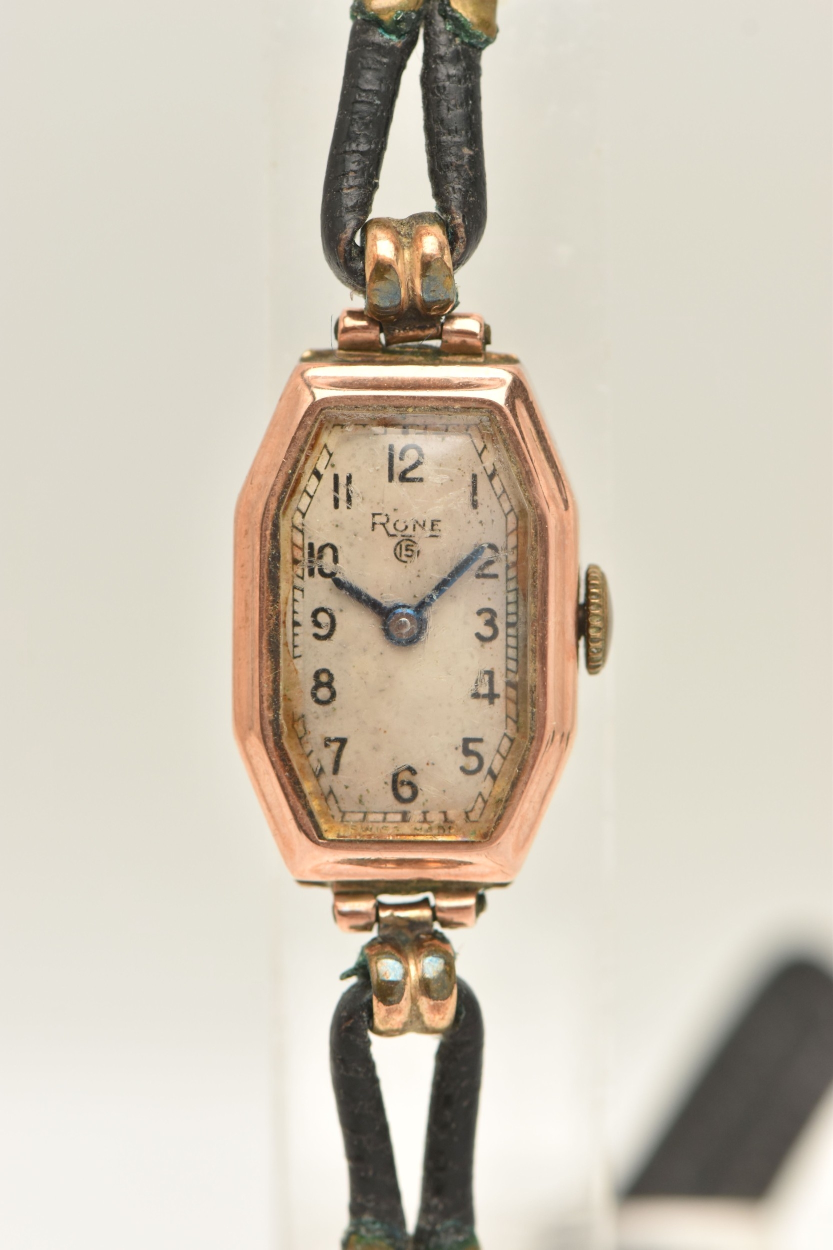 A LADIES 9CT ROSE GOLD WRISTWATCH, manual wind, rectangular silvered dial signed 'Rone', Arabic numerals, blue steel hands, inside case back hallmarked 9ct London, fitted with a black cordette strap and a base metal ardillon buckle (condition report: general wear, movement requires some attention, we cannot guarantee the working order of any watch)
