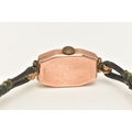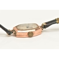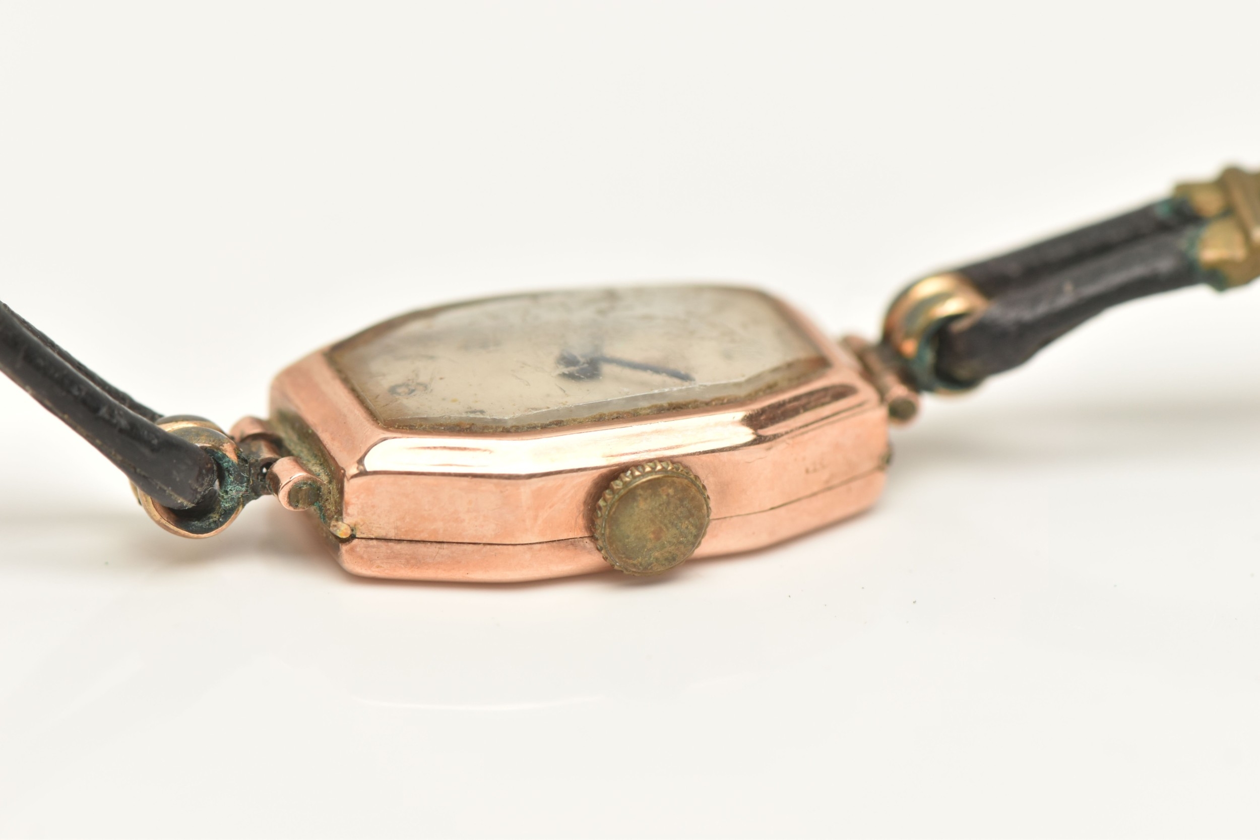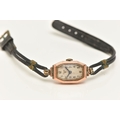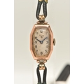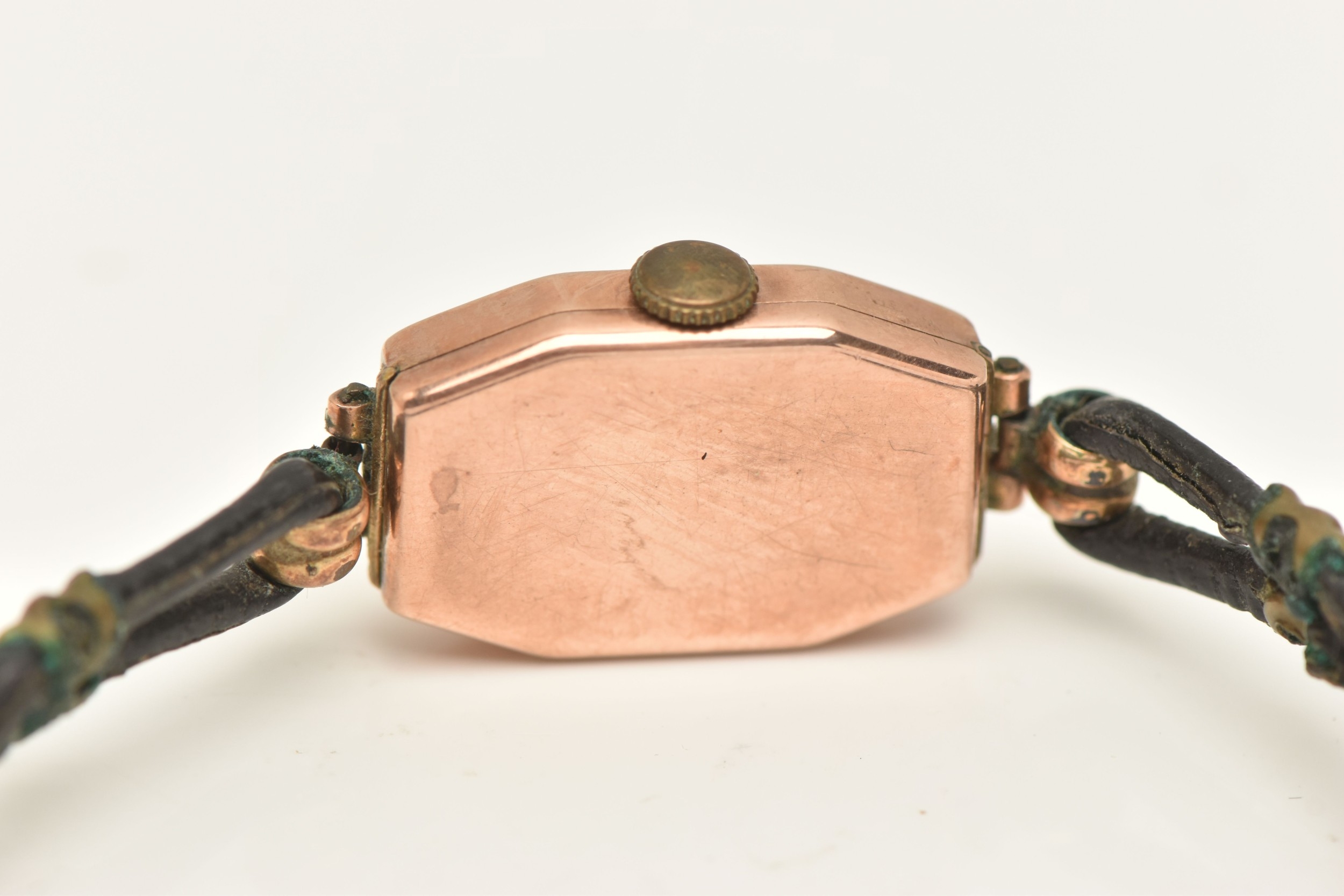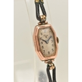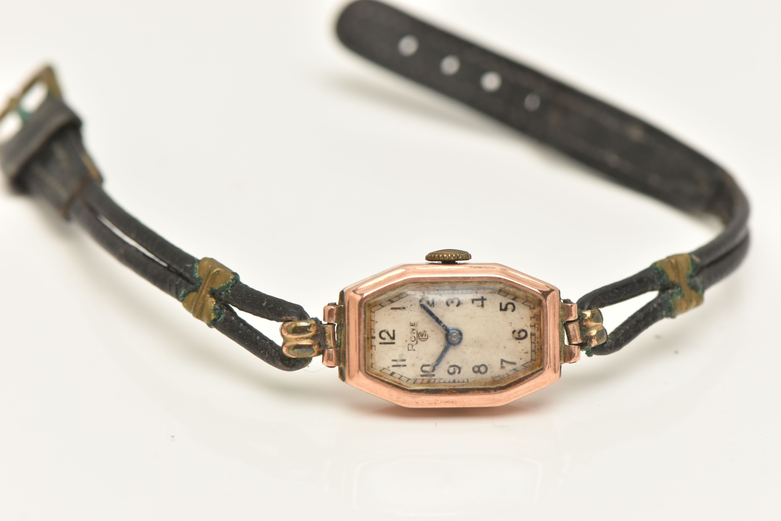 A LADIES 9CT ROSE GOLD WRISTWATCH, manual wind, rectangular silvered dial signed 'Rone', Arabic numerals, blue steel hands, inside case back hallmarked 9ct London, fitted with a black cordette strap and a base metal ardillon buckle (condition report: general wear, movement requires some attention, we cannot guarantee the working order of any watch)