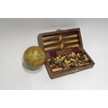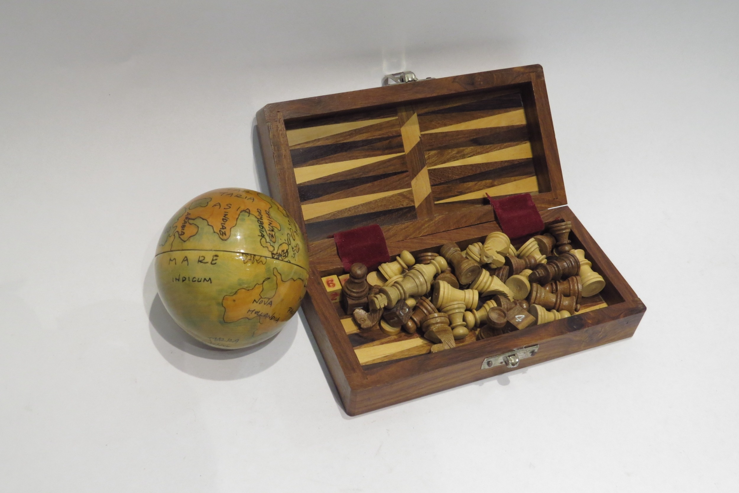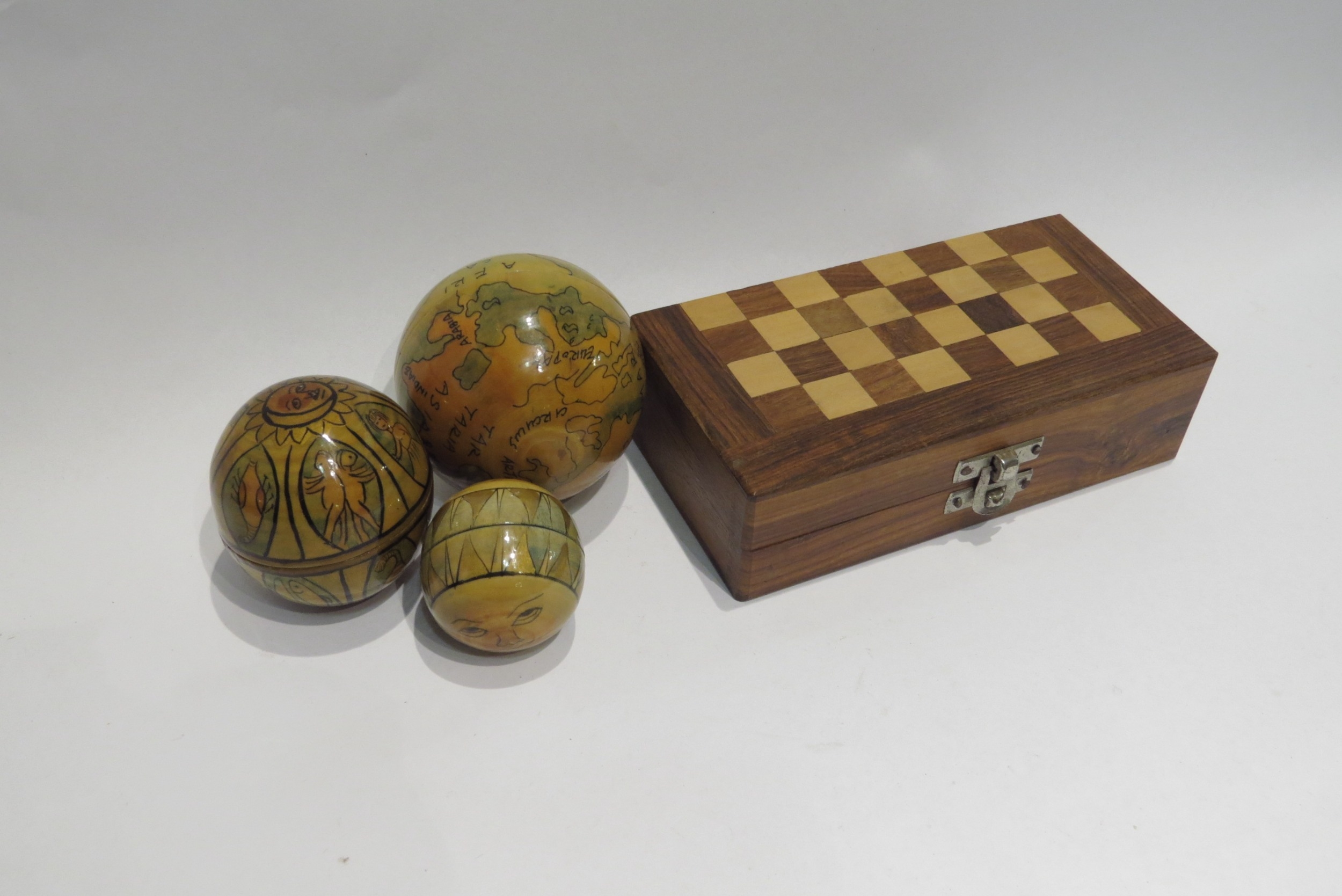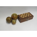 A small wooden travel chess set and a nesting globe set