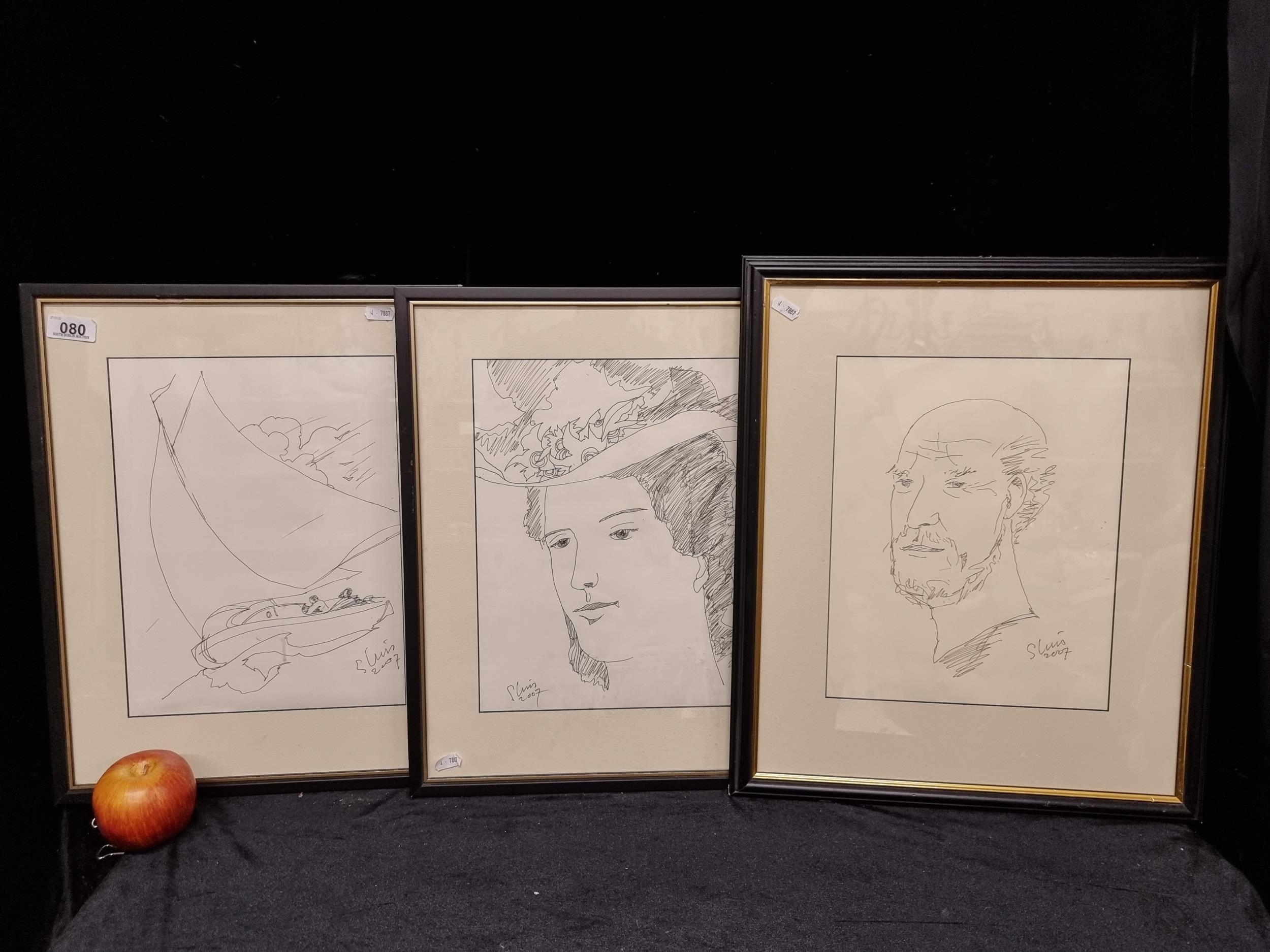 3 original ink line drawings by Dutch artist Piet Sluis (b.1929) featuring two portraits and a sailboat all dating to 2007. Sluis works in a naive style emblematic of the Dutch CoBrA movement of which he is an emissary. These gestural line drawings capture a lot of character and movement in a minimalist style. Drawings such as these are valued at €250 each in Sluis' extensive auction history.
