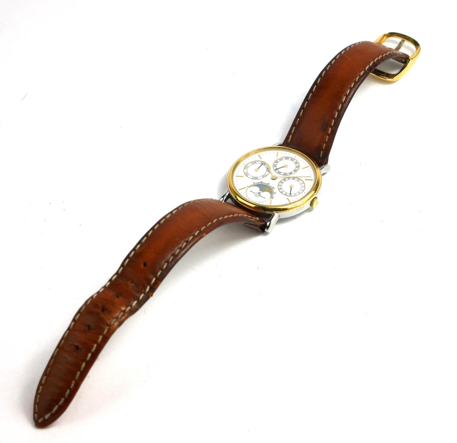 Having a circular white dial with four subsidiary dials including a moonphase dial, on a brown leather strap.
